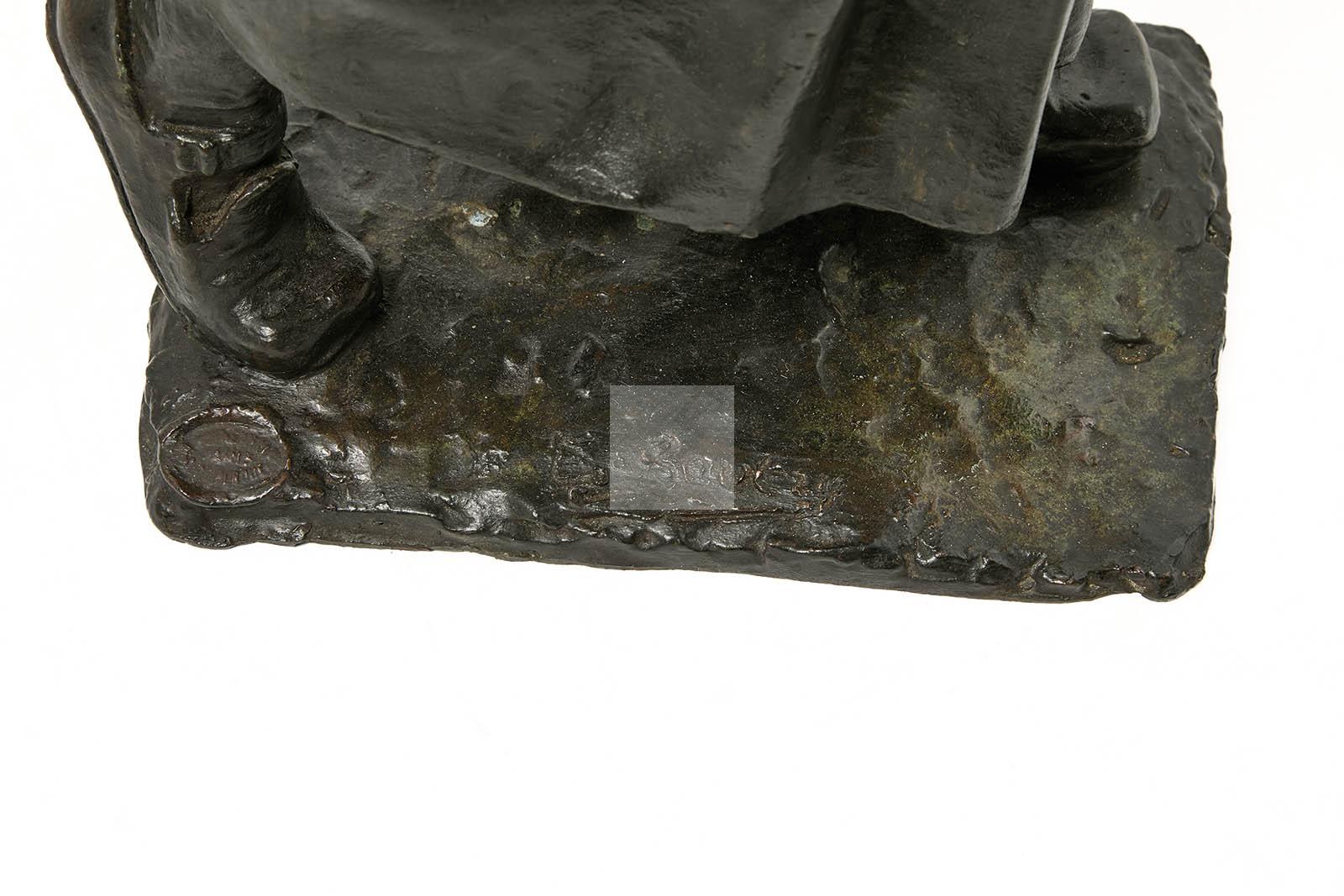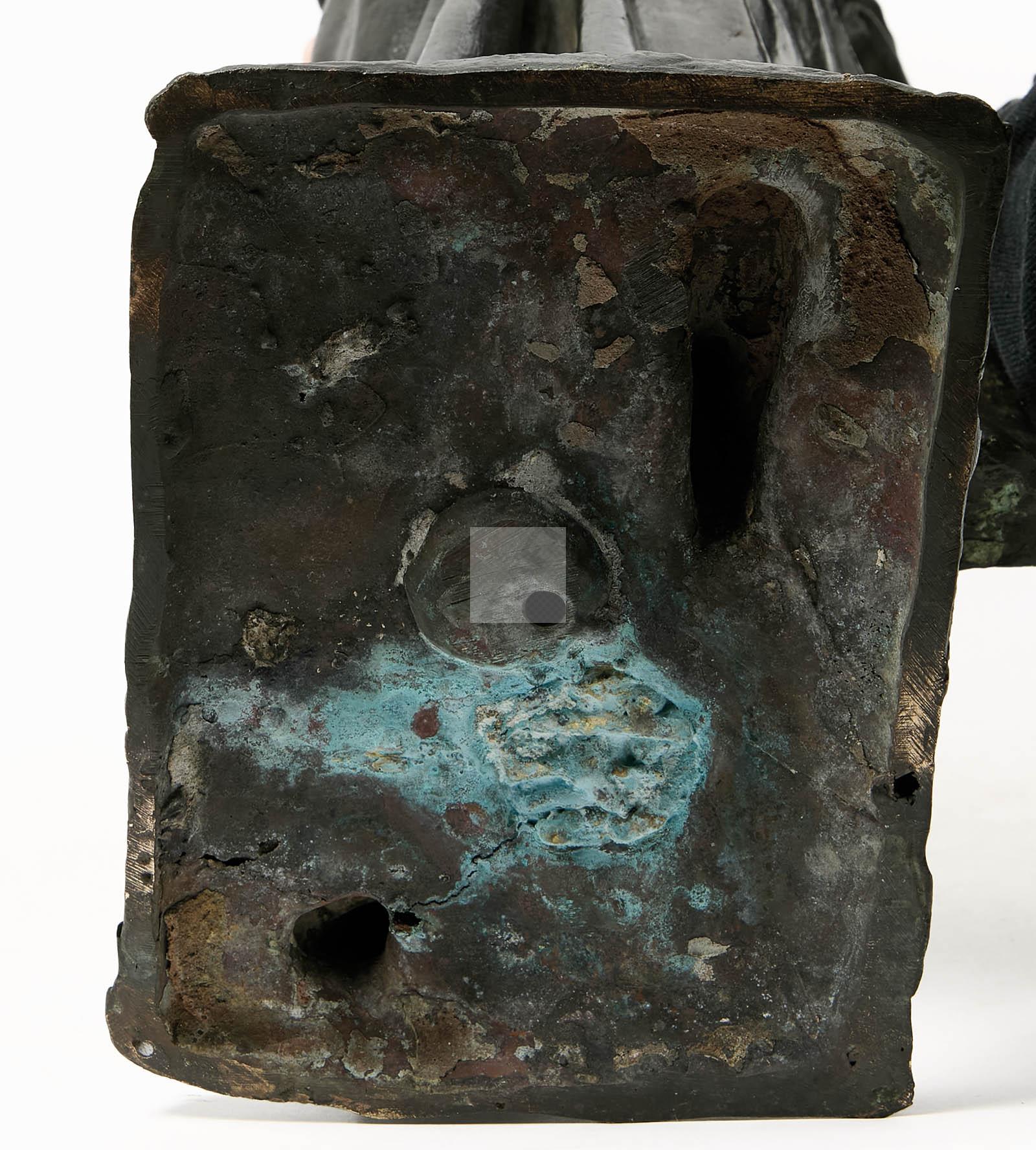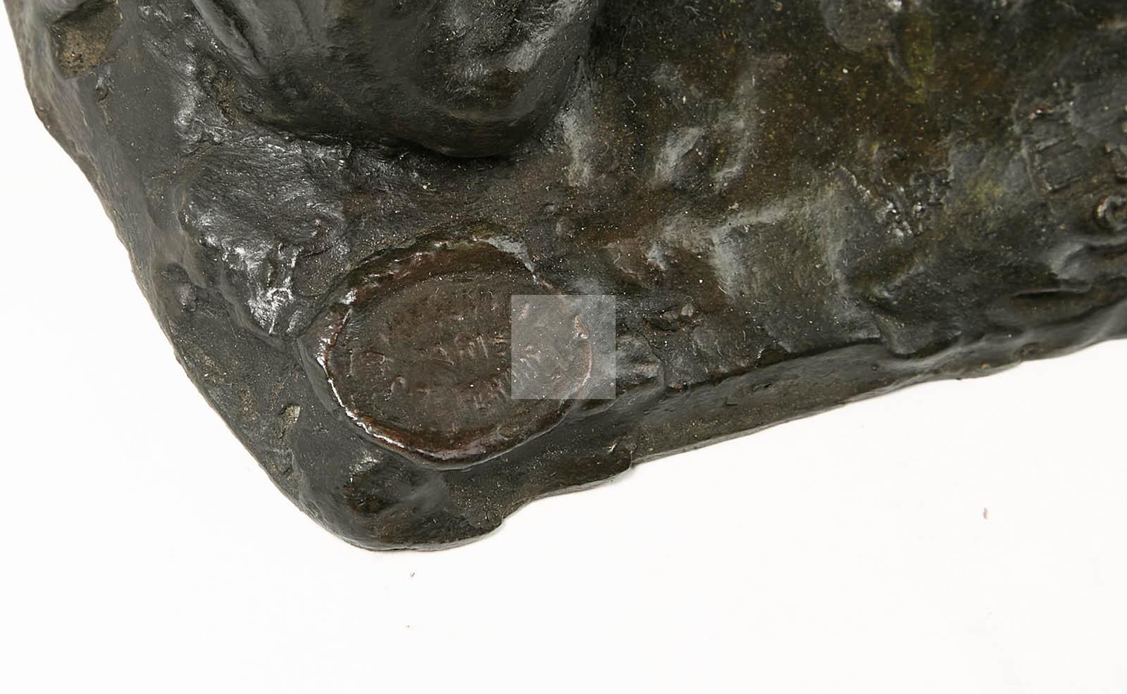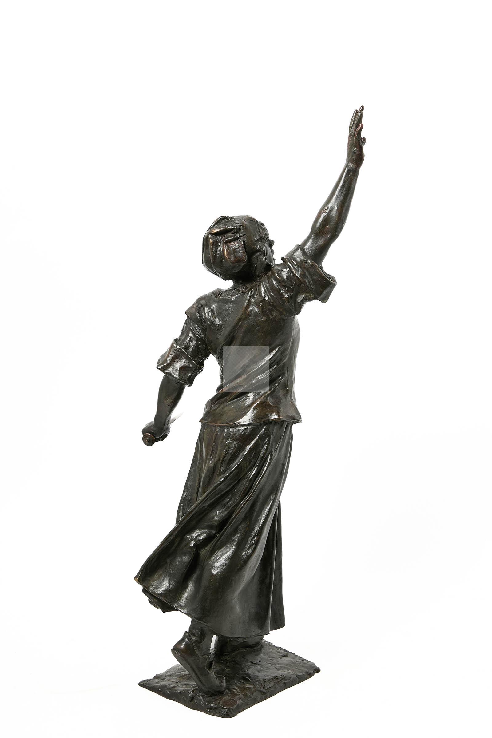 « Projet du monument à Jeanne Maillotte » Bronze à patine brun nuancé. Cire perdue. Haut hors socle : 72 cm Egrenures et trous de perçage au socle de marbre, accident restauré au glaive. Monument à Jeanne Maillotte réalisé en 1935 et se trouvant avenue du Peuple-Belge à Lille. Jeanne Maillotte est un personnage légendaire de l’histoire de Lille, qui aurait contribué à repousser une attaque des hurlus en 1582. Un récit du XIXème siècle évoque un épisode historique lillois situé dans le contexte des conflits religieux du XVIème siècle entre catholiques et protestants : enjuillet 1582, une bande de hurlus aurait attaqué la ville de Lille par le faubourg de Courtrai, provoquant la stupeur de la population. Une cabaretière du nom de Jeanne Maillotte travaillant dans une échoppe de la place des Bleuets aurait alors alerté les archers de la confrérie de Saint Sébastien et galvanisé la résistance des habitants au point de parvenir à repousser cette attaque. Si l’existence de ce personnage n’est pas prouvée, la léggende a eu du succès, suscitant des oeuvres d’arts, chansons populaires (un poème du chansonnier Alexandre Desrousseaux par exemple), l’inauguration d’une statue à Lille en 1935et la création d’une géante en 2004.
