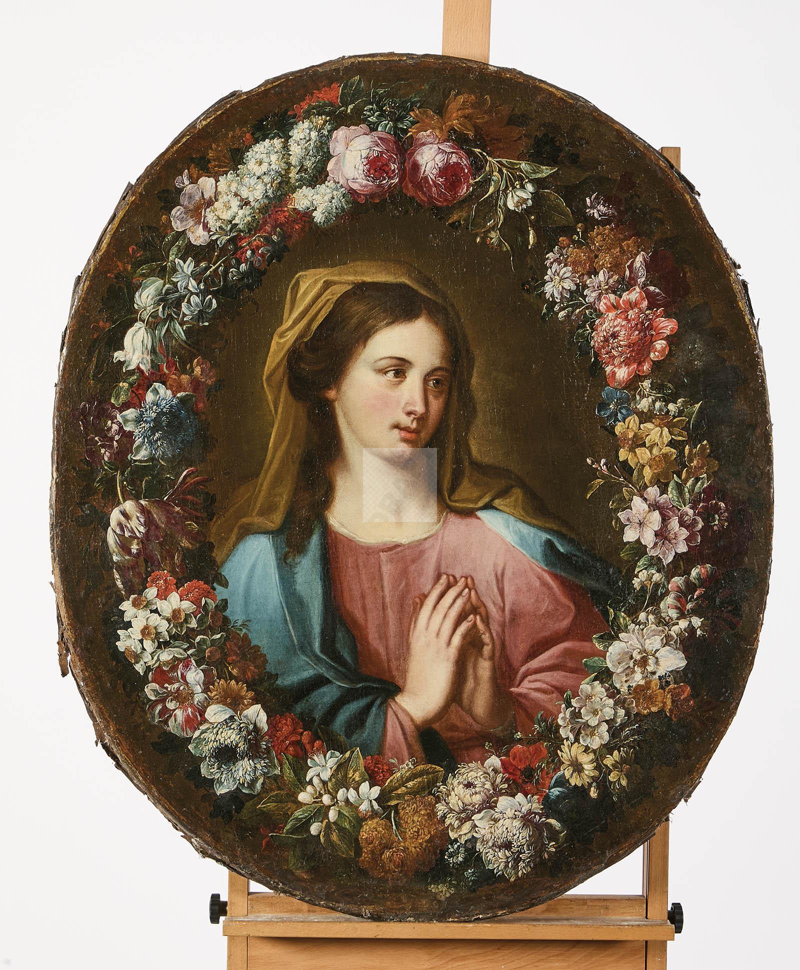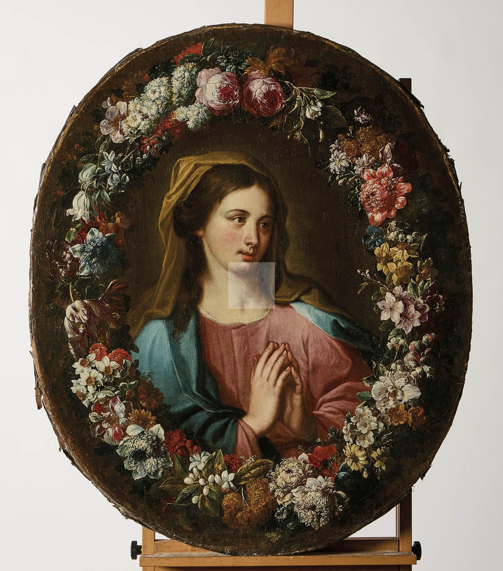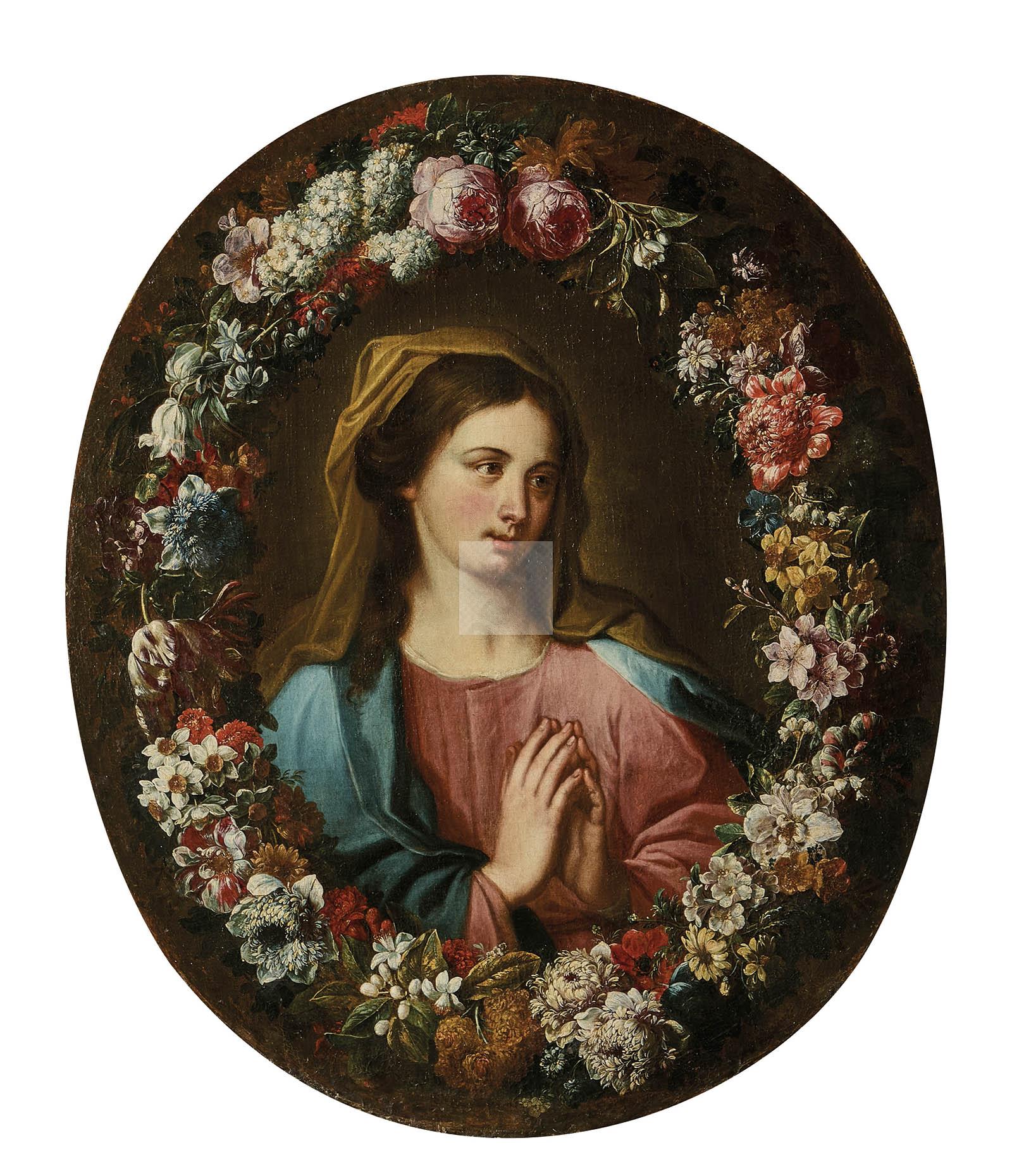 Vierge en prière dans un entourage de guirlandes de fleurs.