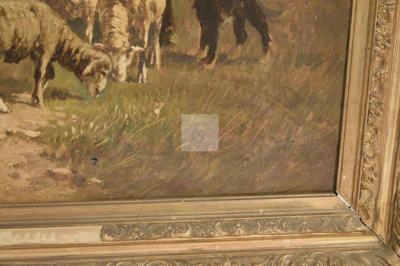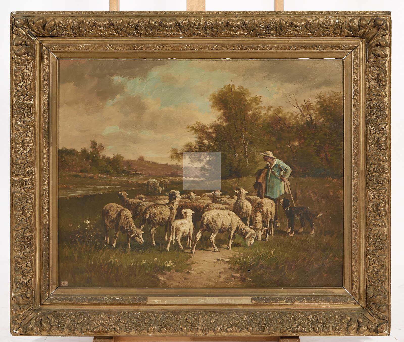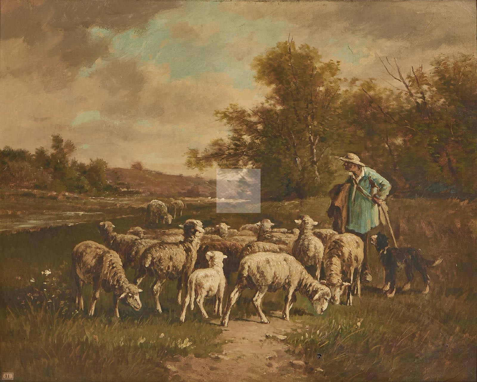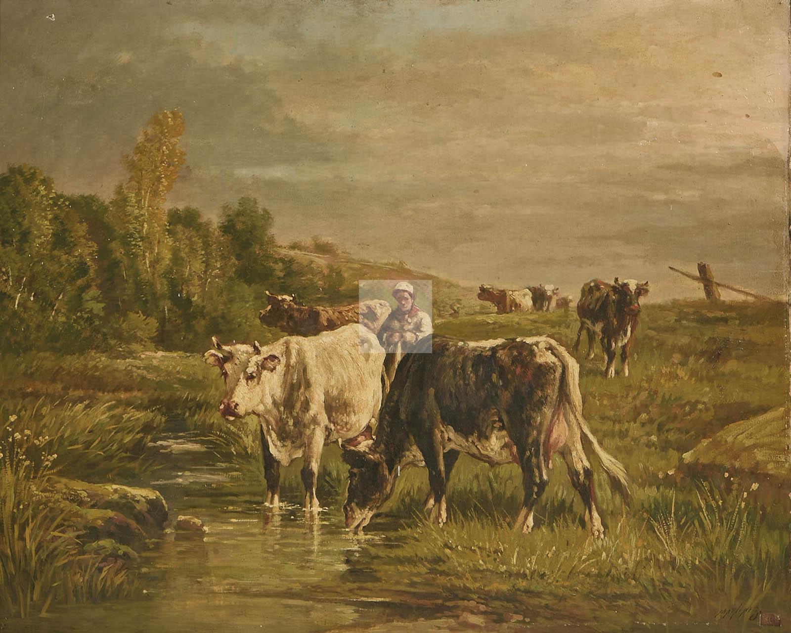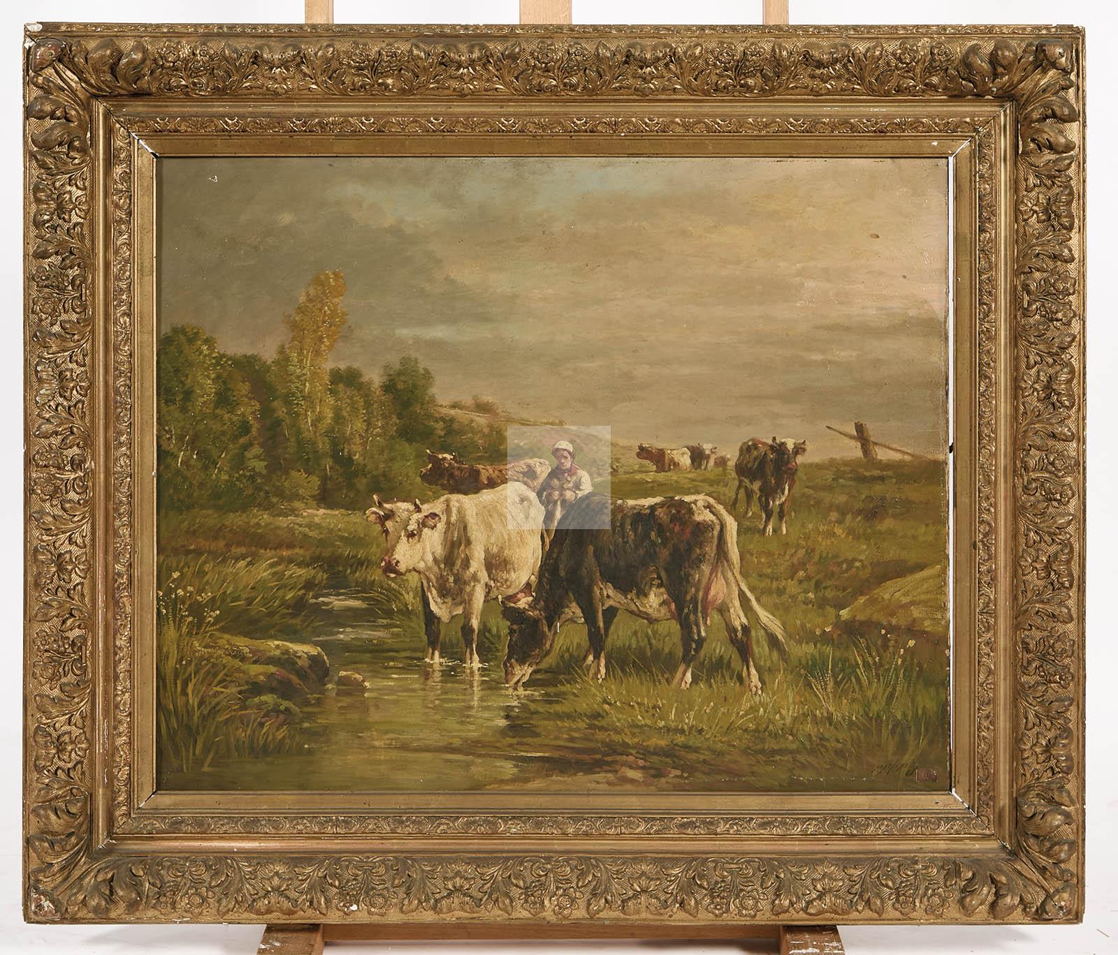 Troupeau de vaches près d’une mare, Gardien de moutons et son chien