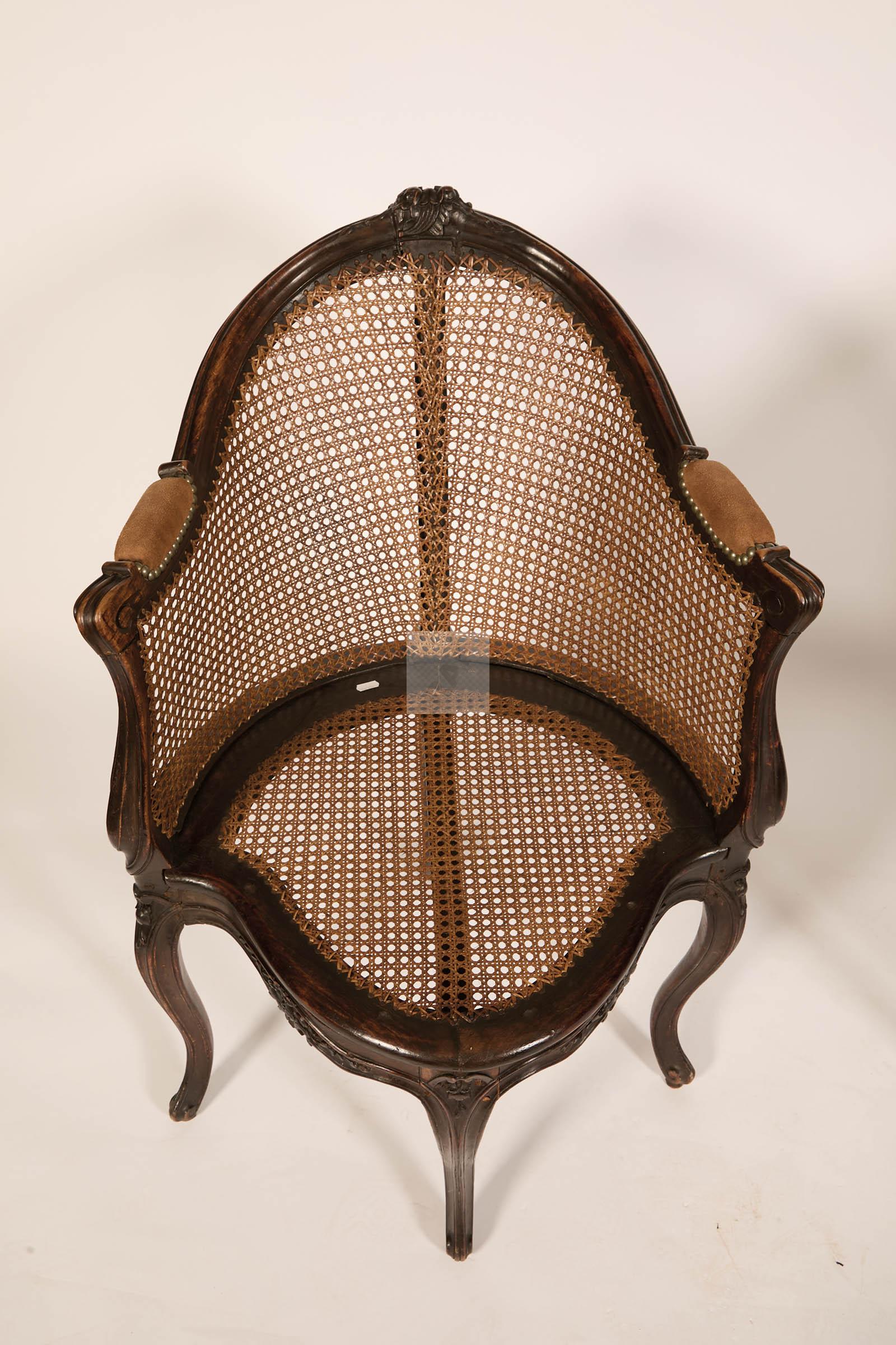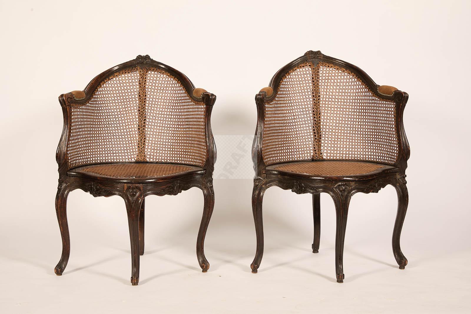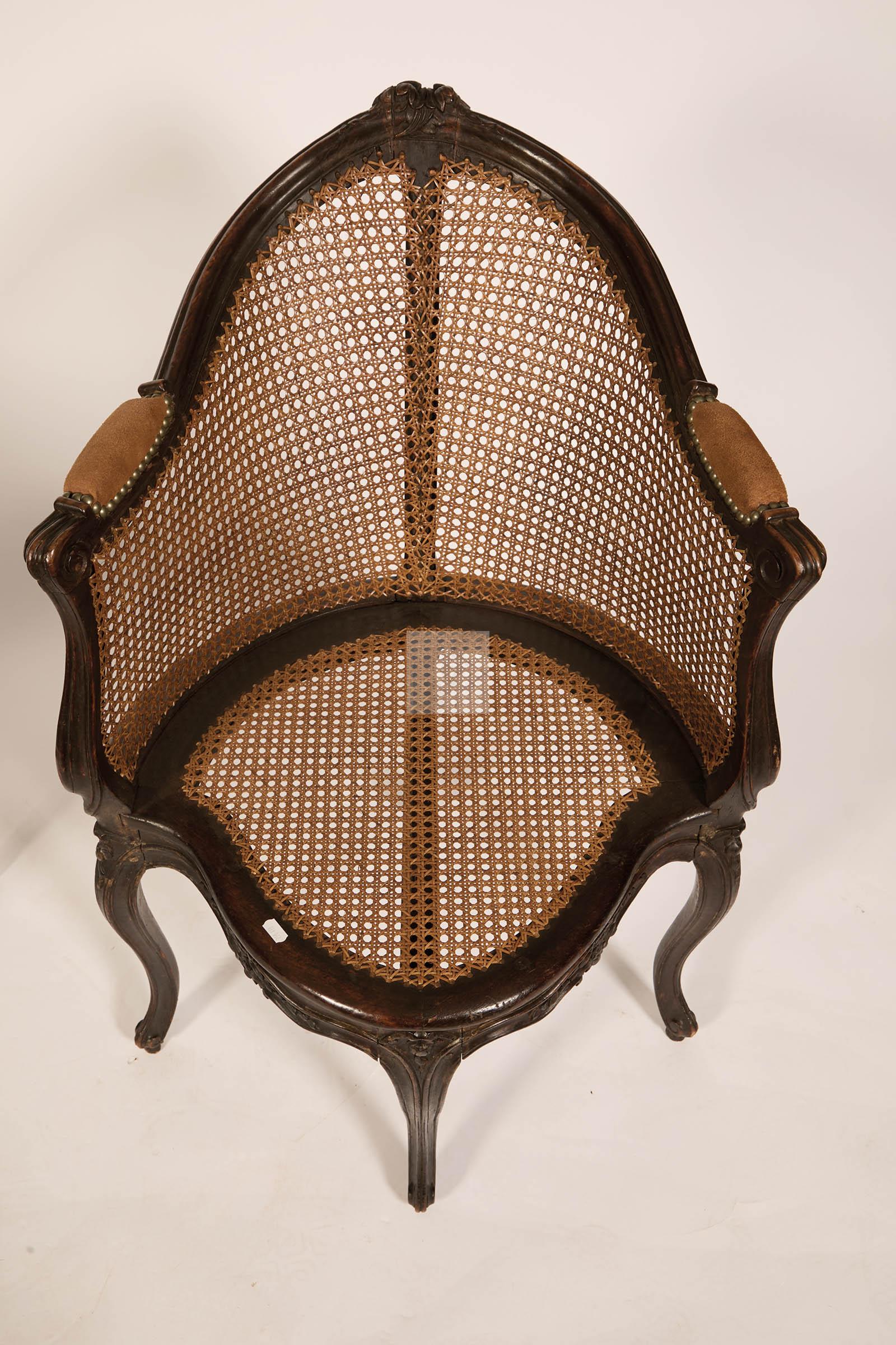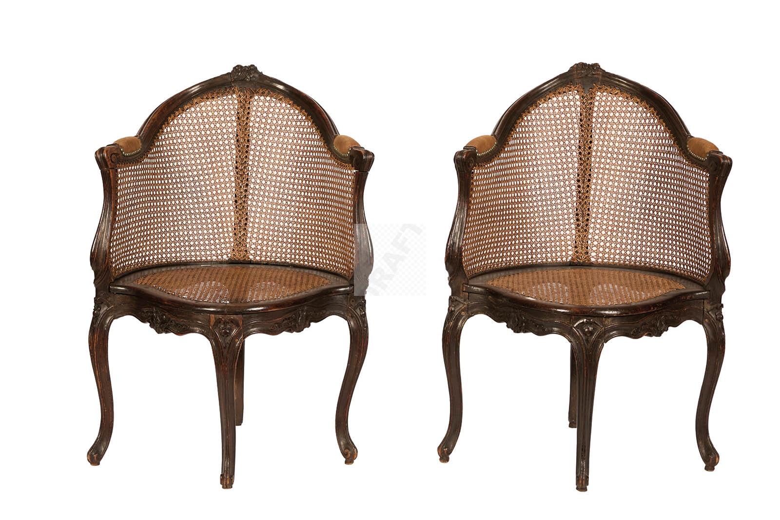 510 Rare paire de fauteuils de bureau à fond de cannes en hêtre sculpté de fleurettes et grenades éclatées, les ceintures sinueuses.