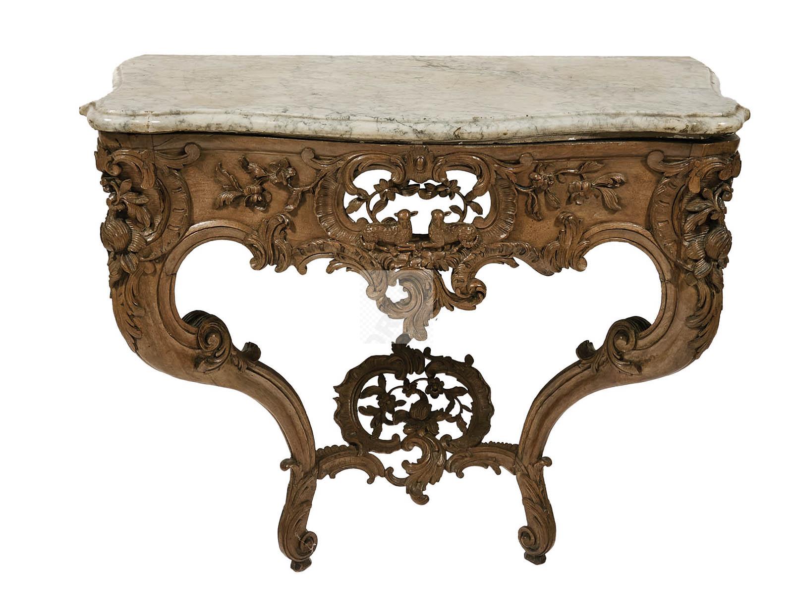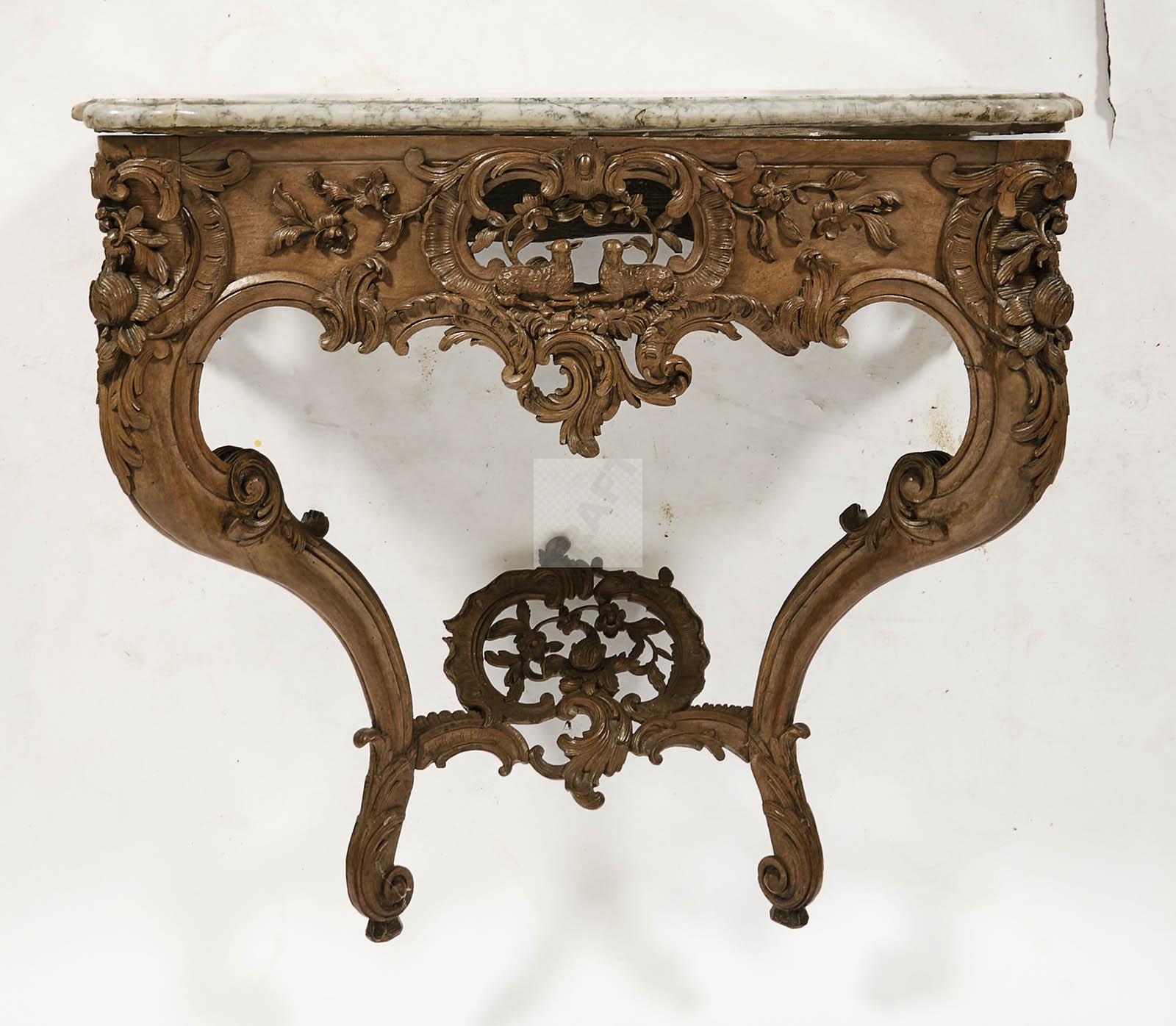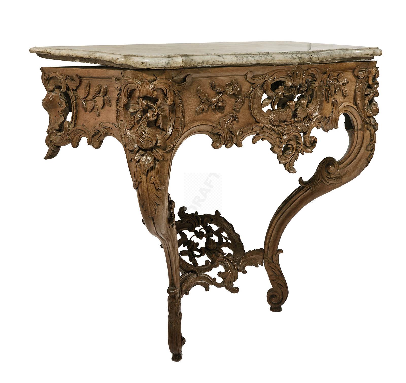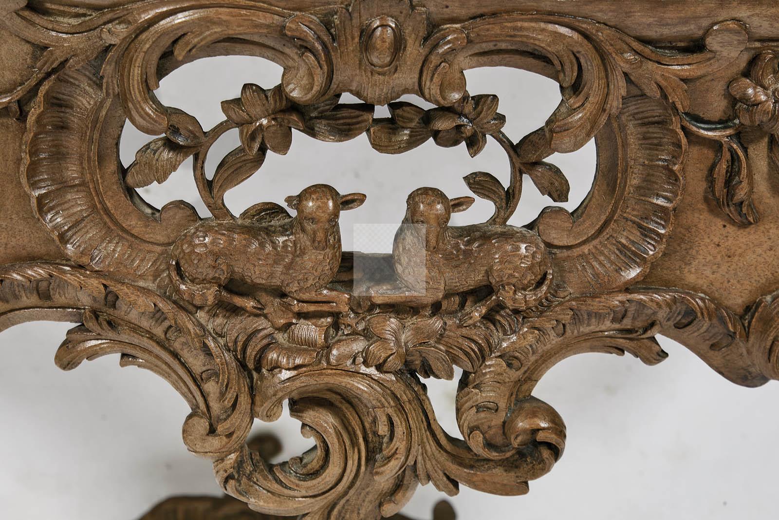 512 Console en noyer mouluré richement sculpté de motifs de coquilles ajourées, agneaux, fleurettes, rocaille, les pieds mouvementés soulignées de motifs de grenades éclatées et motifs d’enroulement réuni par une entretoise ajourée en forme de rocaille