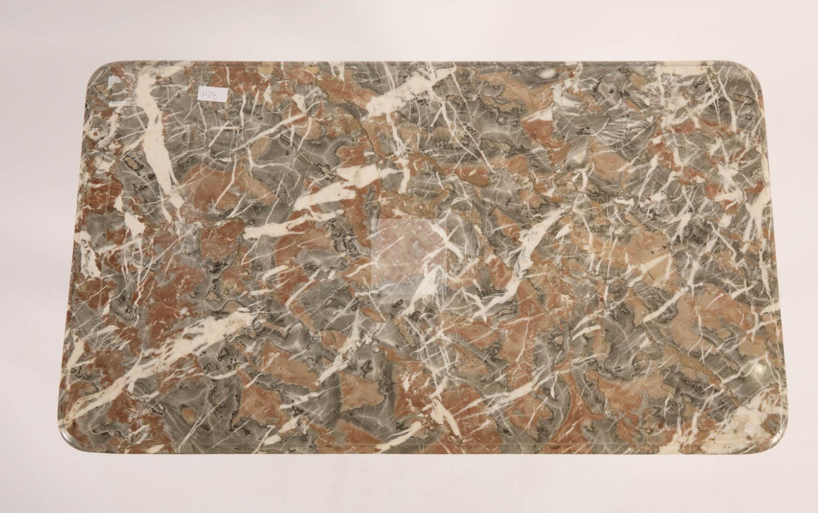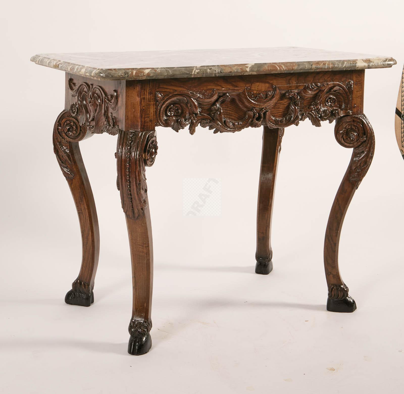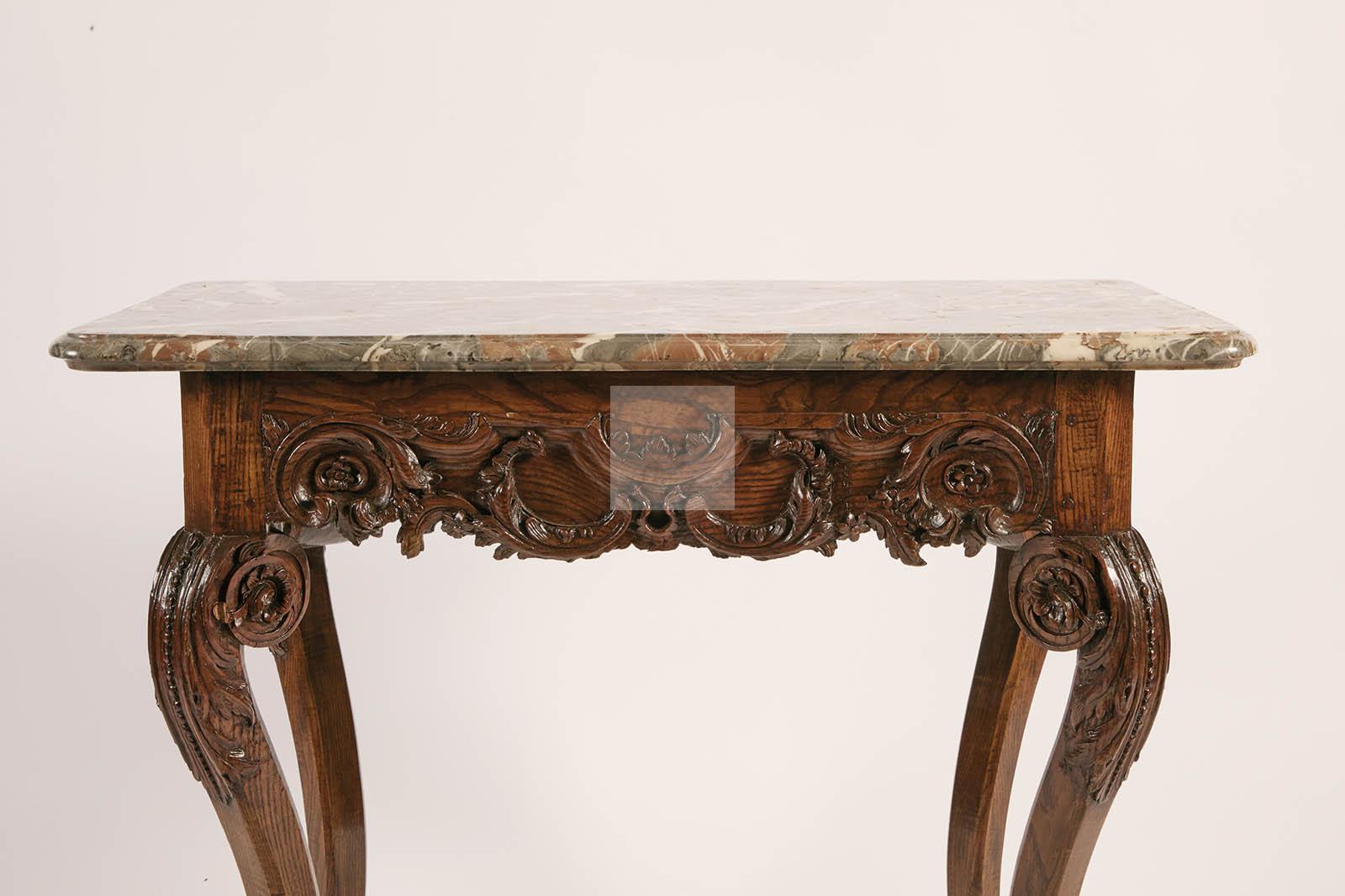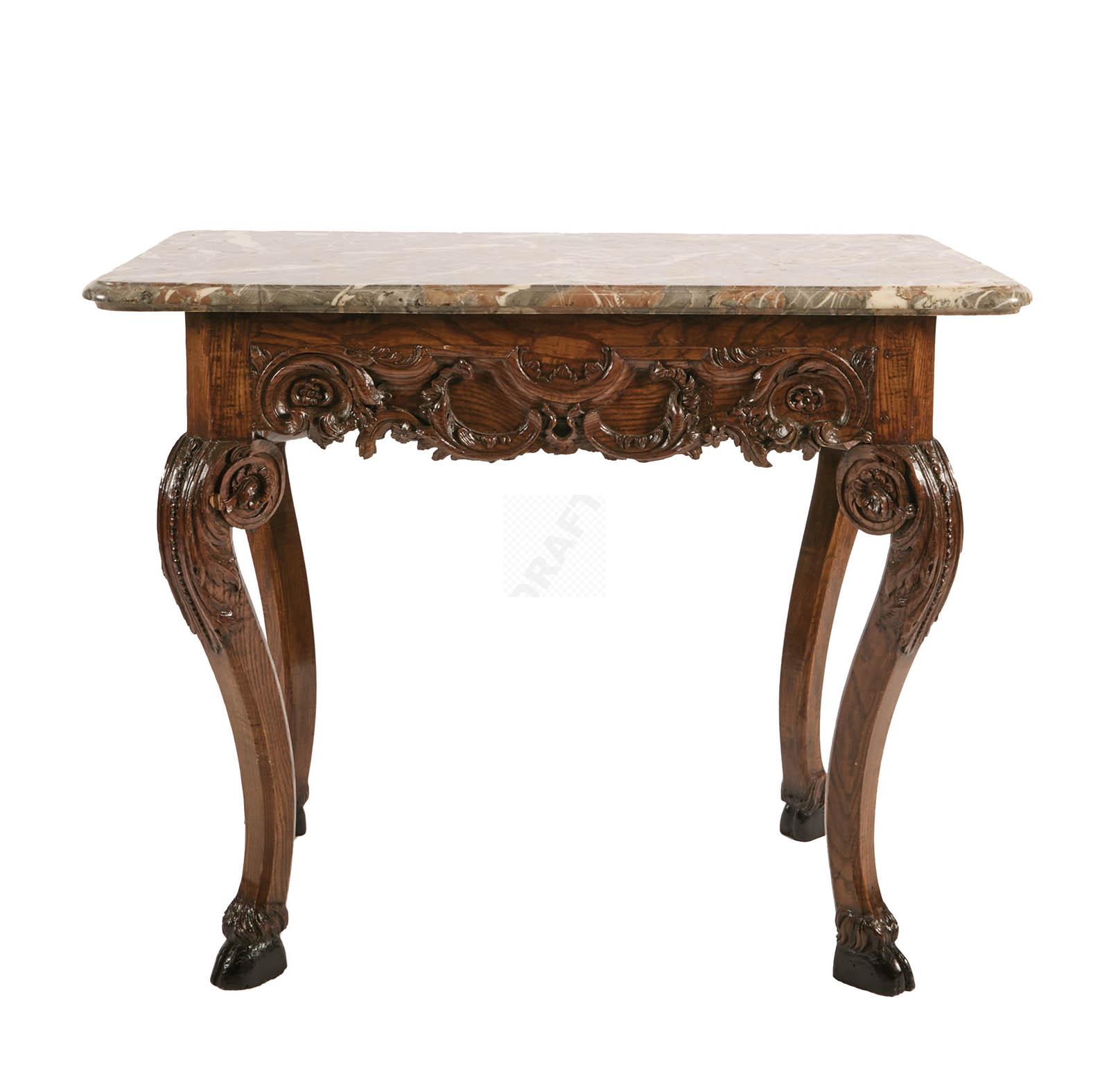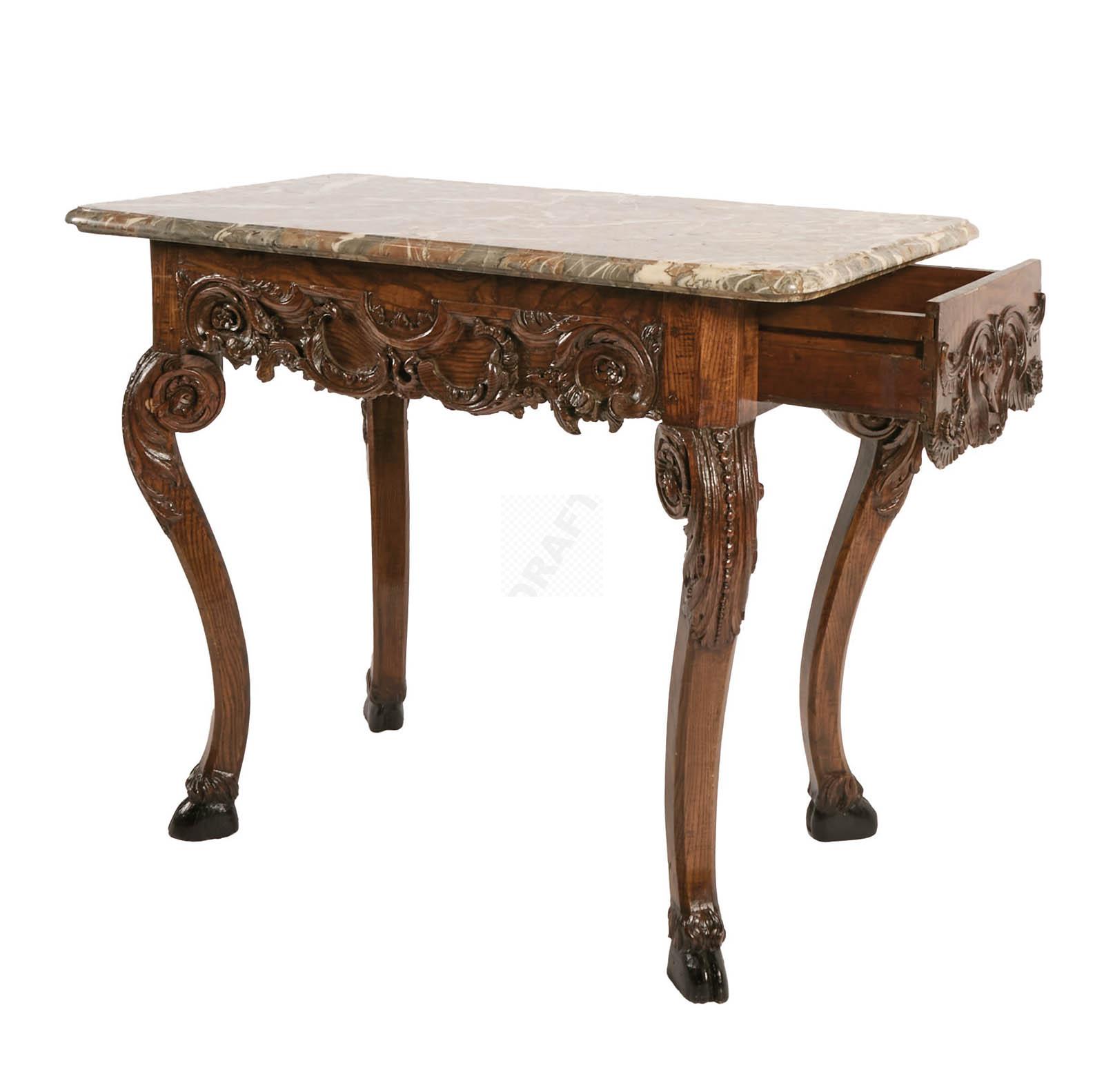 513 Table de milieu en chêne richement sculpté de rocailles et motifs feuillagées, ceinture mouvementée, pieds galbés à terminaison en sabot, ouvre à un tiroir latéral, plateau de marbre veiné