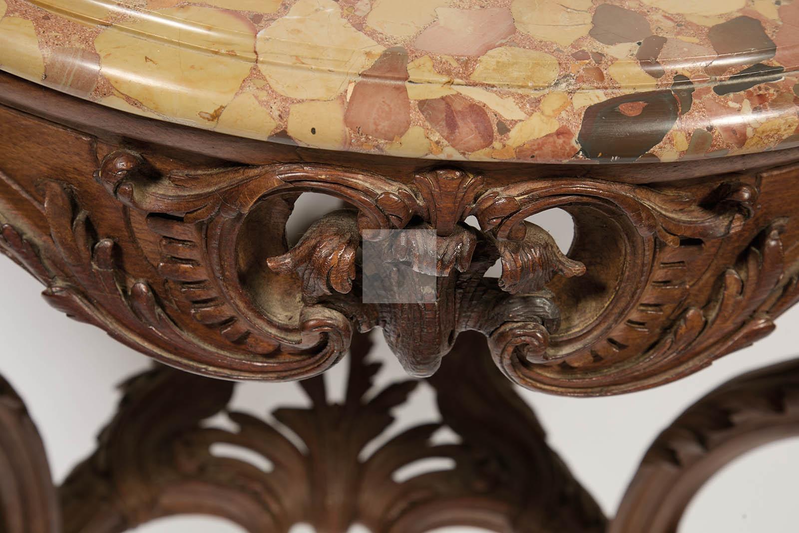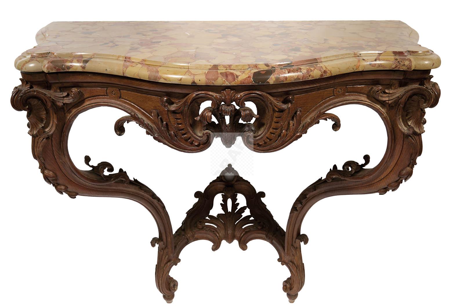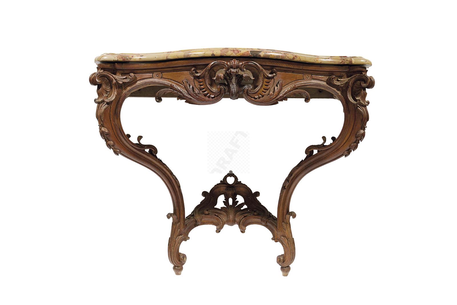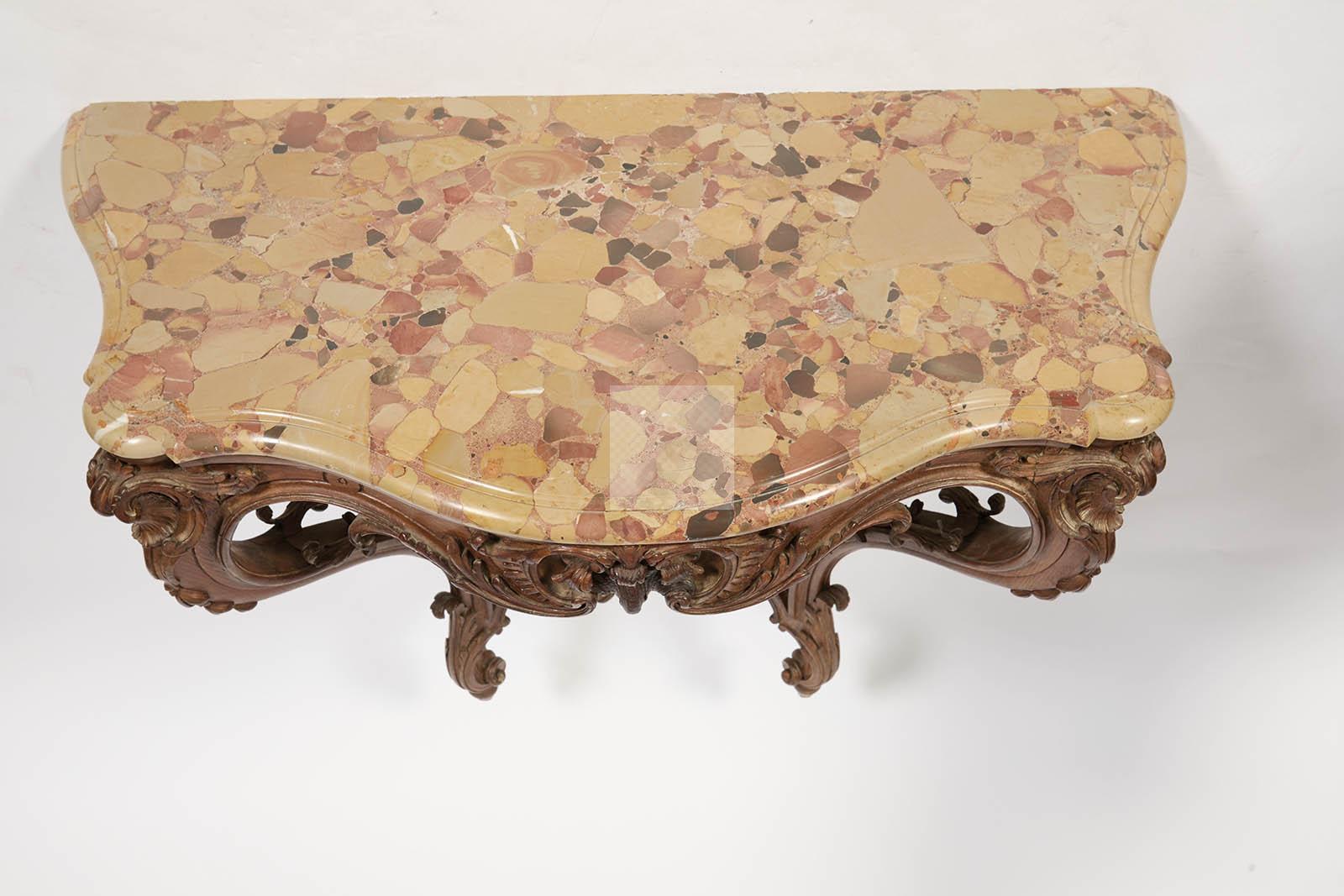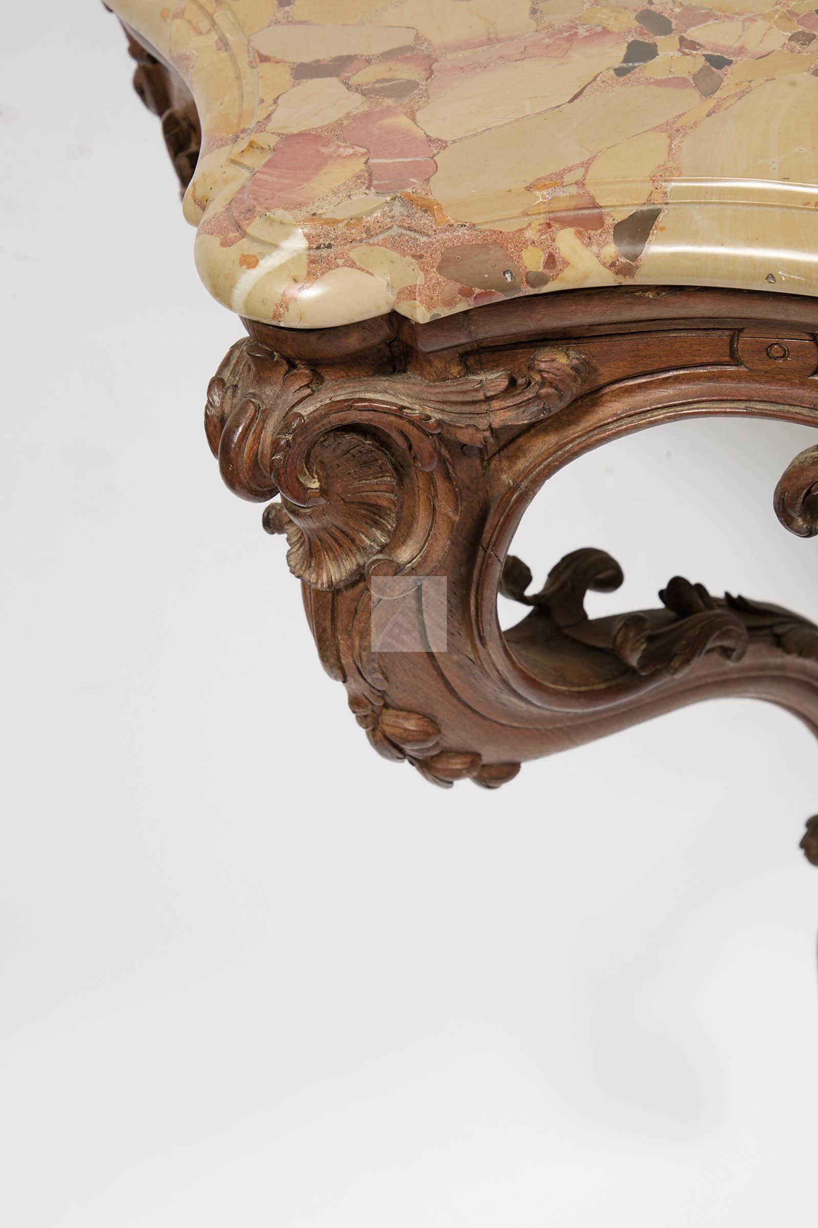 525 Belle console de forme mouvementéeen hêtre sculpté, la ceinture à décor de coquiles ajourés, les montants sinueux réunis par une entretoise à décor de coquille et motifs feuillagés, plateau de marbre veiné.