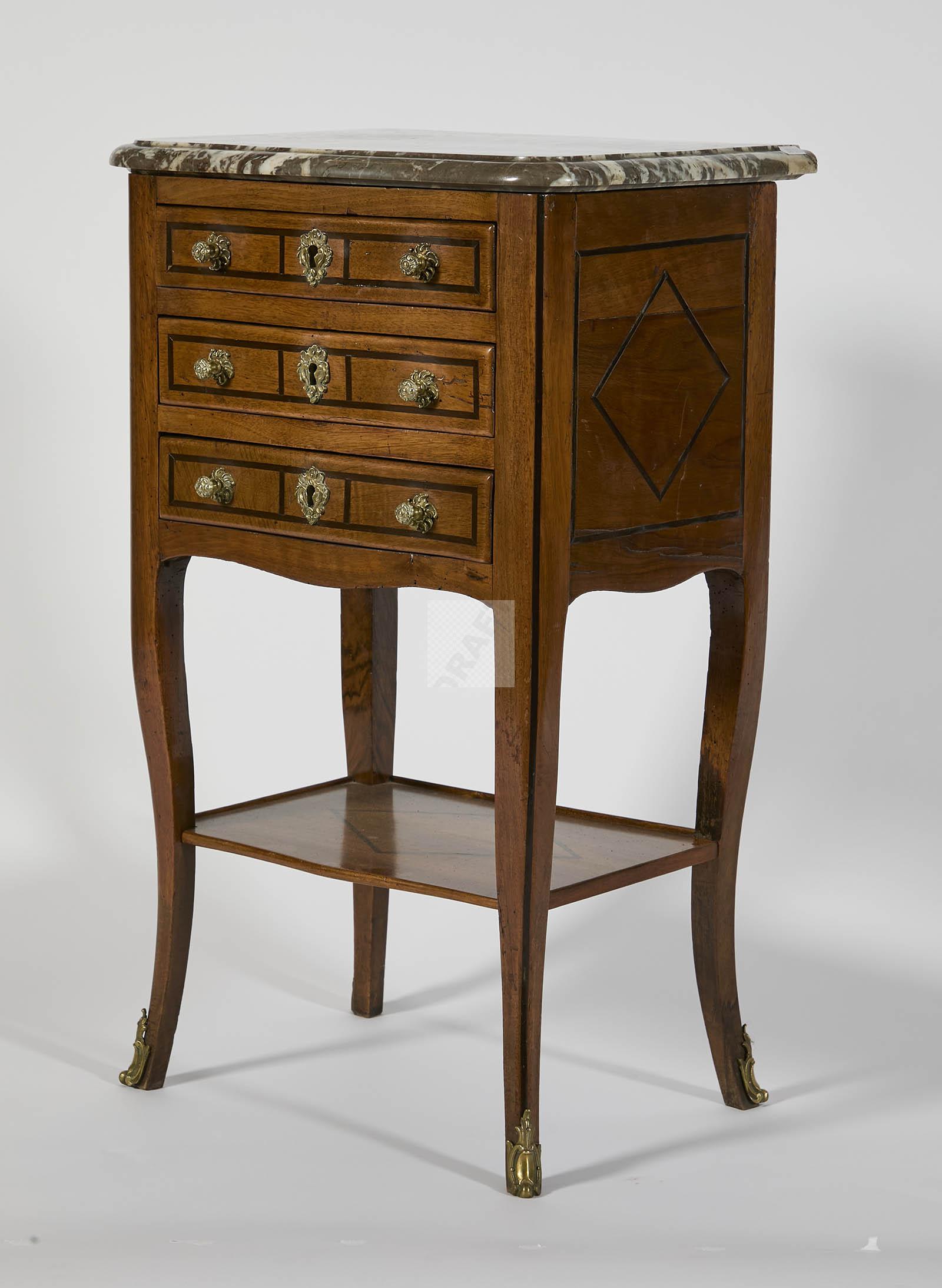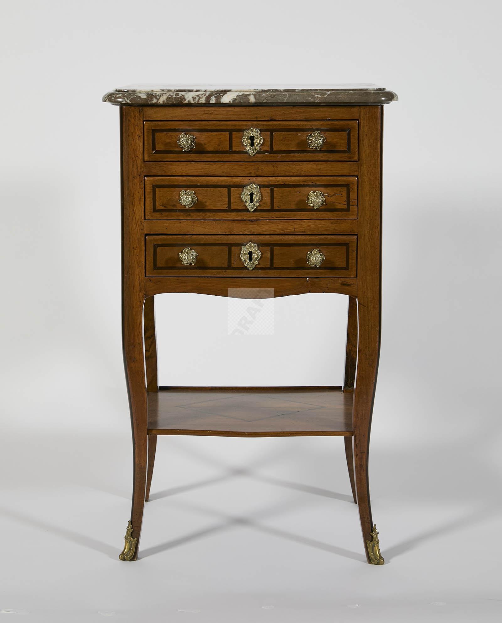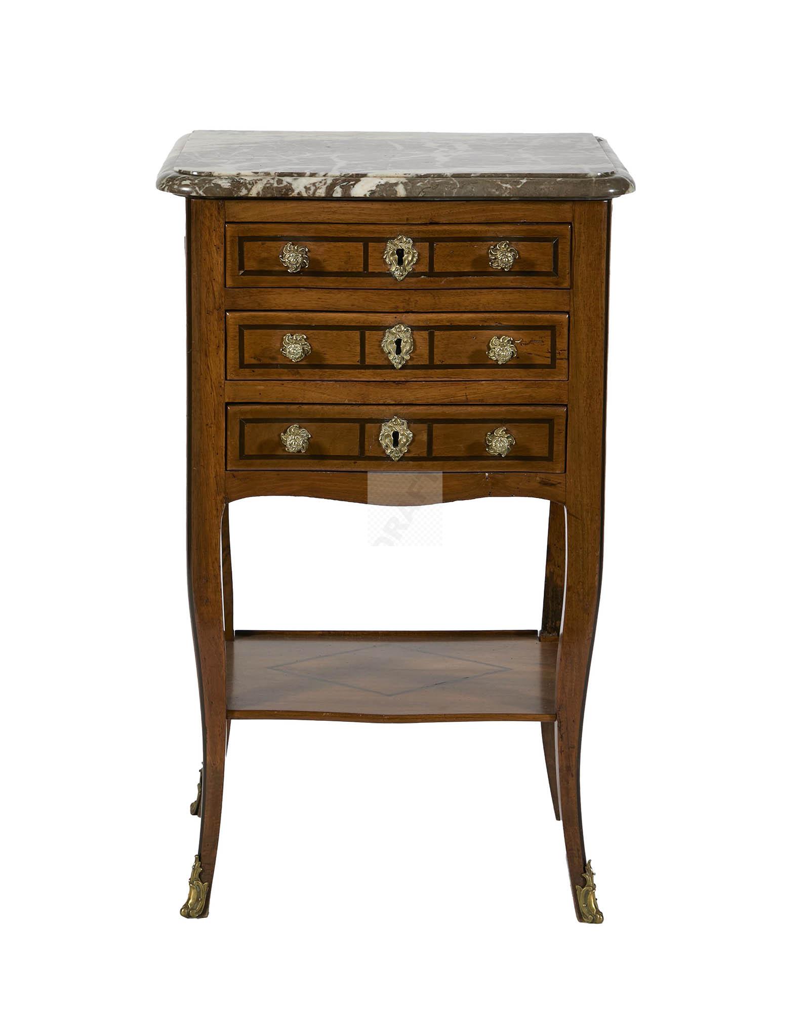 528 Petit chevet en placage à filets d’amarante, ouvrant en façade par trois tiroirs, le piètement quadripode légèrement galbé relié par une tablette d’entretoise, entrées de serrure, poignées de tirage et sabots en bronze ciselé et doré à décor de rocailles,