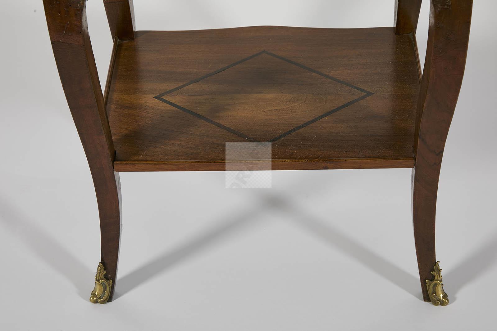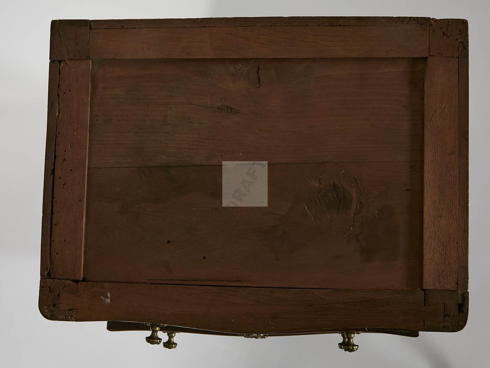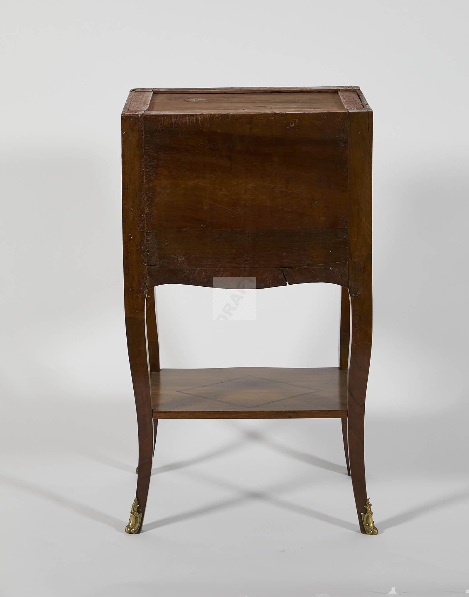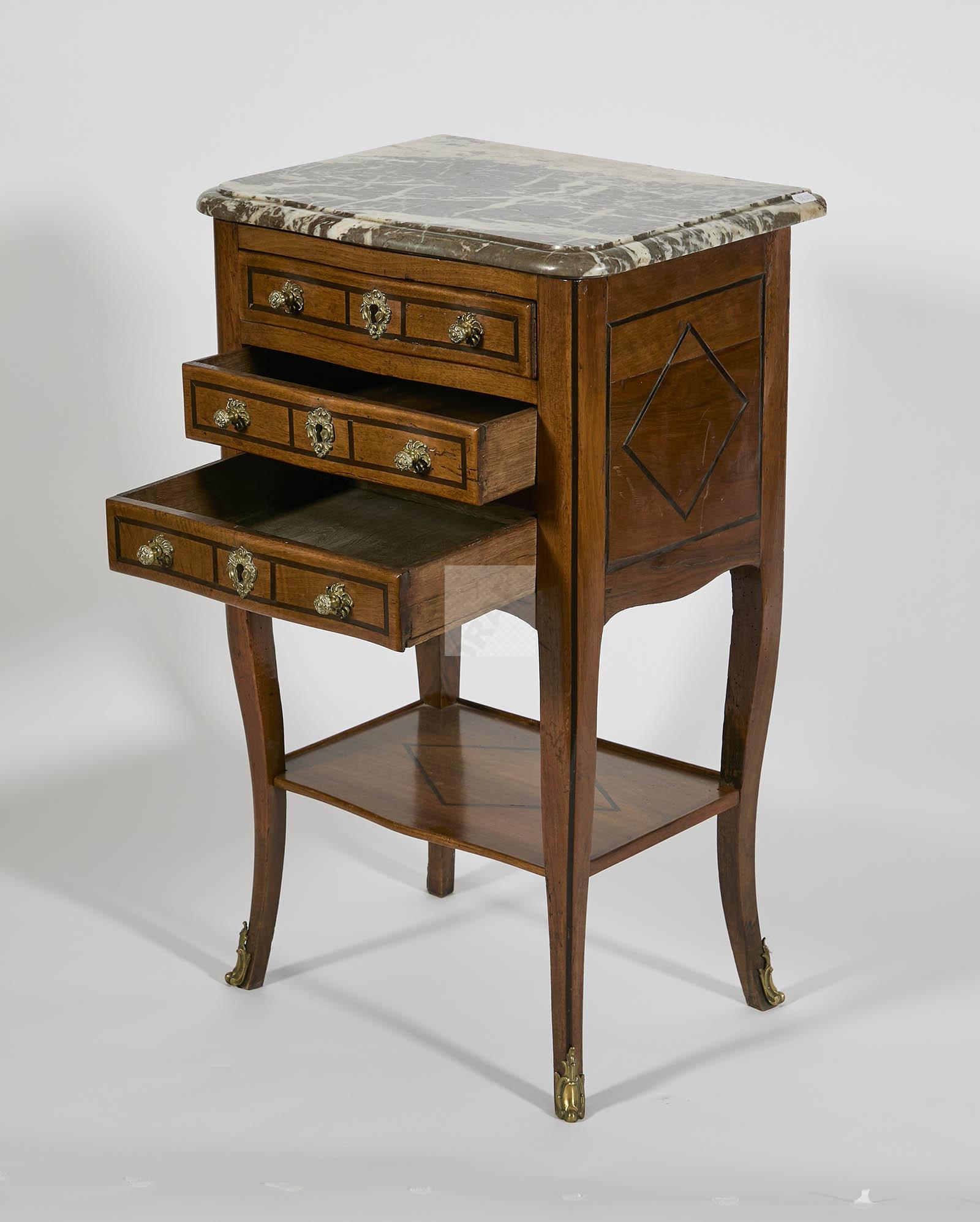 528 Petit chevet en placage à filets d’amarante, ouvrant en façade par trois tiroirs, le piètement quadripode légèrement galbé relié par une tablette d’entretoise, entrées de serrure, poignées de tirage et sabots en bronze ciselé et doré à décor de rocailles,
