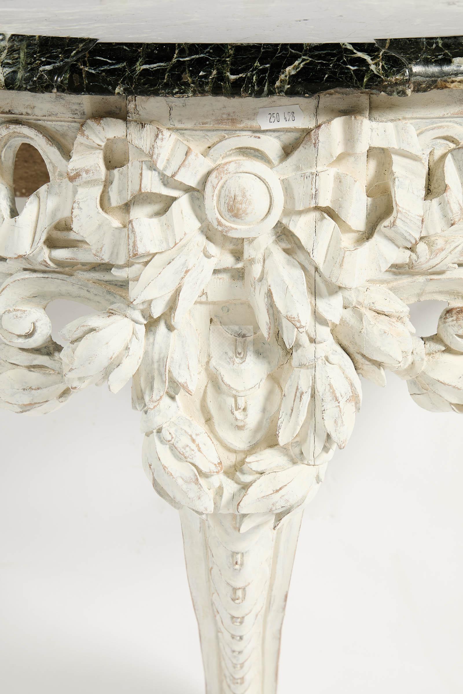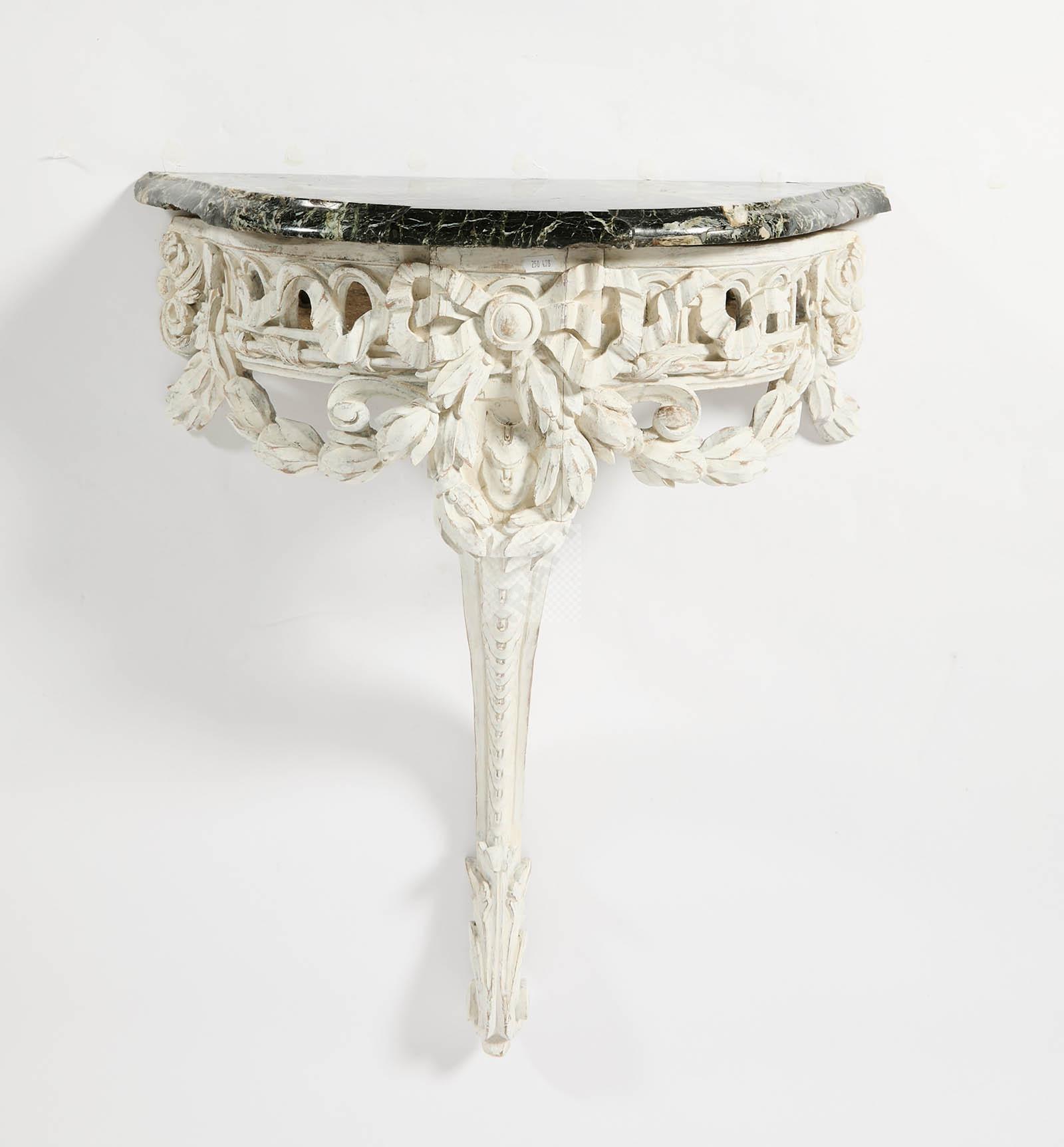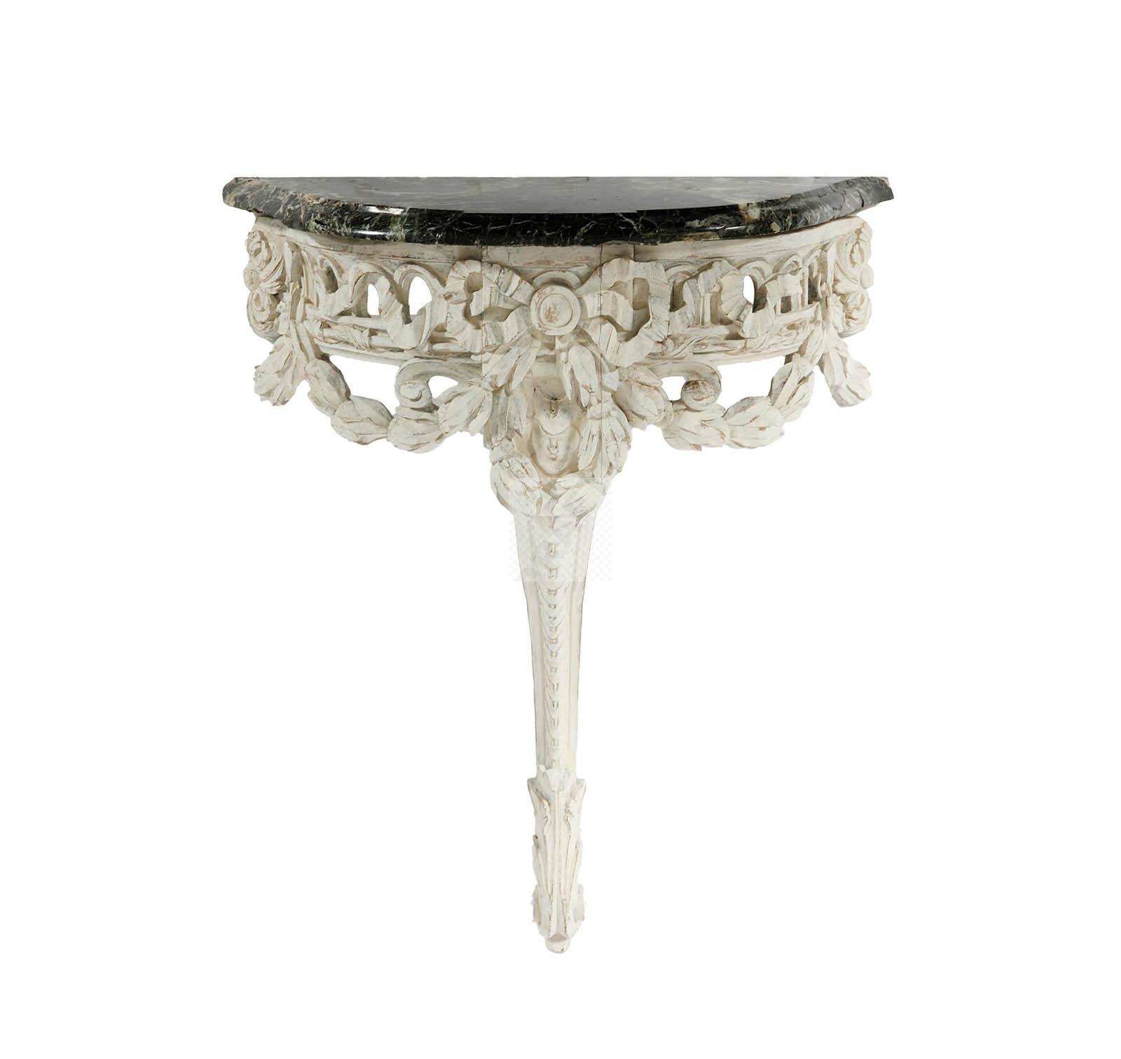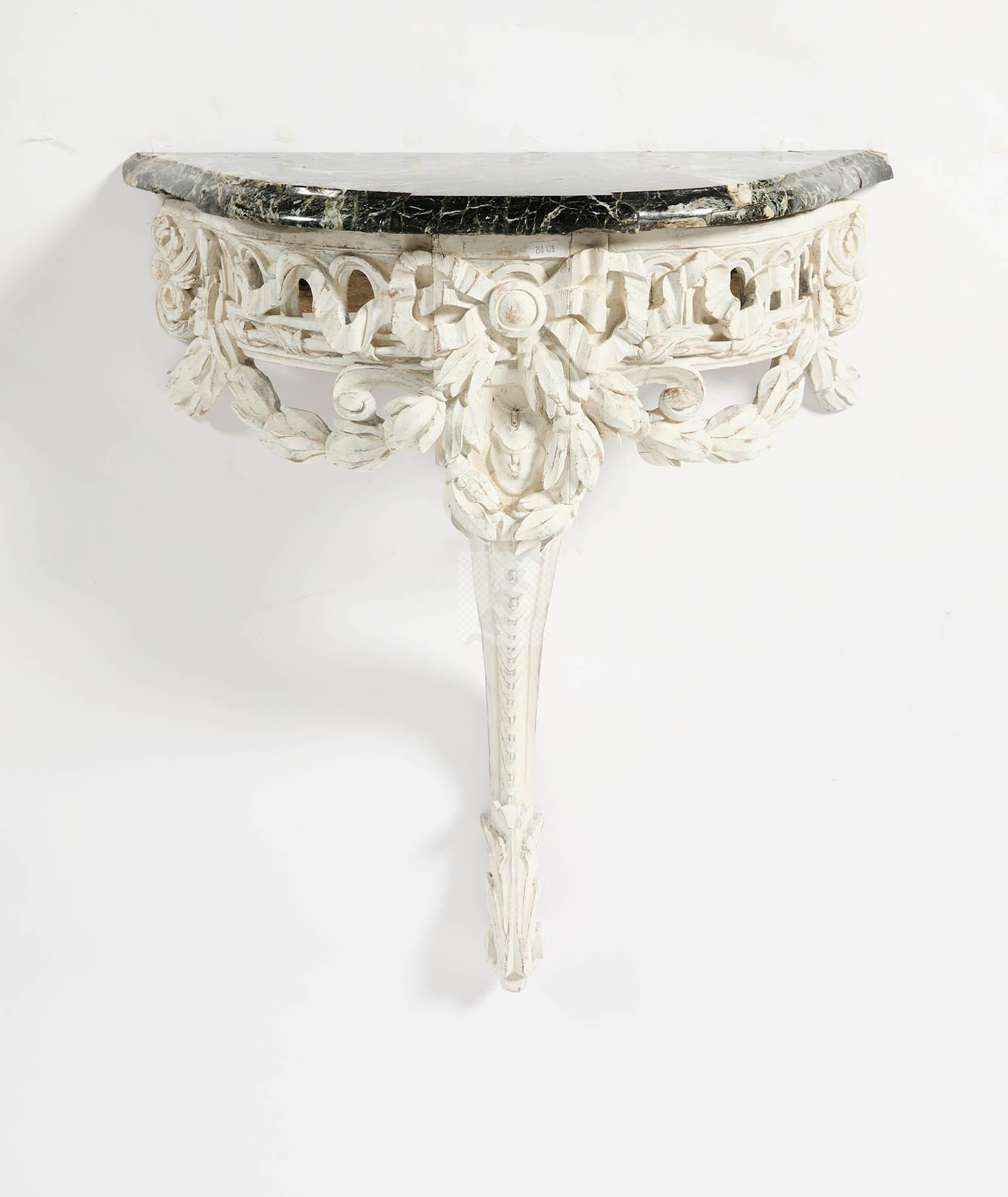 529 Console en bois relaqué à décor sculpté de noeuds, rubans, guirlandes feuillagées et frises de piastre.