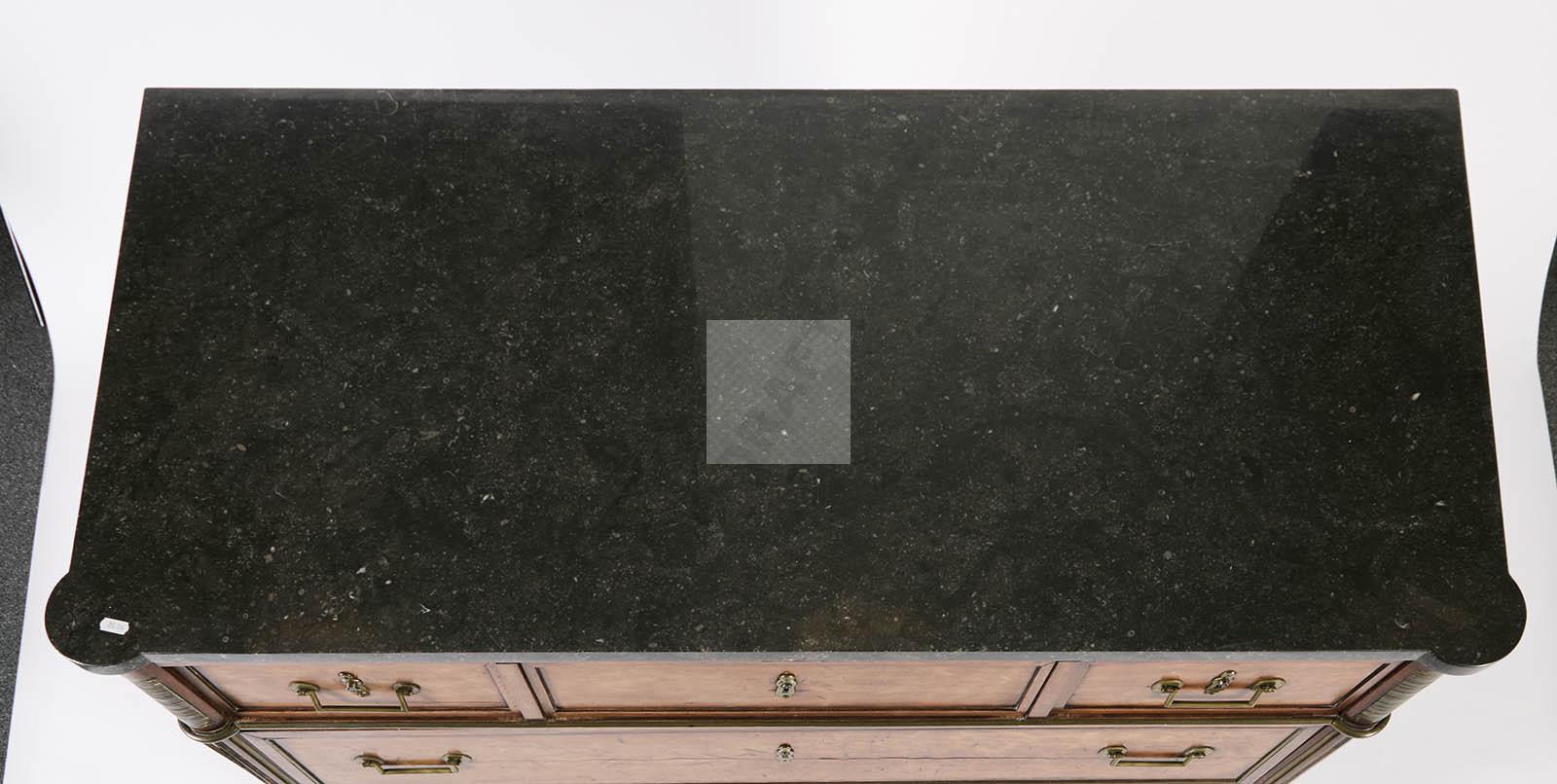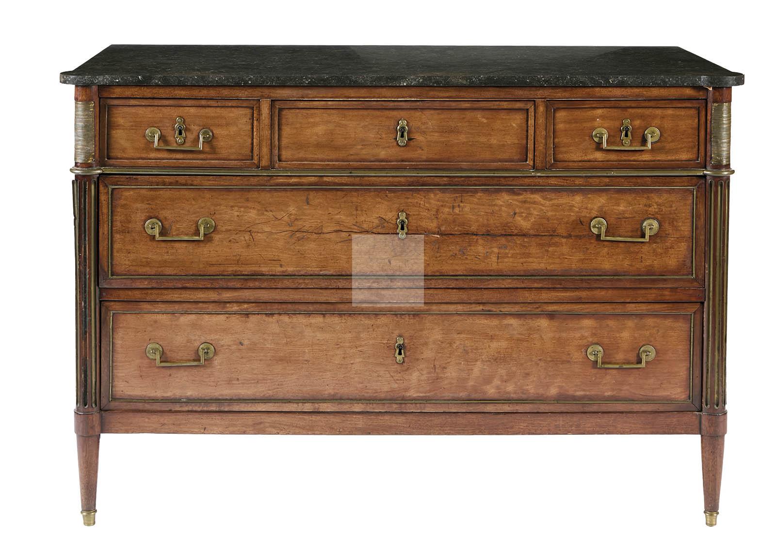 537 Commode d’époque Louis XVI en acajou et placage d’acajou ouvrant à cinq tiroirs dont trois en ceinture, montants avant en colonnes cannelées, montants arrière cannelés, pieds fuselés, serrures tréflées, poignées de tirage mobiles, cannelures des montants avant et plaques brettées en laiton anciennement doré, dessus de granit noir.