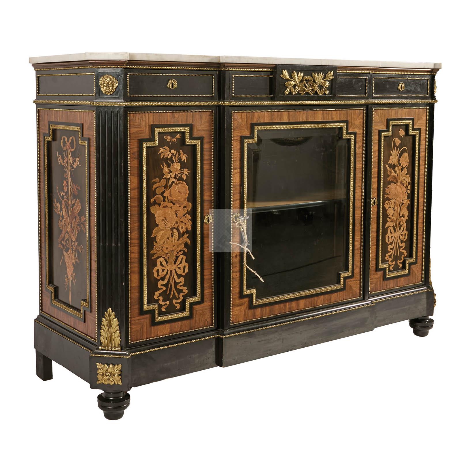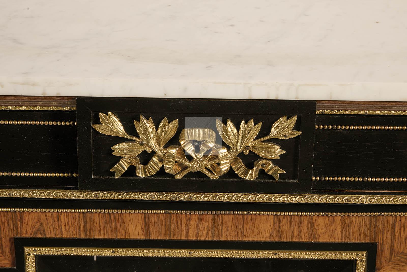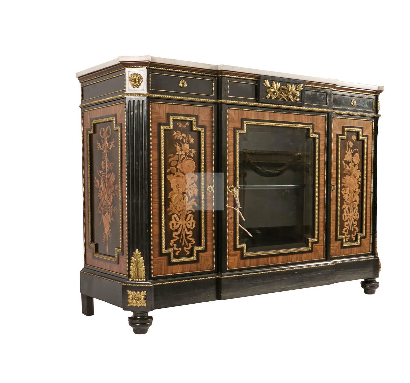Il ouvre à un vantail central vitré, deux vantaux latéraux, petits pieds toupie, plateau de marbre blanc, ornementations de bronze ciselés et dorés