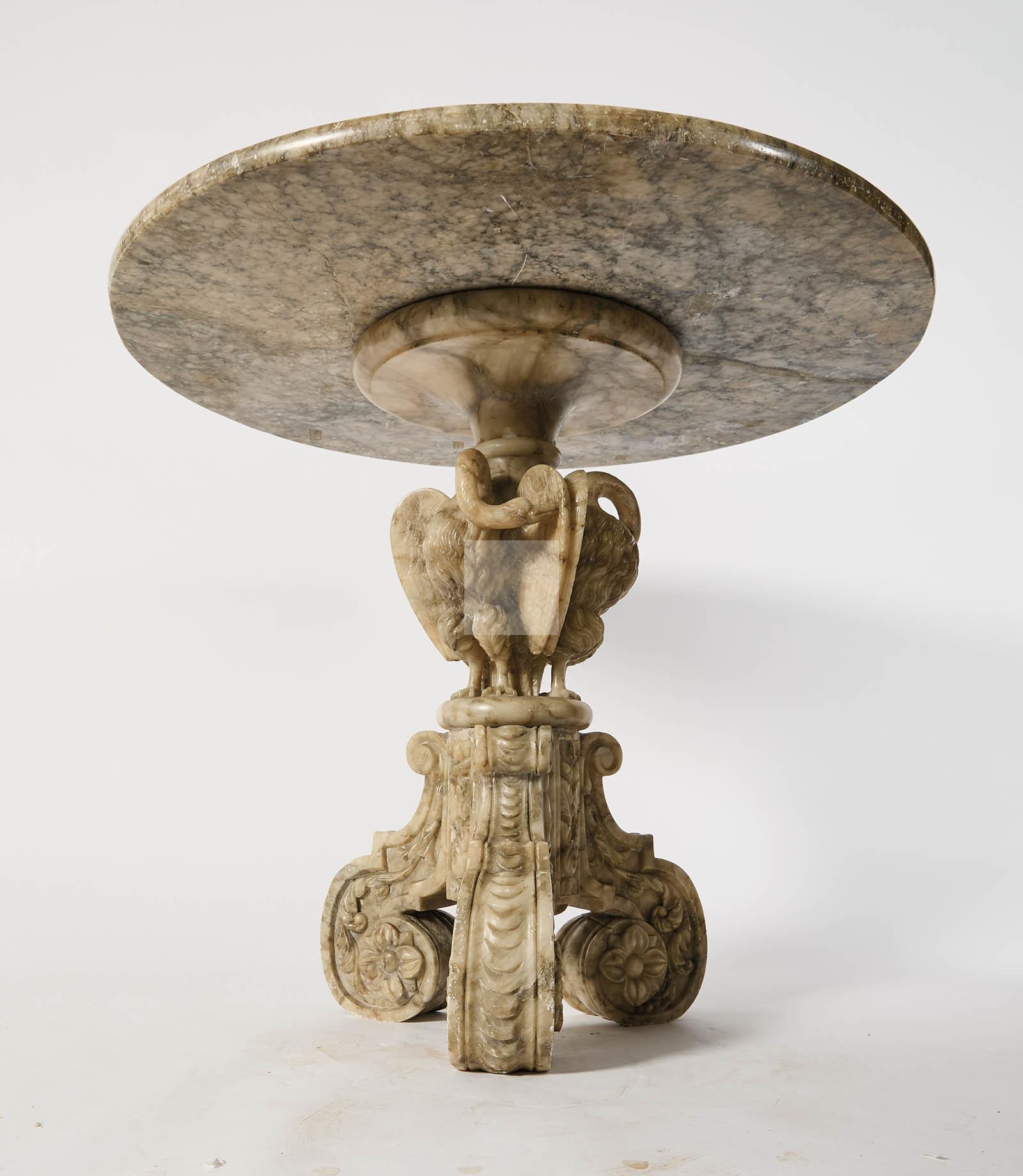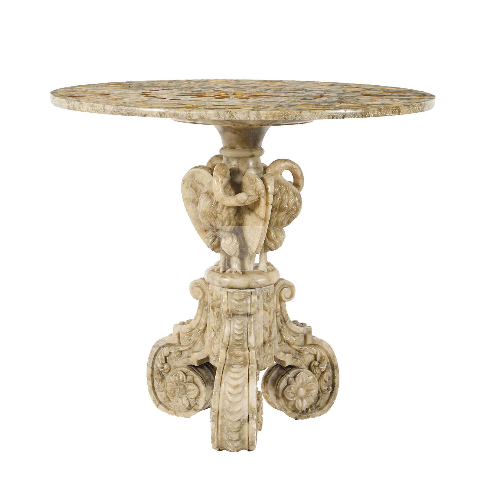 548 Guéridon en albâtre et albâtre sculpté à plateau marqueté rayonnant à motifs feuillagés, piétement tripode à enroulements et cygne en semi ronde-bosse.