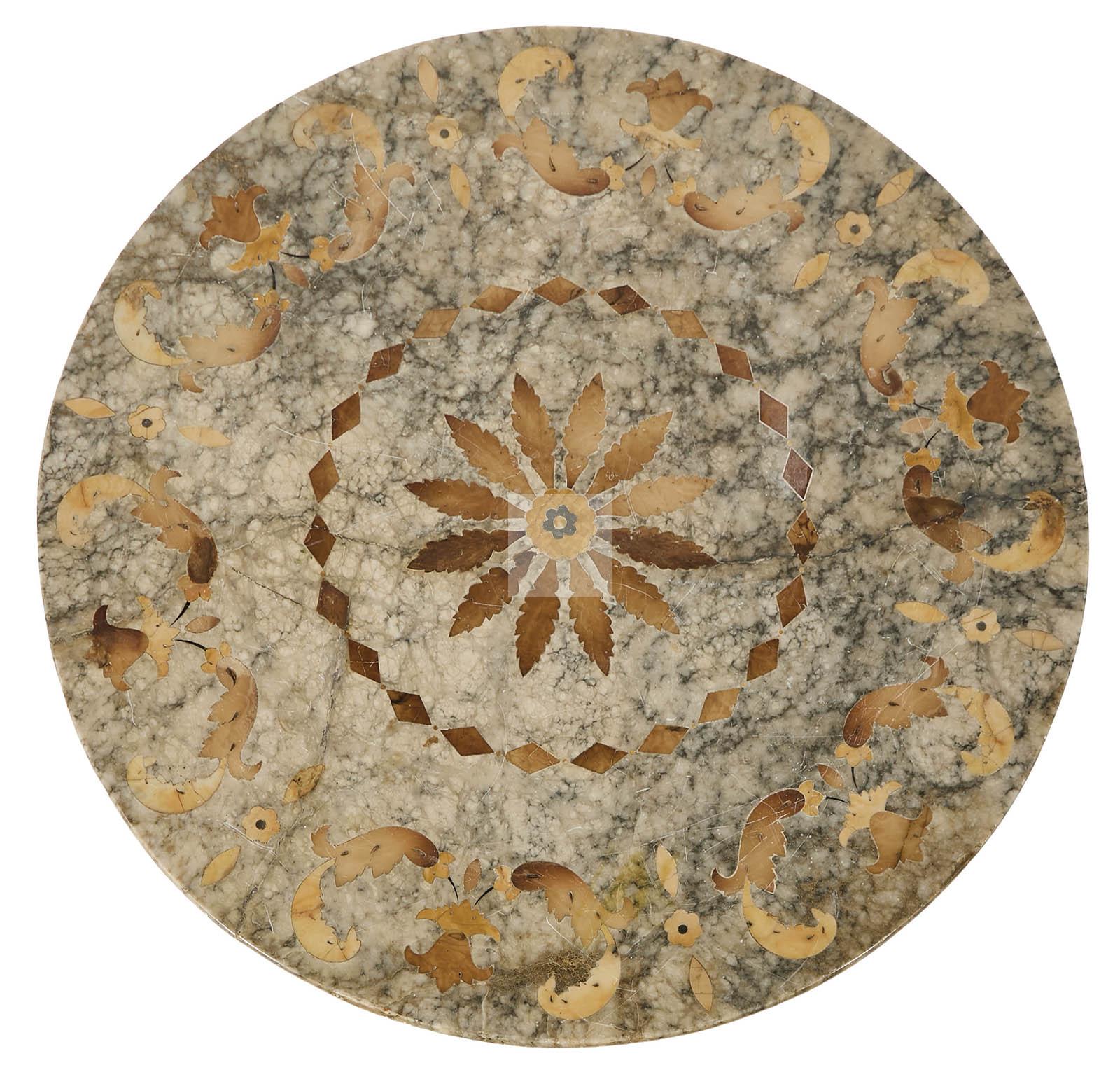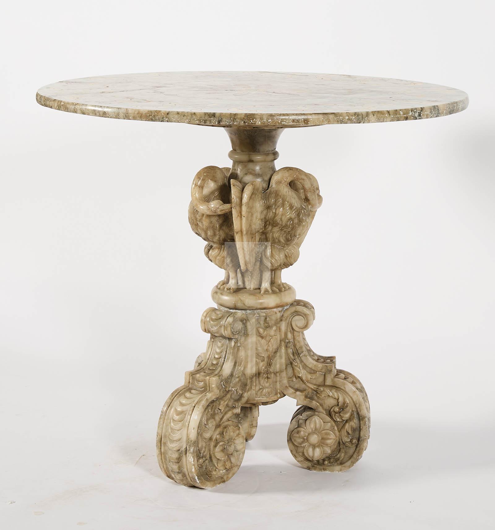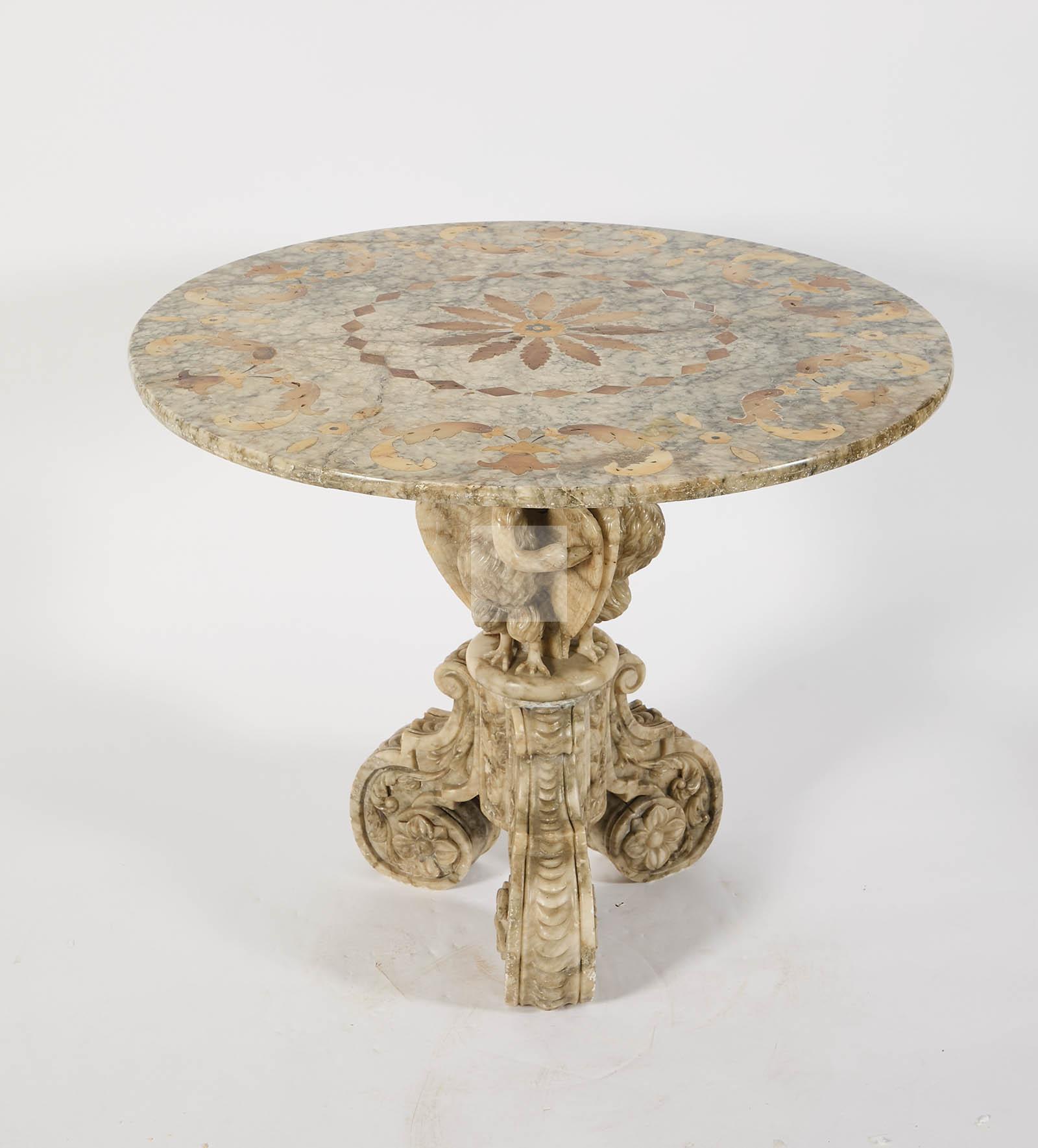 Lot n°548 - 548 Guéridon en albâtre et albâtre sculpté à plateau marqueté rayonnant à motifs