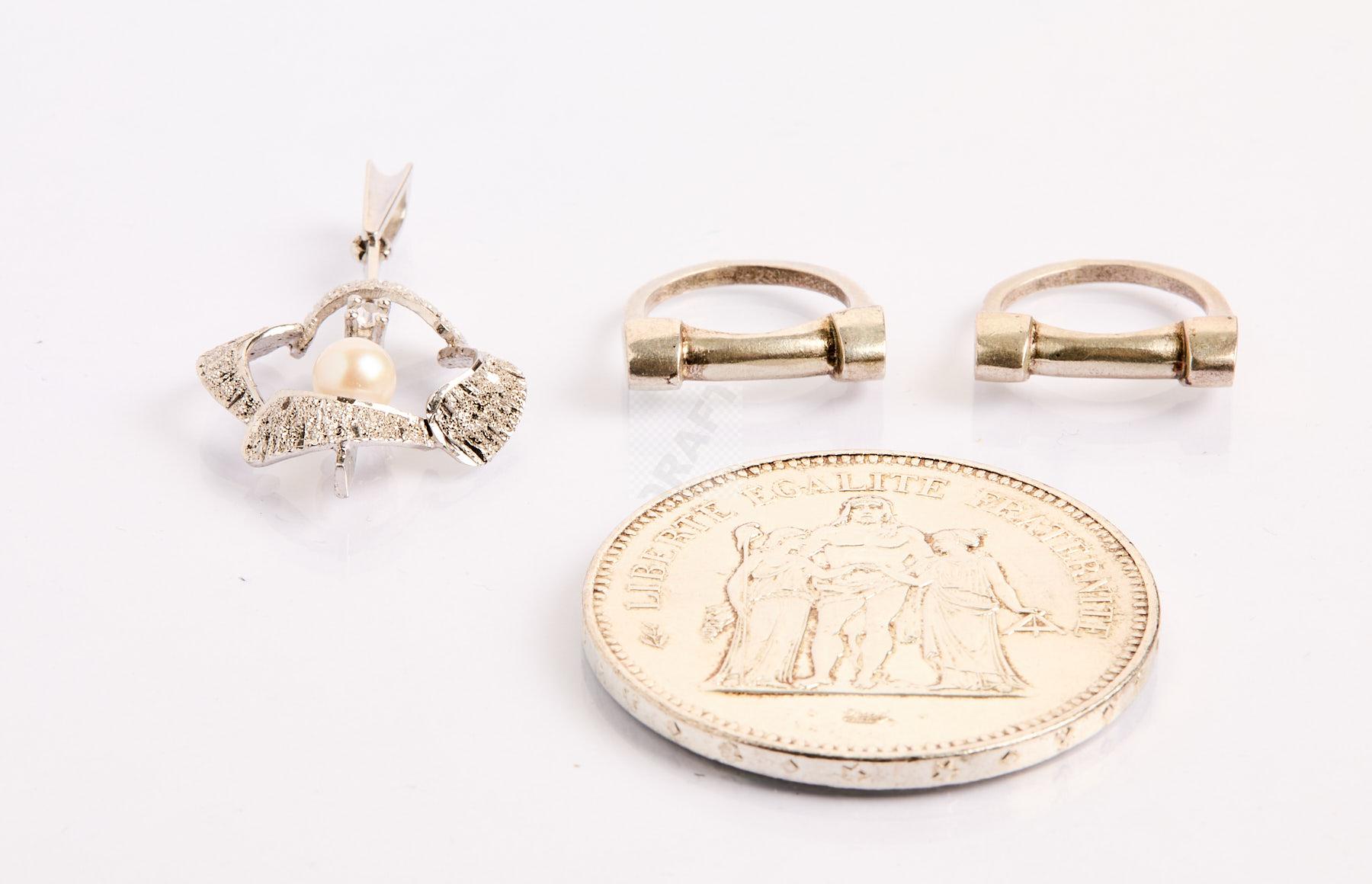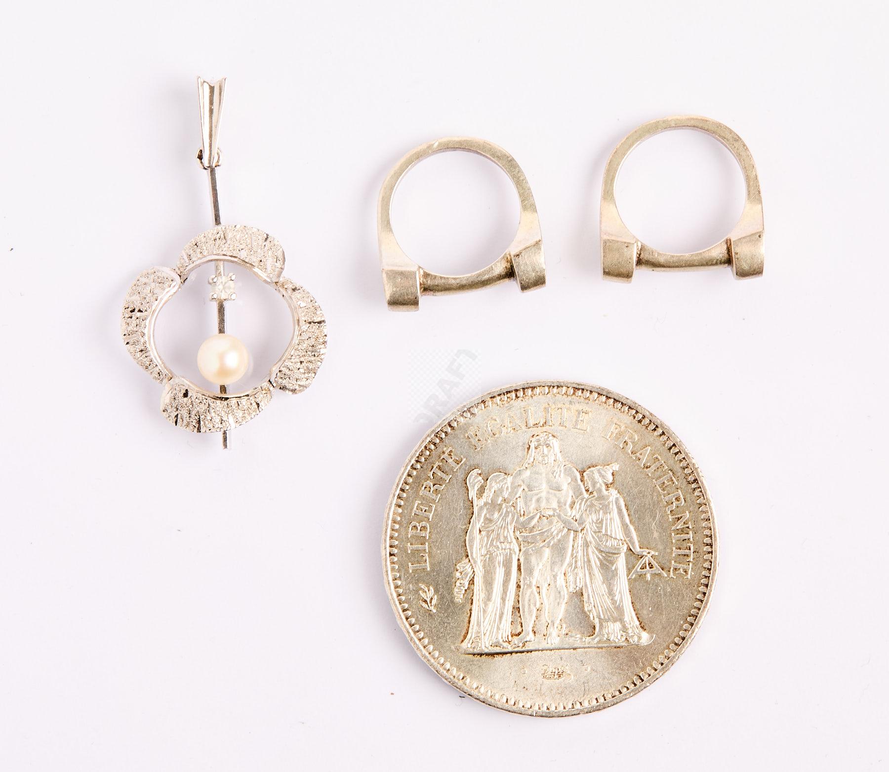 9 Lot argent : Pièce en argent 900 ‰ de 50 F 1975, poids 30 g , on joint deux bagues étriers en argent 925 ‰ tour de doigt 49 poids 8,6 g et un pendentif floral stylisé en argent 900 ‰ orné d’une perle de culture de 6 mm et pierre blanche , poids brut 4,8 g