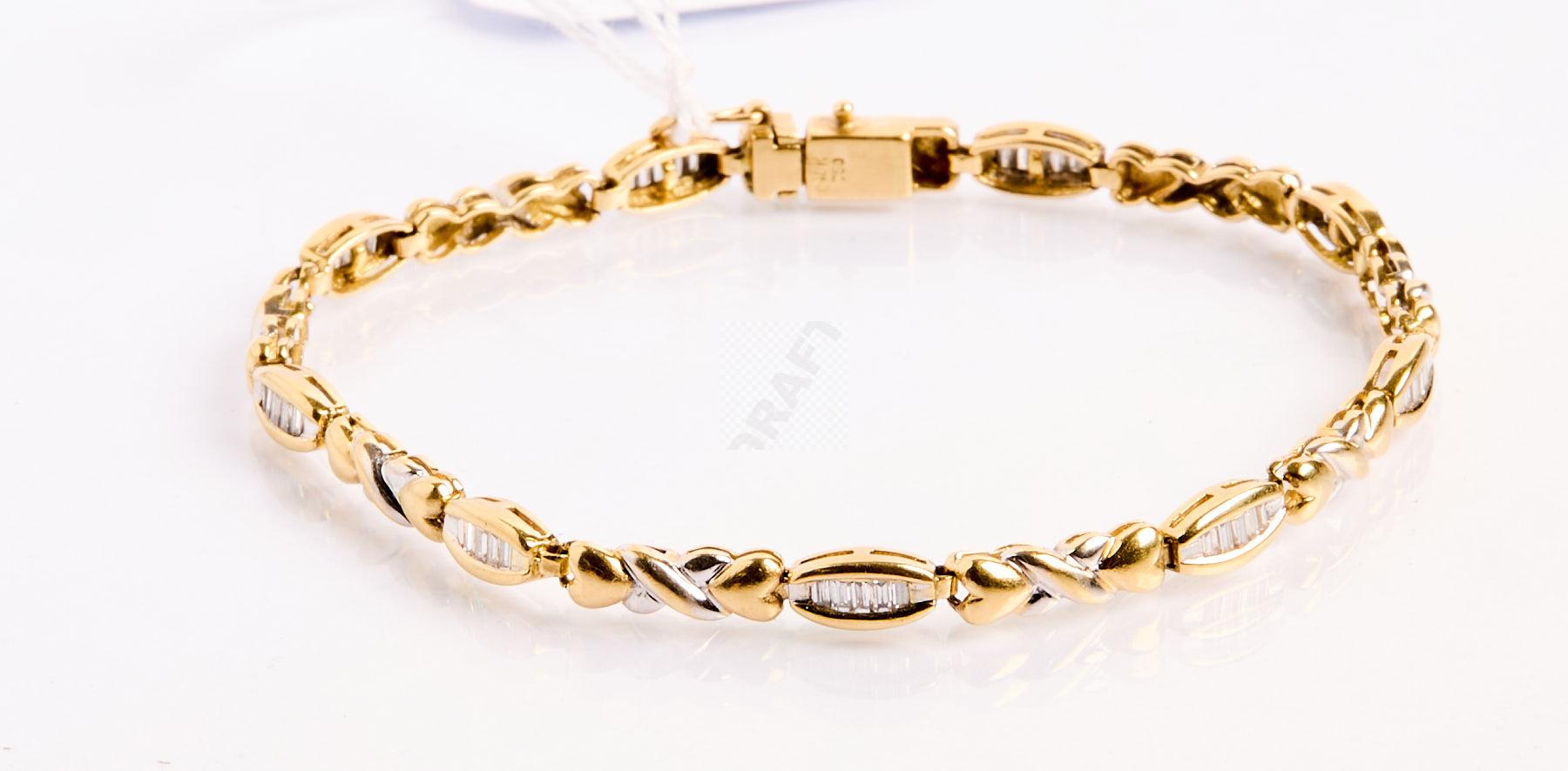 Lot n°73 - 73 Bracelet en or jaune et gris 750 ‰, mailles nouées et petits diamants baguett