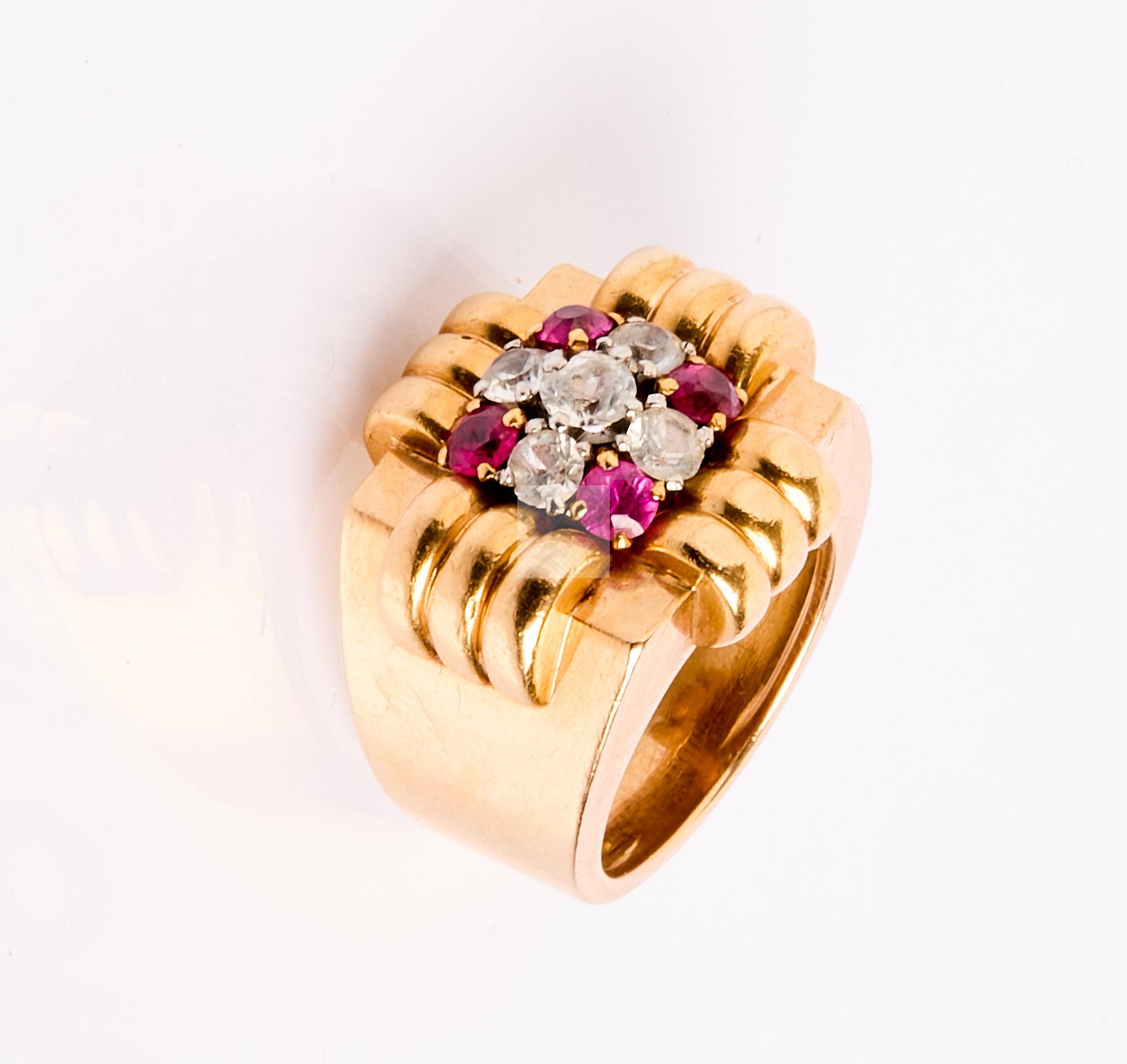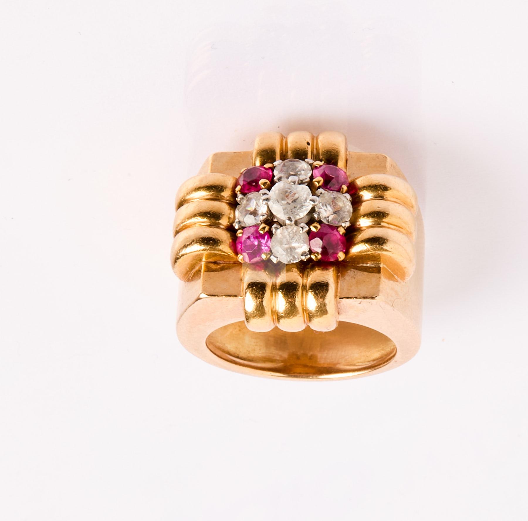 83 Bague tank en or jaune 750/1000 sertie de pierre blanches et pierres rouges, tour de doigt: 51