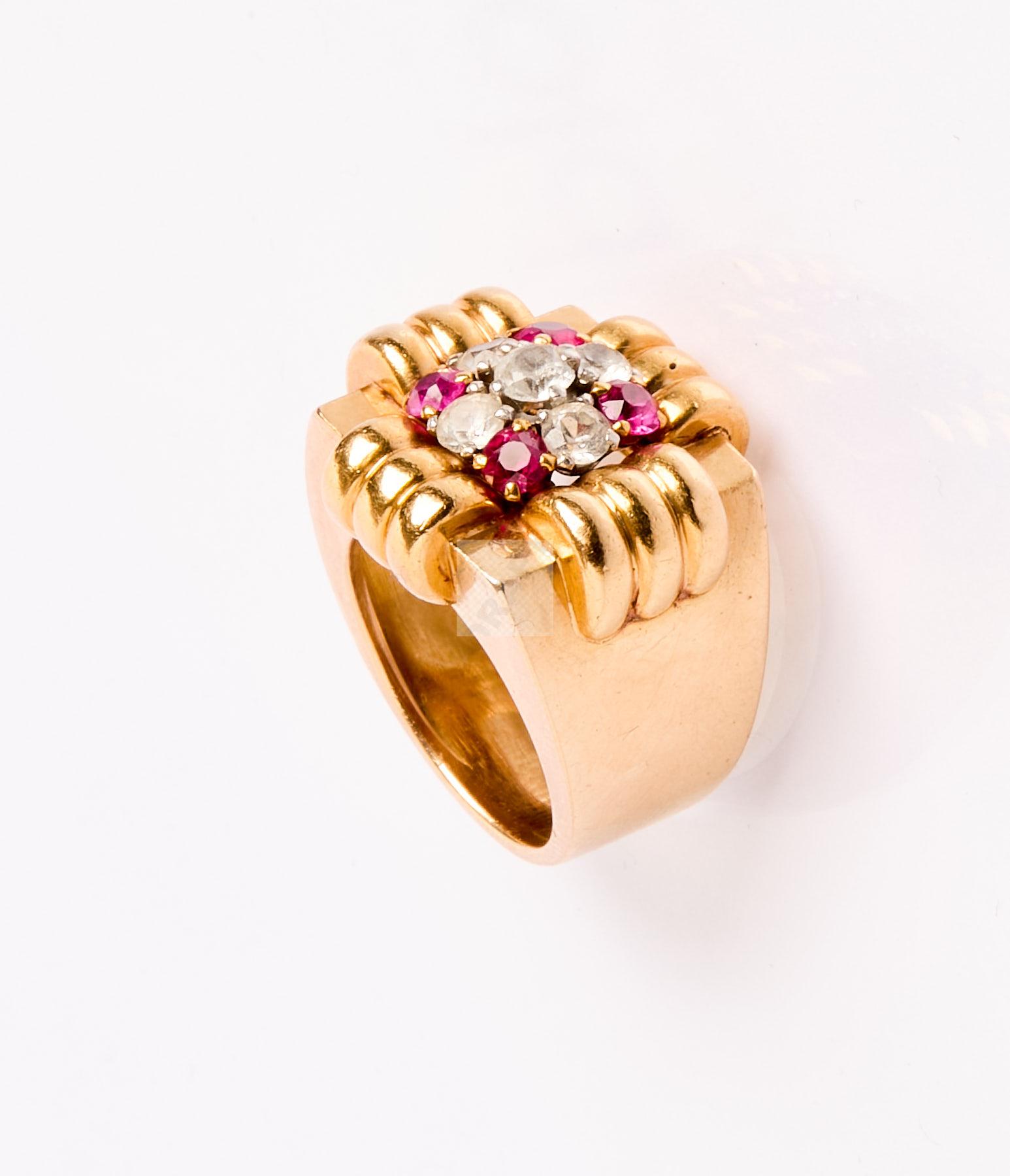 Lot n°83 - 83 Bague tank en or jaune 750/1000 sertie de pierre blanches et pierres rouges,
