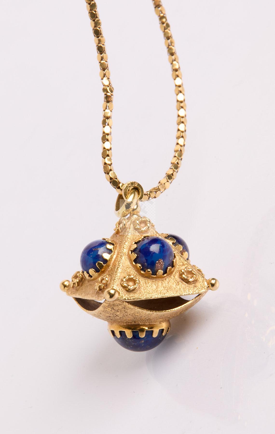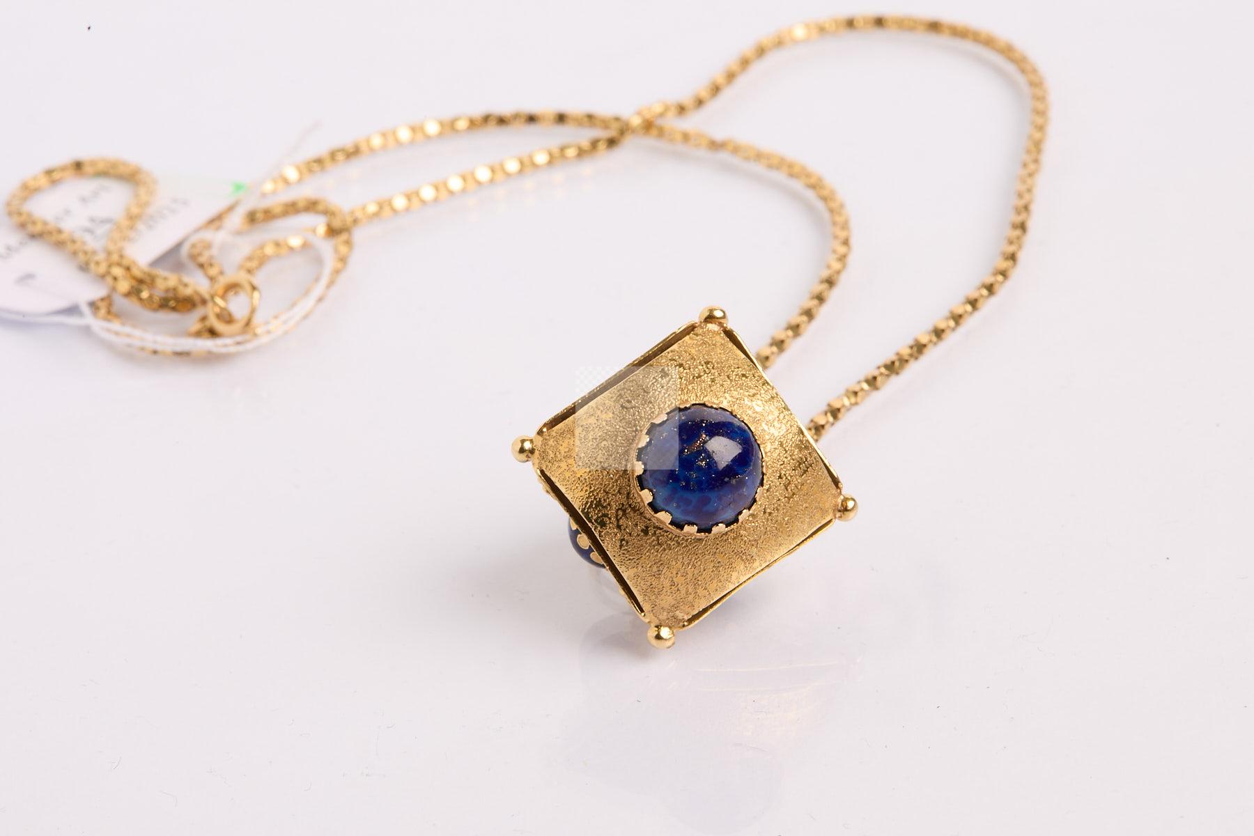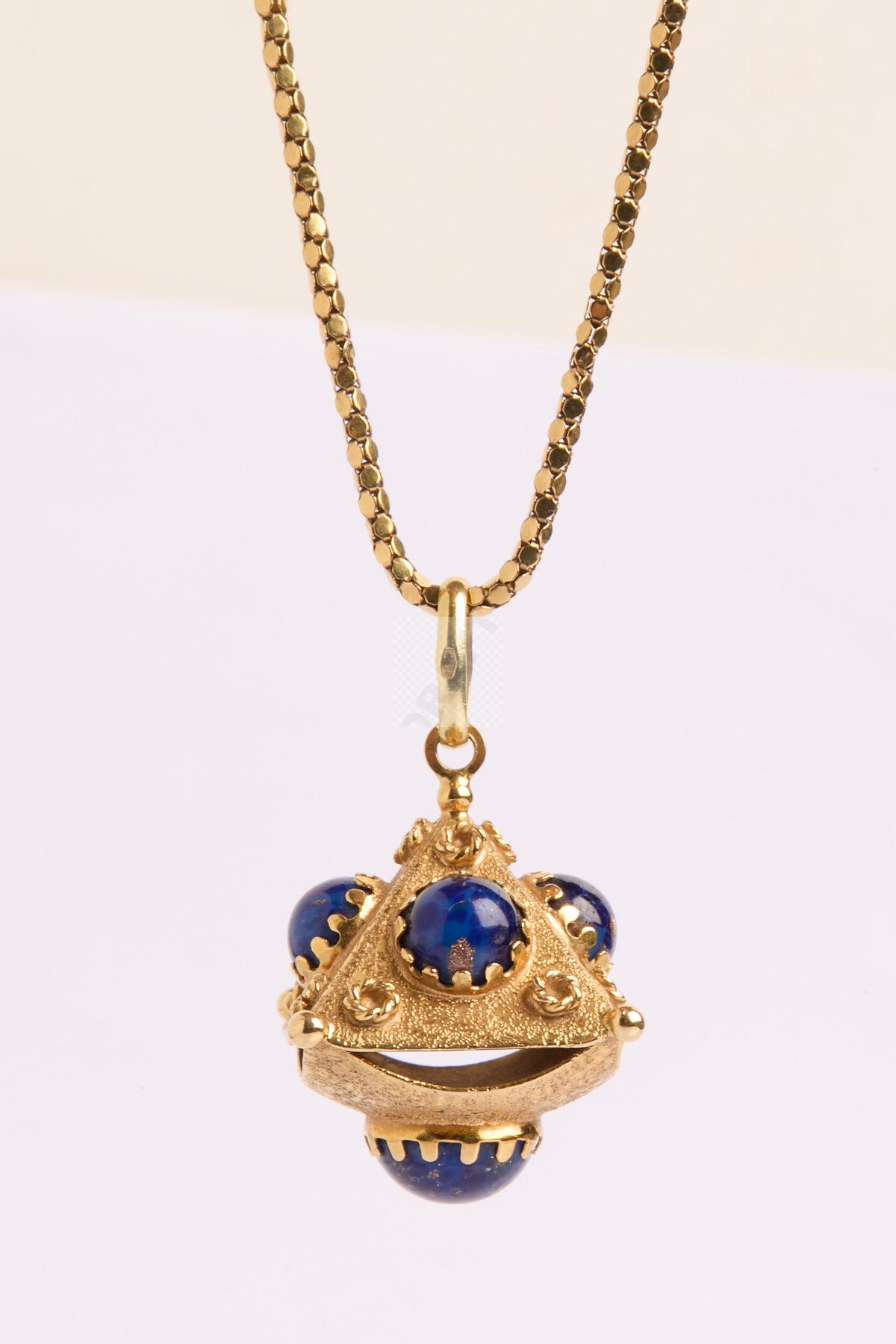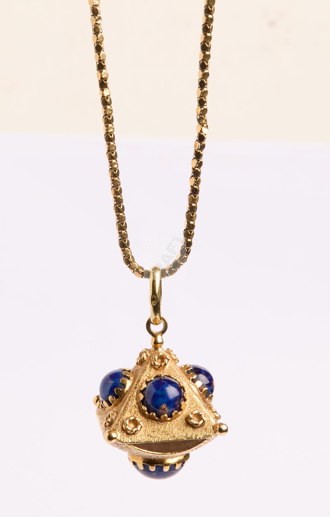 94 Chaine de cou en or jaune 750 ‰ maille sequin poids 5,8 g , on joint un pendentif en or jaune 750 ‰ orné de 5 cabochons de verre bleu aventuriné, poids brut 10,7 g
