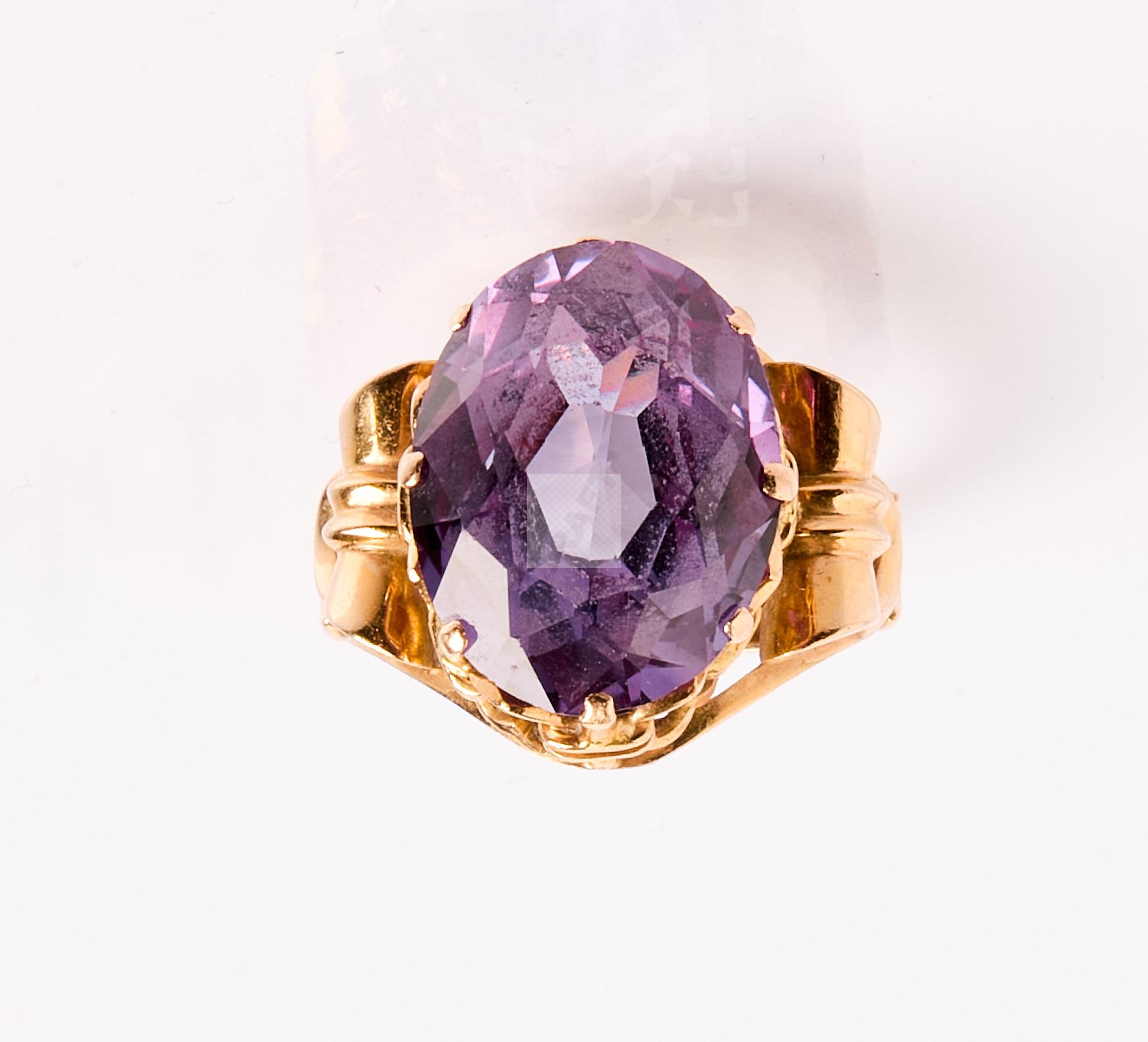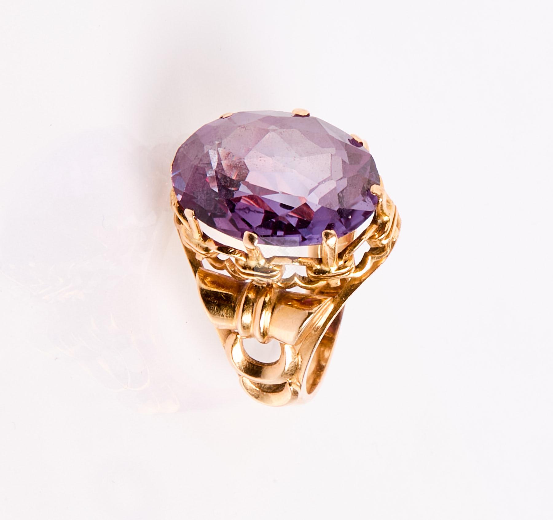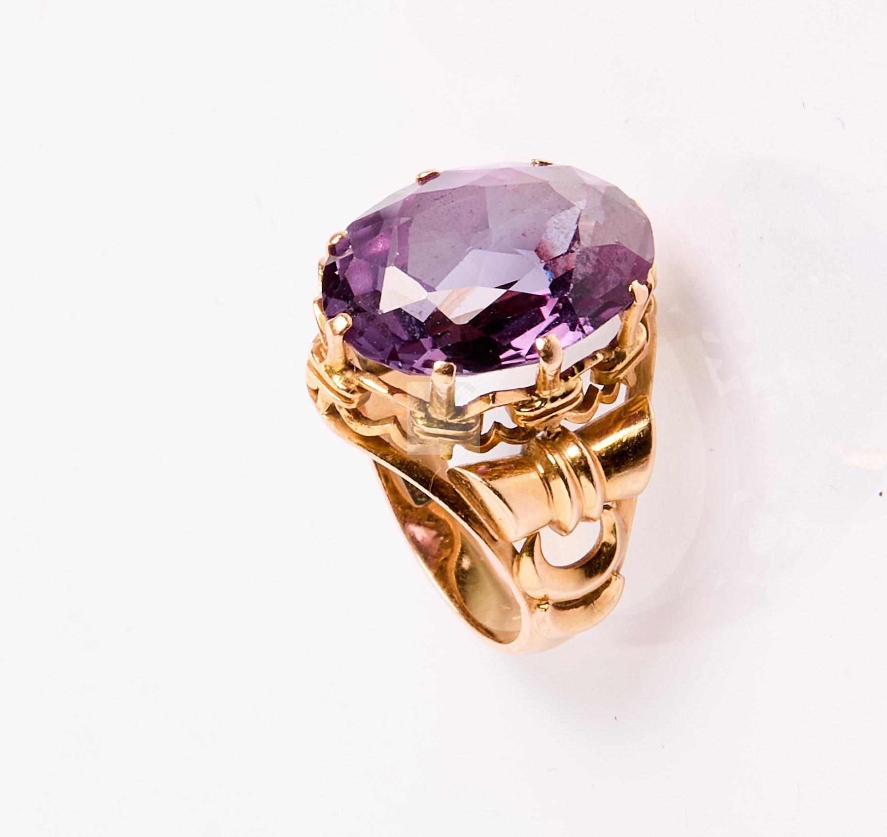 97 Bague en or jaune 750 ‰ sertie d’une pierre violette de 15 ct environ, tour de doigt 58, poids brut 9,4 g