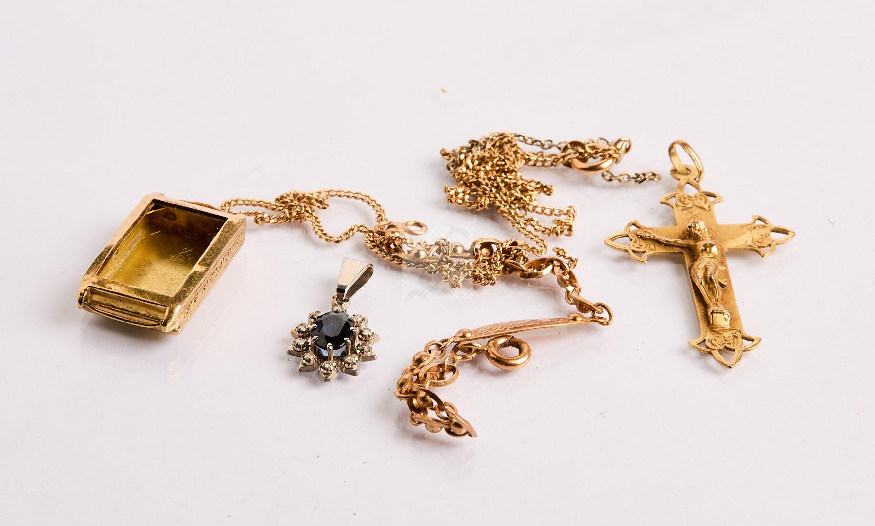 Lot n°108 - 108 Lot d’or 750/1000 comprenant: une croix régionale, un pendentif saphir, chai