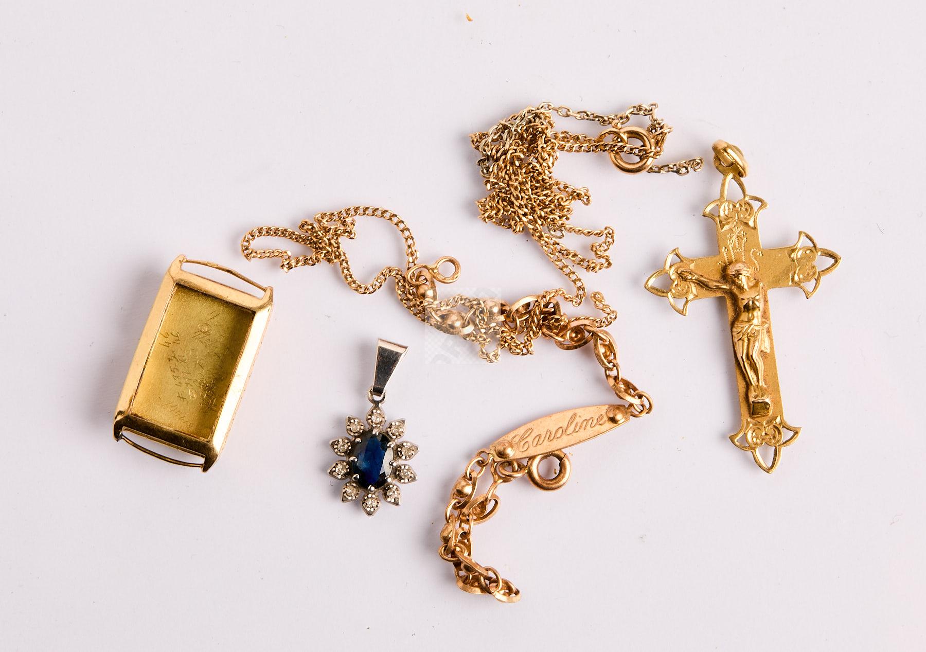 108 Lot d’or 750/1000 comprenant: une croix régionale, un pendentif saphir, chainette et élément de chainette et gourmette bébé, un boitier de montre. 12.9g brut