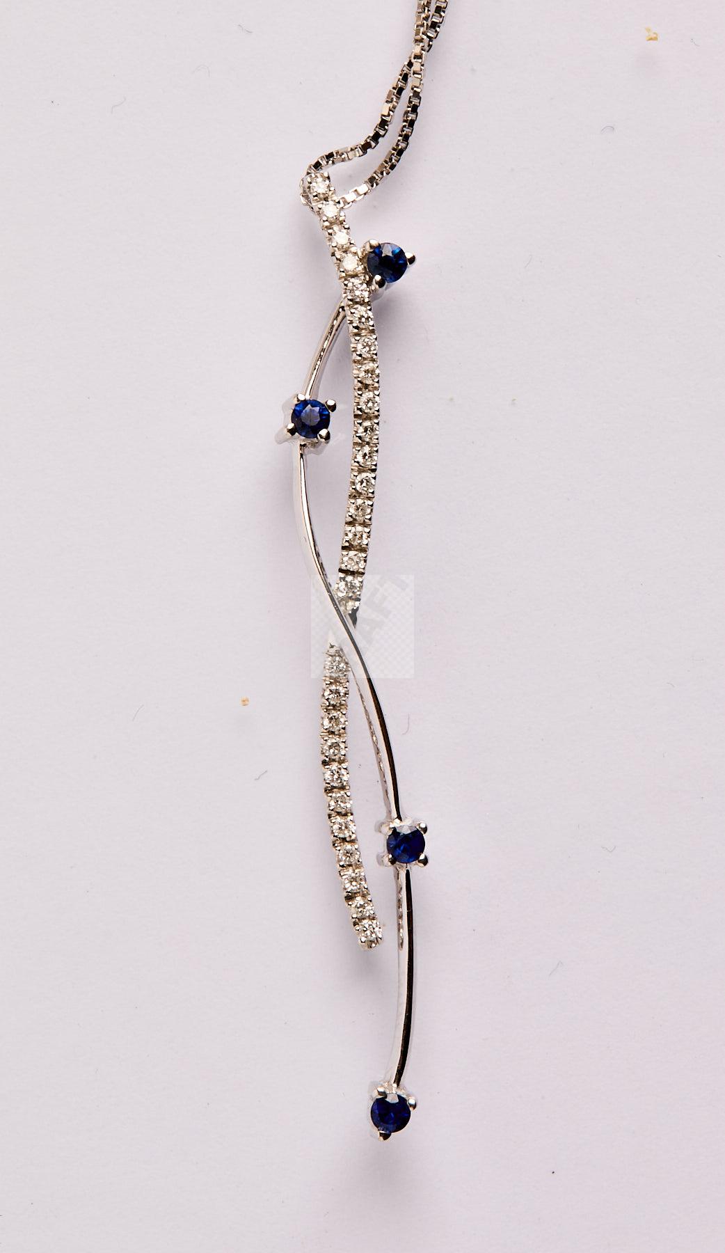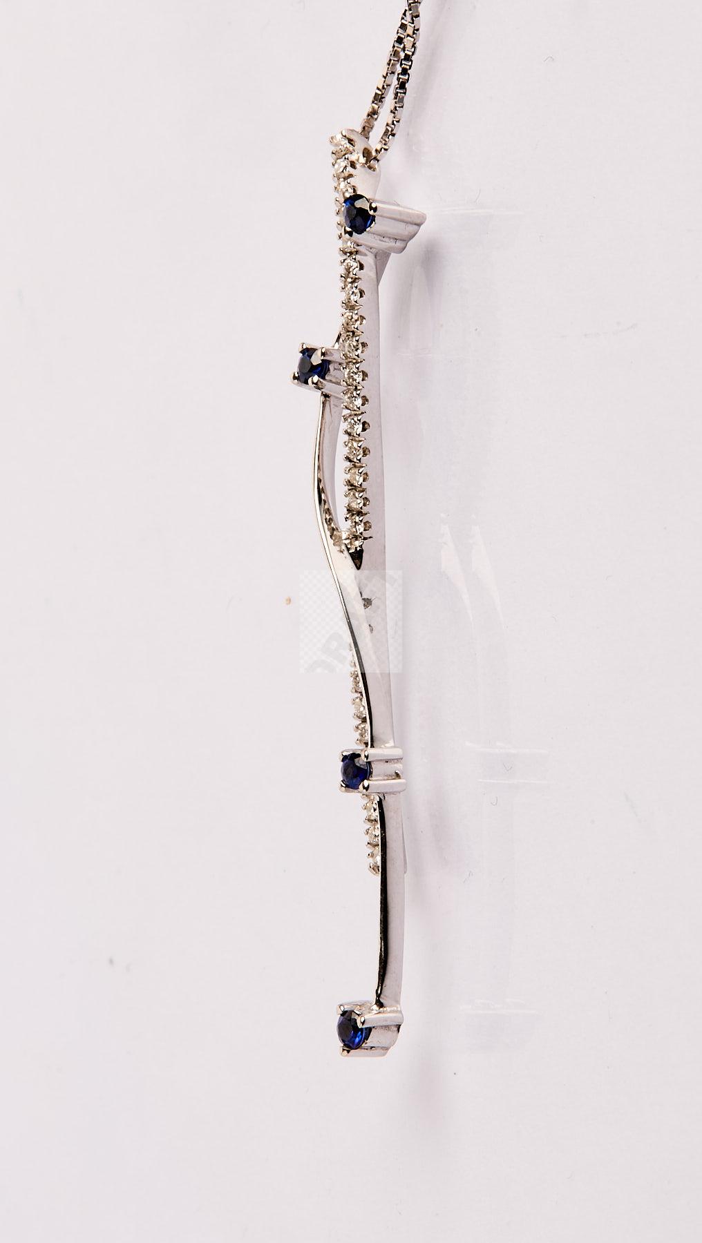 118 Chaine de cou en or gris 750‰ 41 cm et son pendentif en or gris 750‰ 5 cm souligné de diamants et saphirs, poids 4,4 g