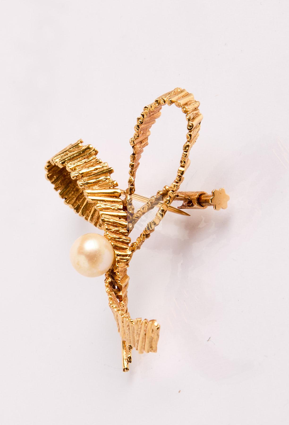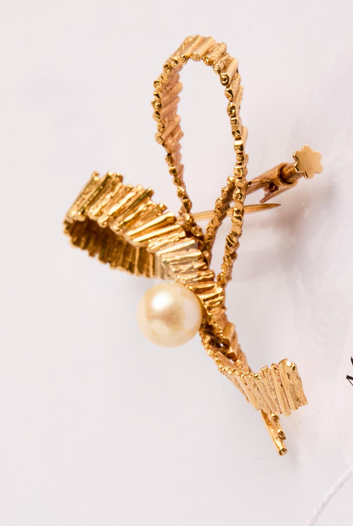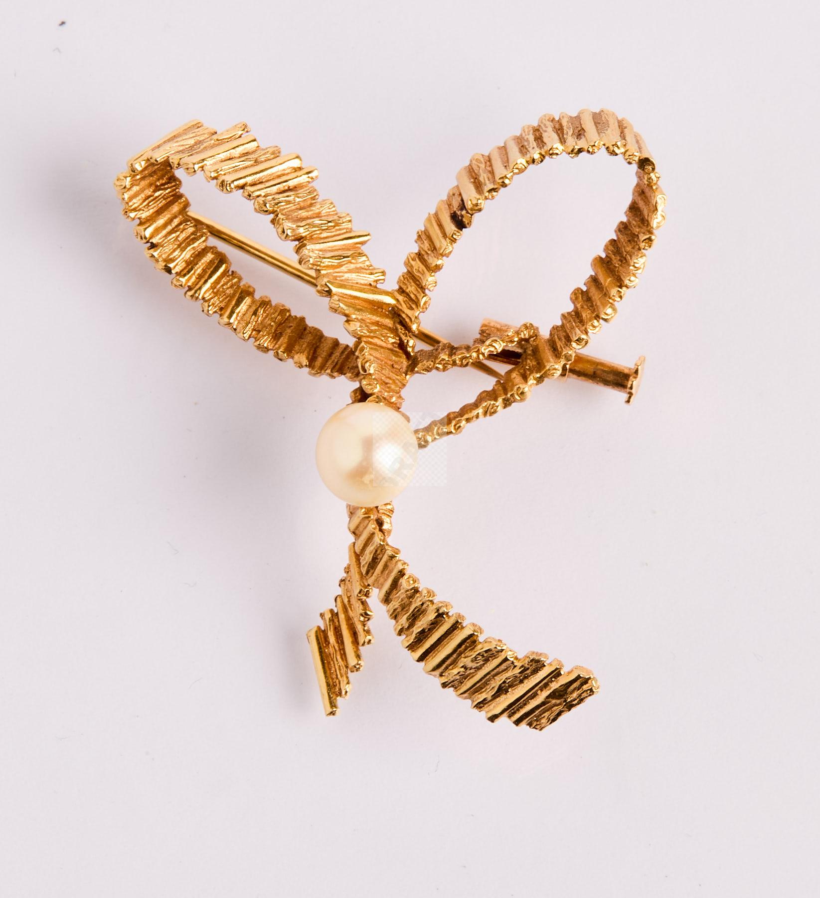 Lot n°139 - 139 Broche nœud des années 60 en or frisé jaune 750 ‰, ornée d’une perle de cult