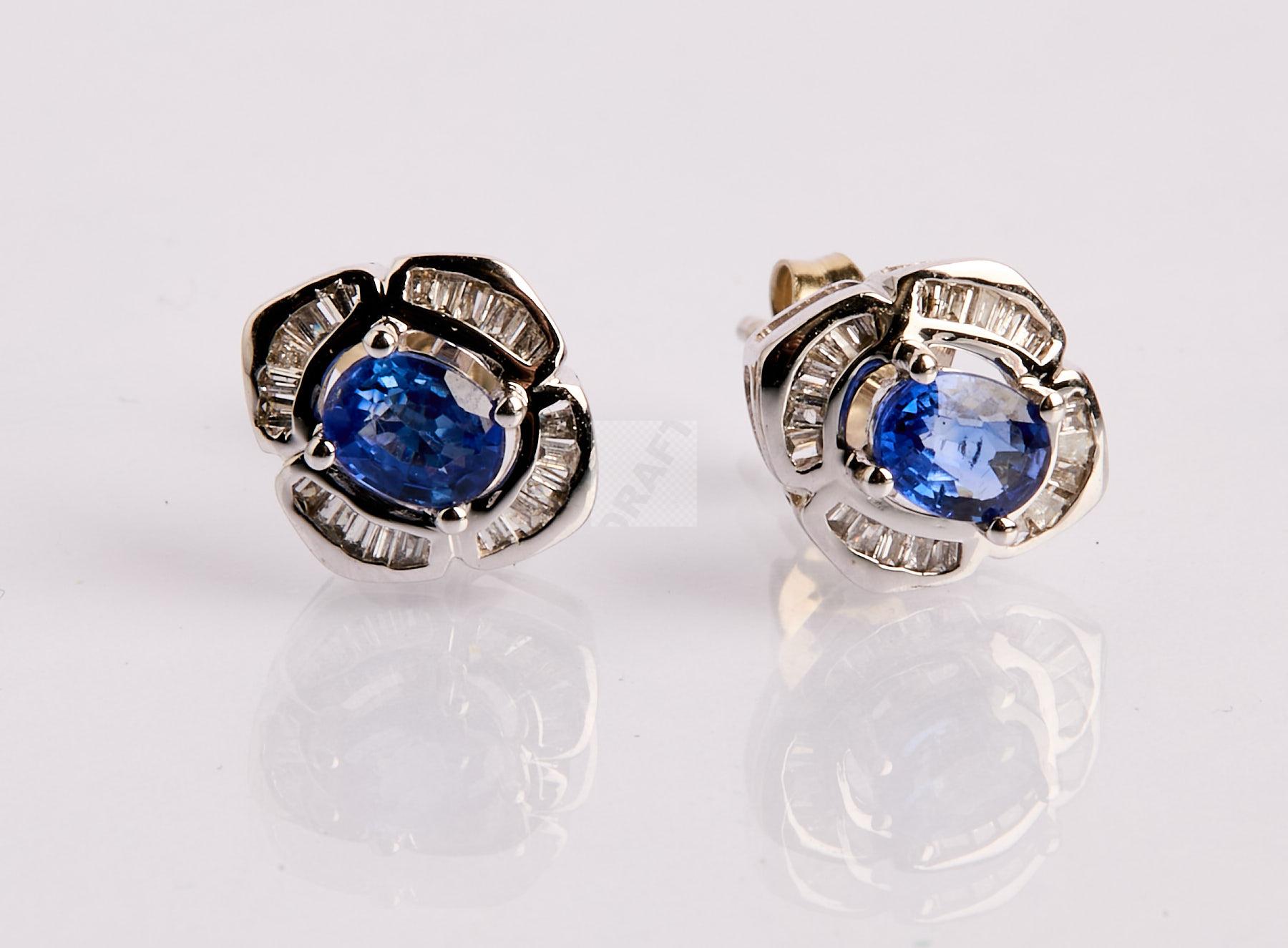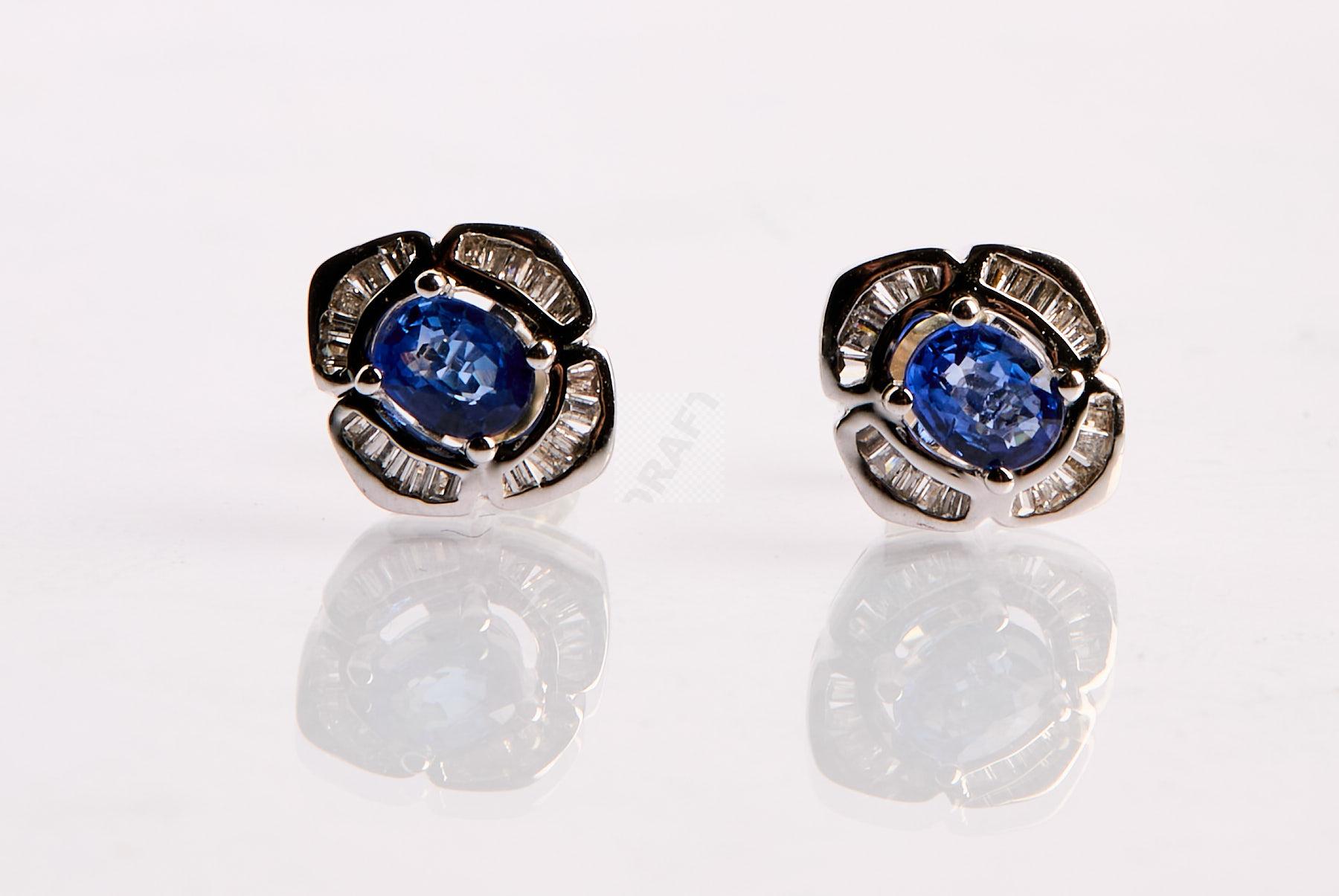 142 Paire de puces d’oreilles en or gris 750/1000 sertie de saphirs dans un entourage de diamants taille baguettes.
