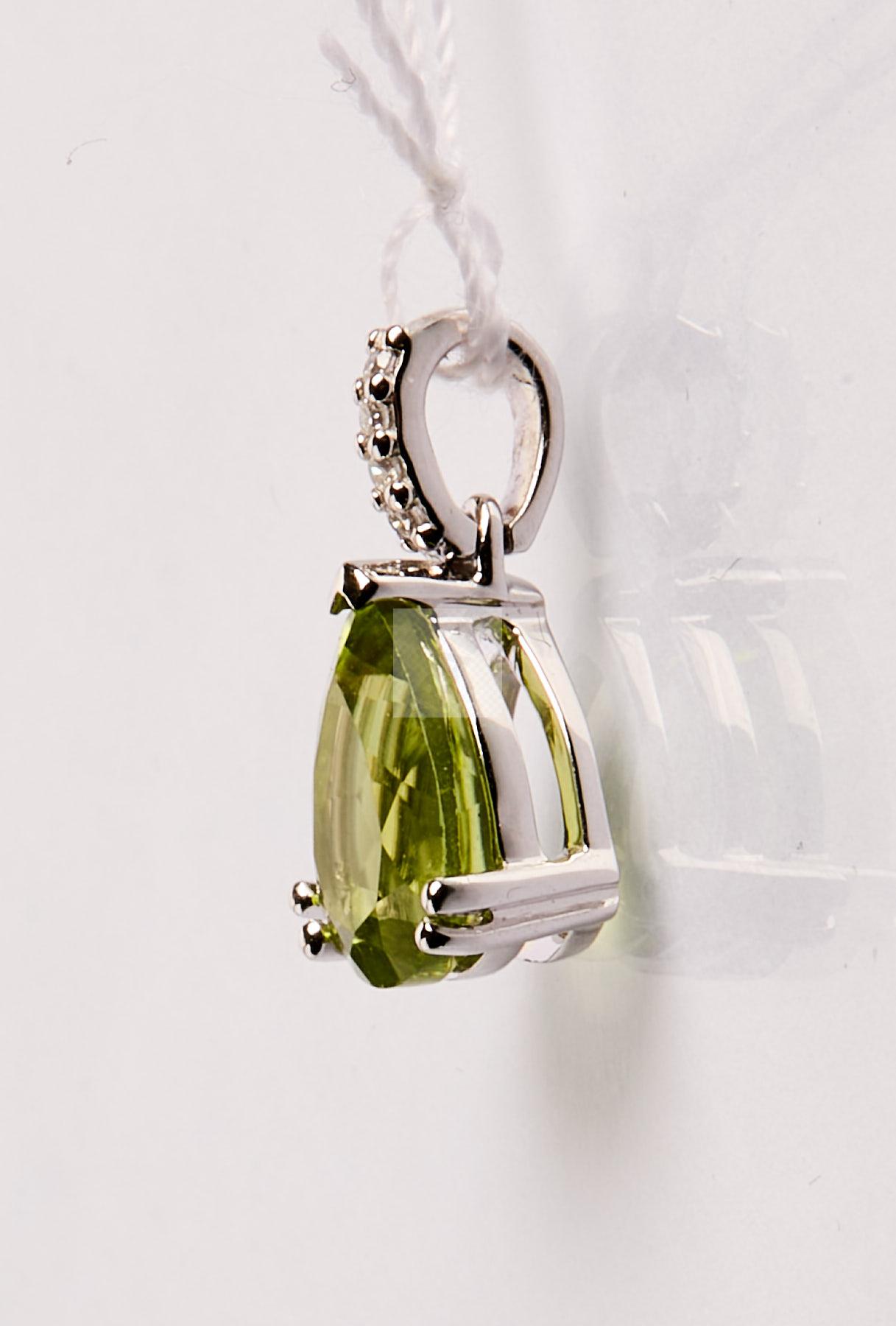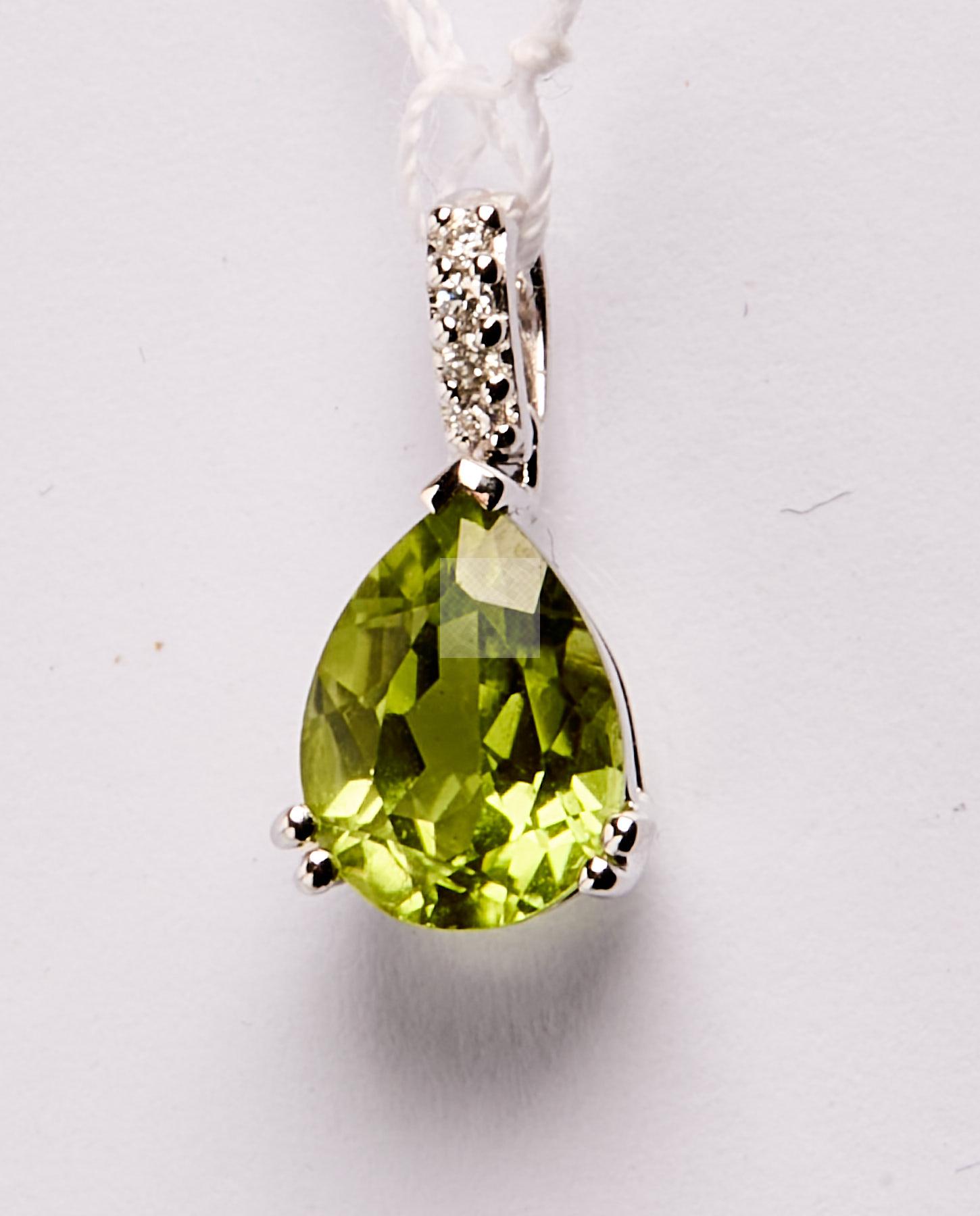 Lot n°144 - 144 Pendentif en or gris 750/1000 sertie d’un péridot taillé en poire surmontée