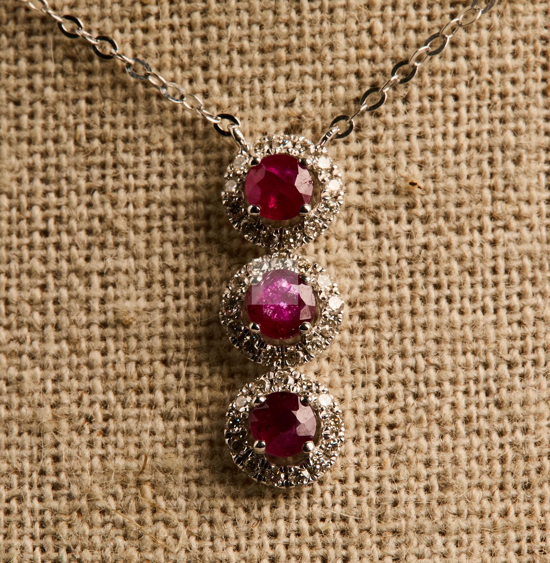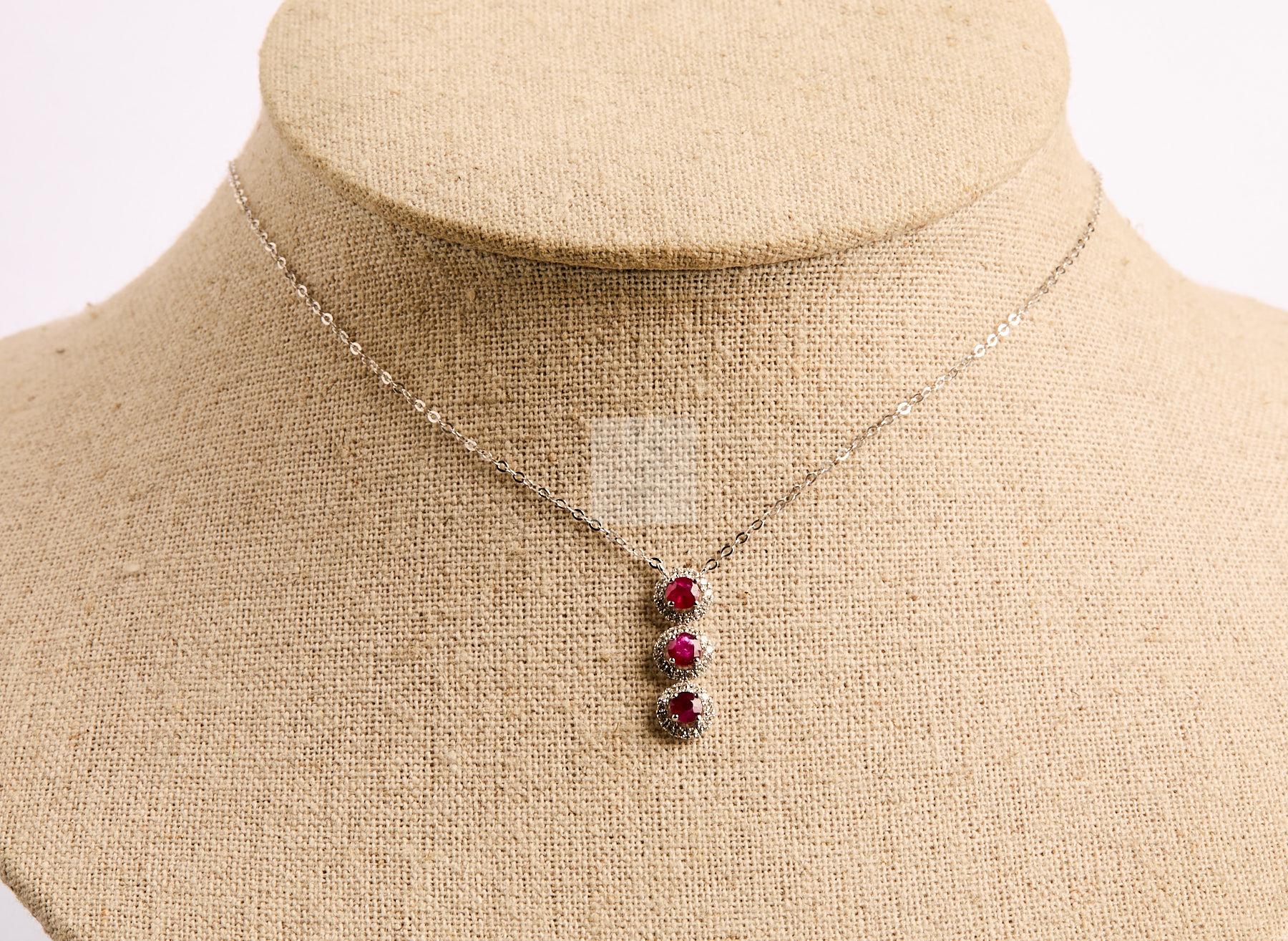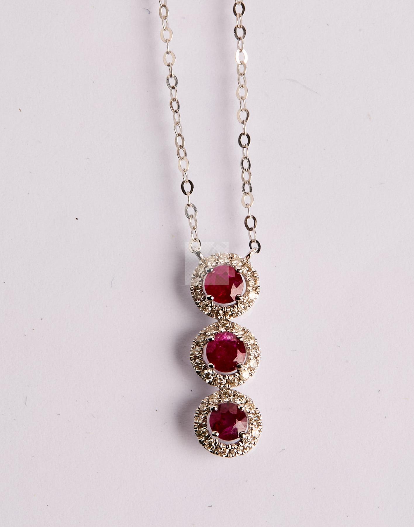 145 Pendentif trilogie et sa chaine en or gris 750/1000 sertie de trois rubis ronds dans un entourage de diamants taille brillanté.