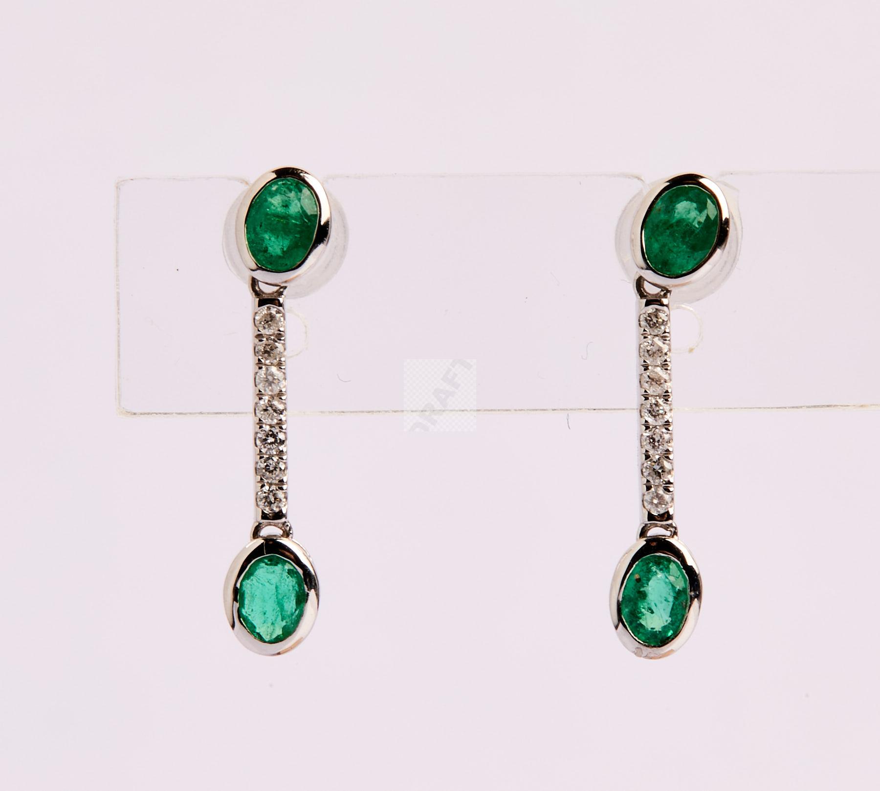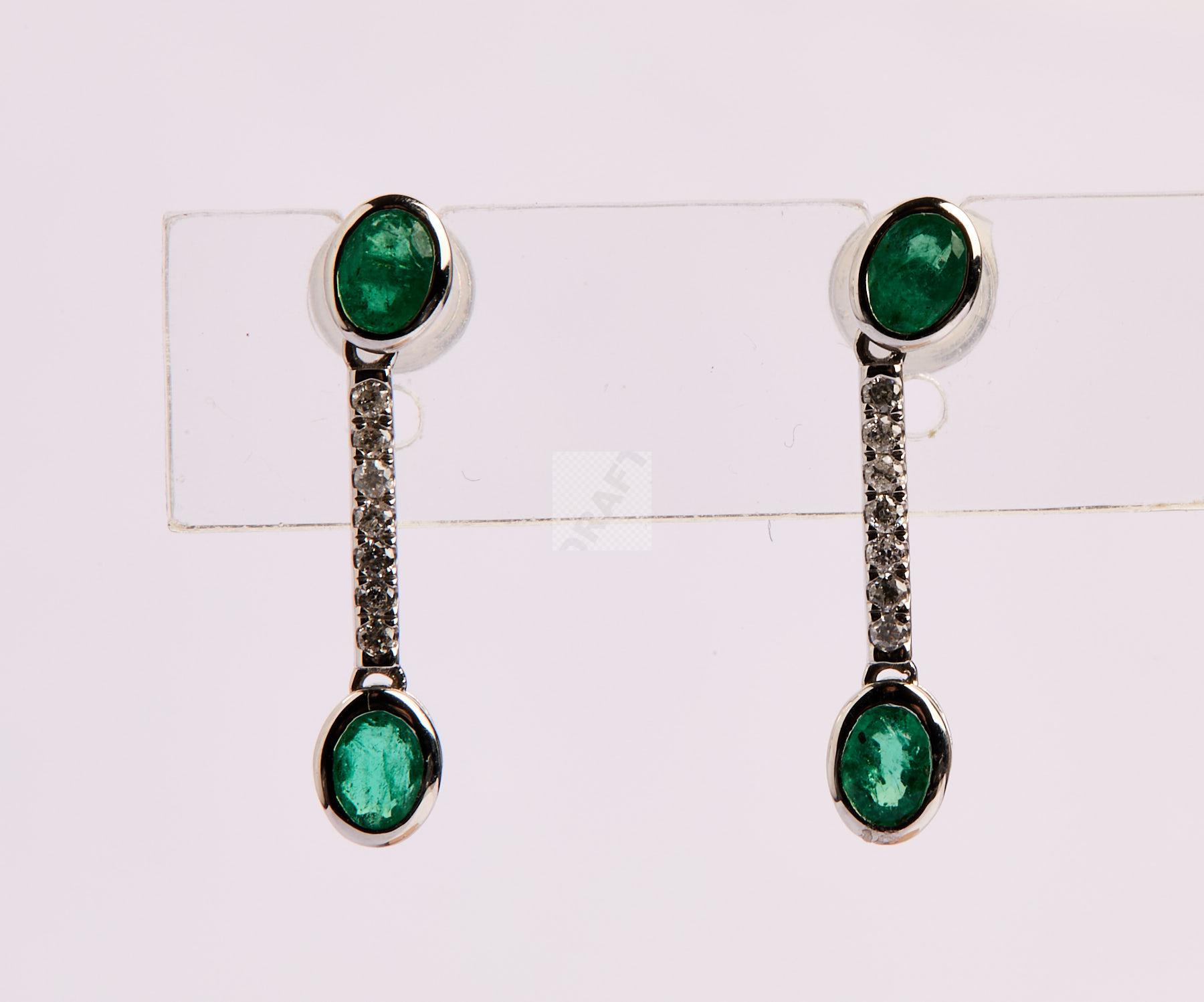 Lot n°147 - 147 Paire de pendants d’oreilles en or gris 750/1000 sertie de deux émeraudes en