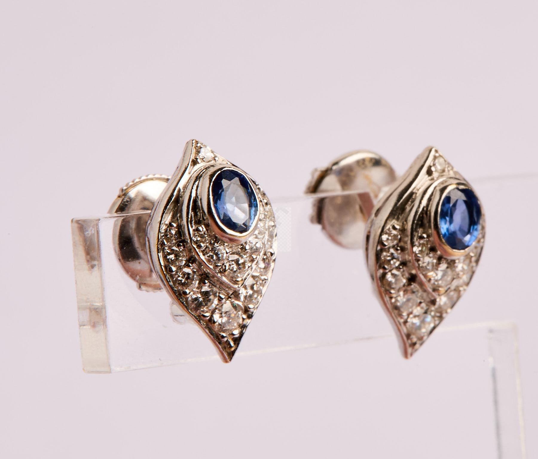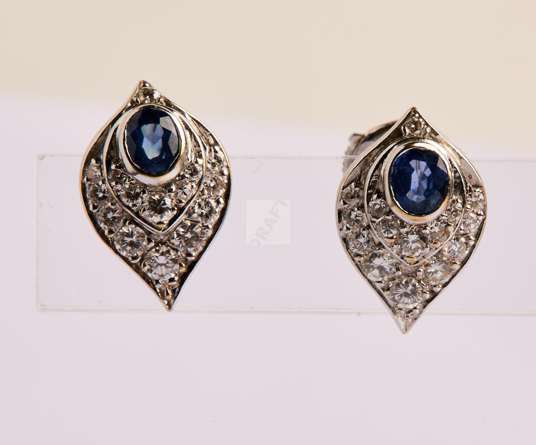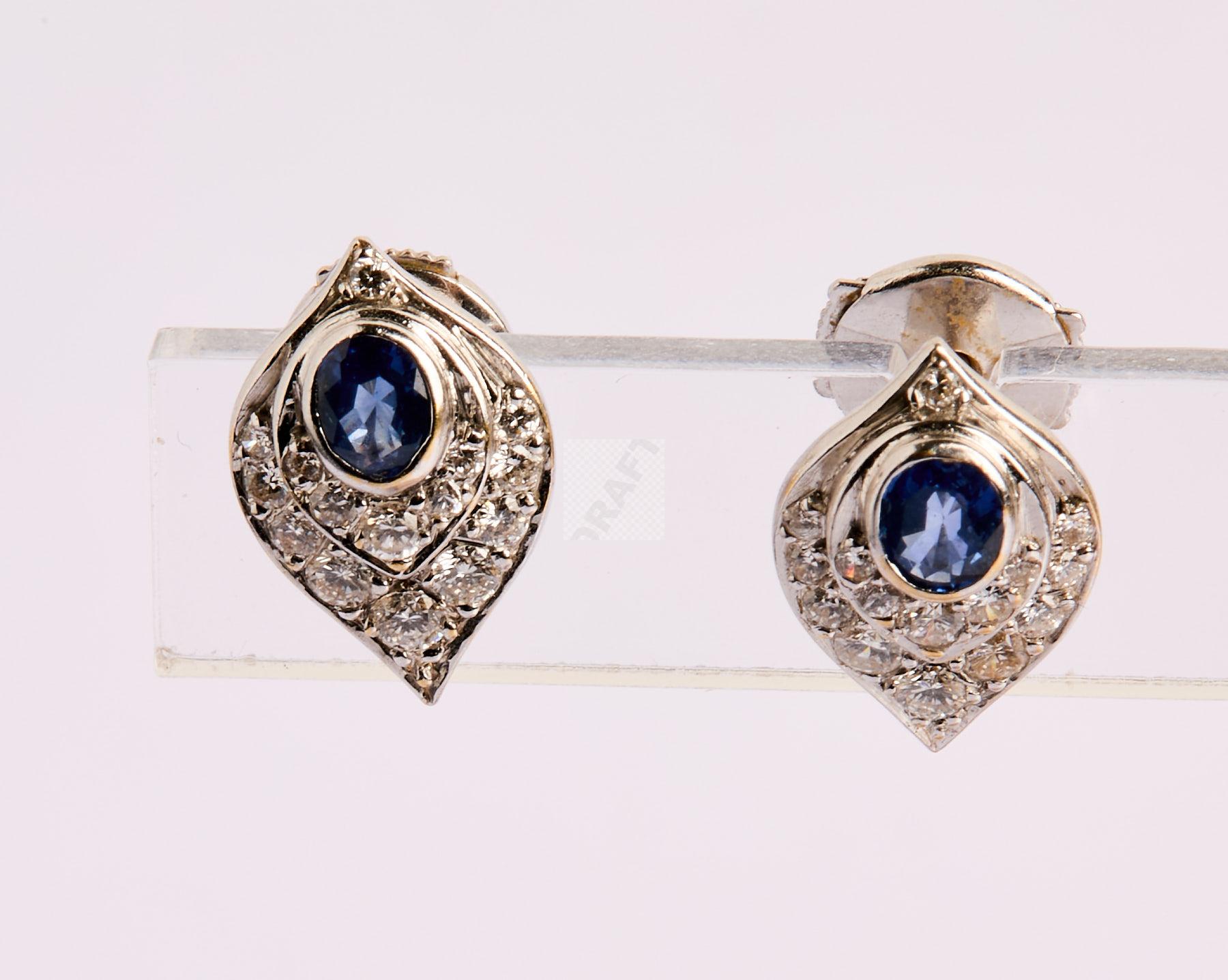 183 Paire de boucles d’oreilles sur or gris 750 ‰ pavées de petits diamants et saphirs, poids 3,52 g
