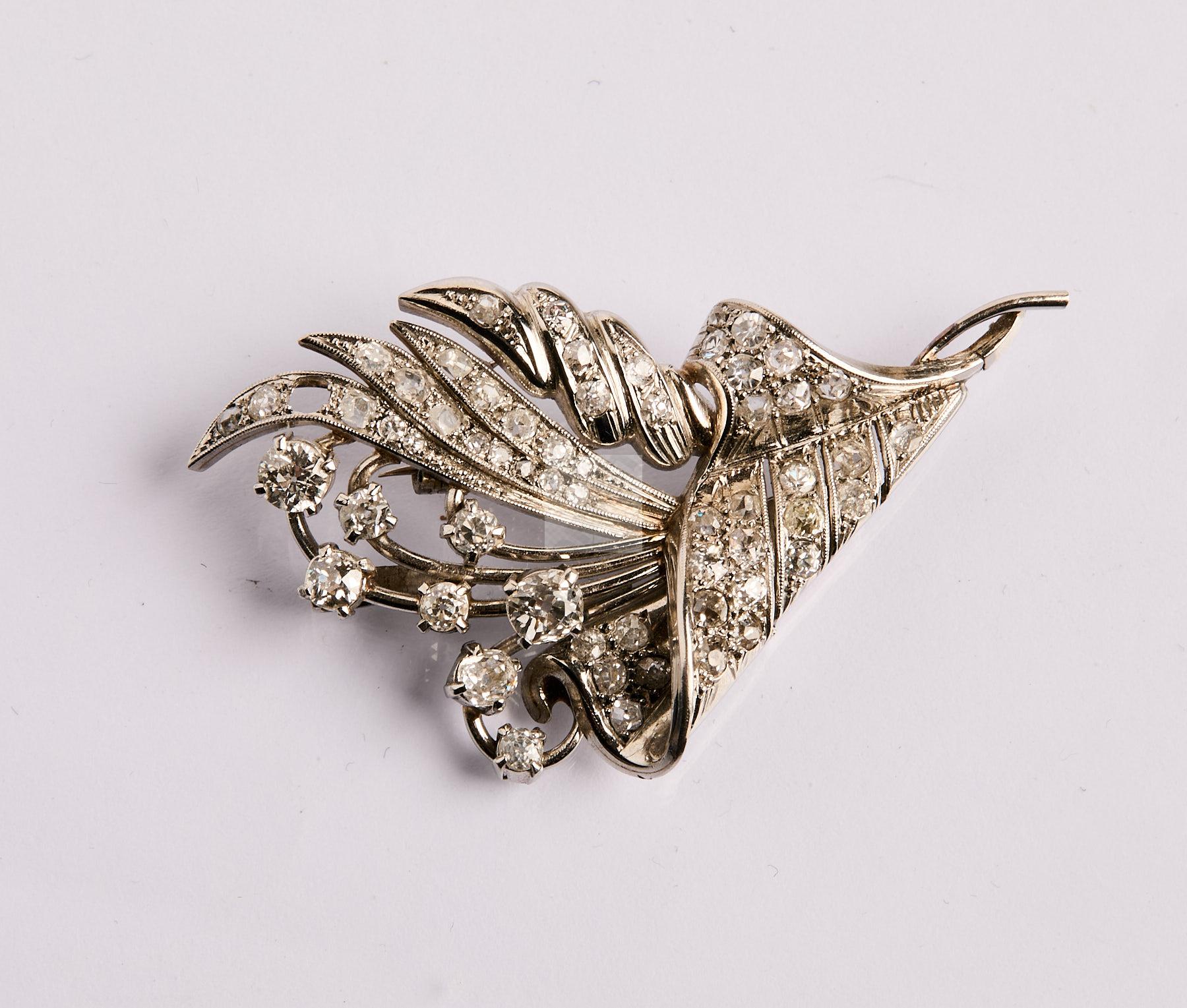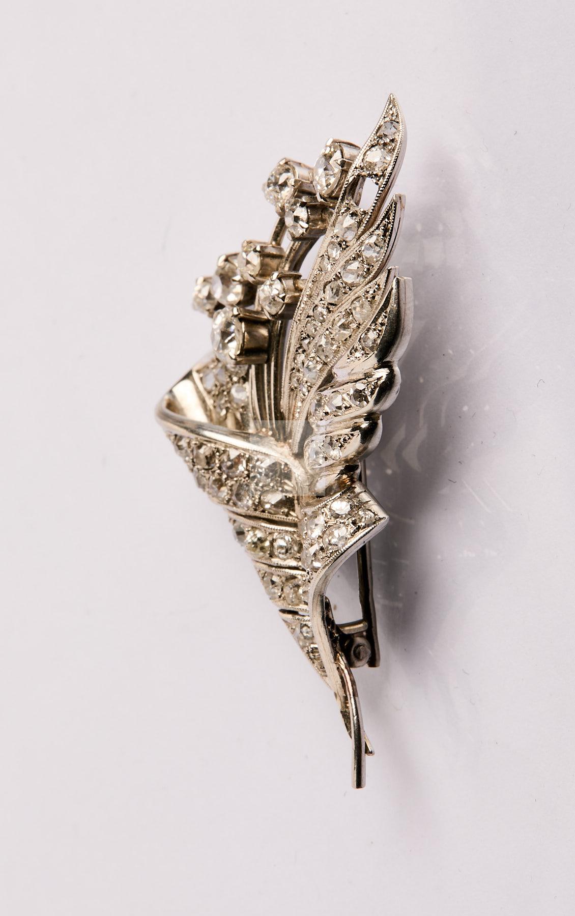 187 Bouquet de diamants sur or gris 750 ‰, systèmes pendentif ou broche, pavé de diamants de taille ancienne , 55 mm environ, années 40, poids 12,7 g