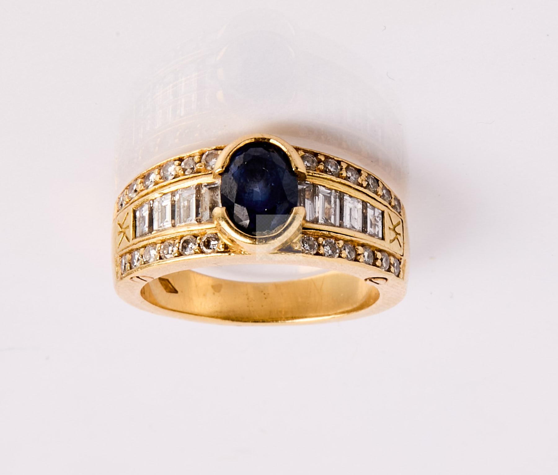 188 KORLOFF : Bague bandeau en or jaune 750 ‰ sertie d’un saphir épaulé de diamants baguettes encadrés de diamants ronds, tour de doigt 52, poids 8,7 g.