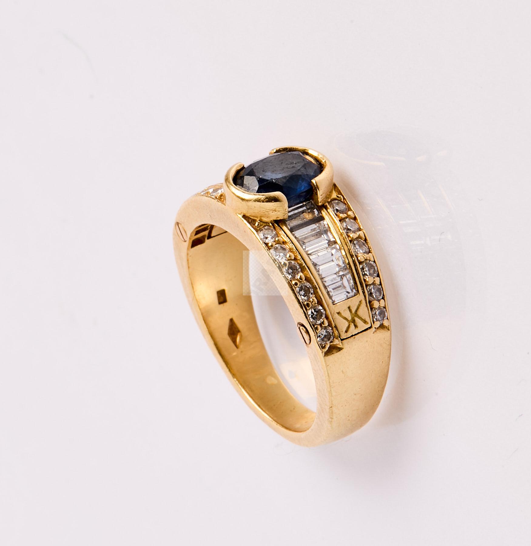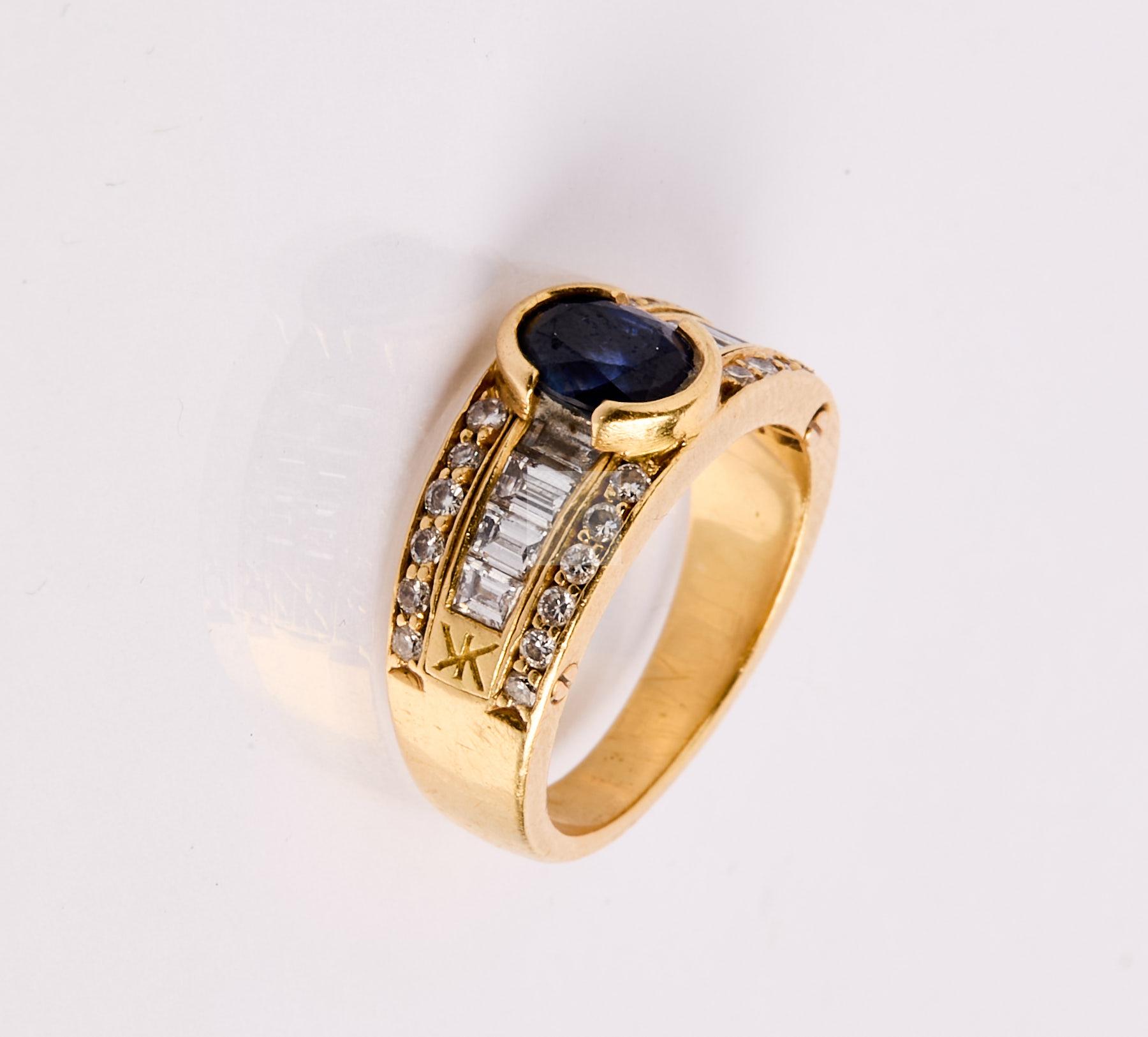 Lot n°188 - 188 KORLOFF : Bague bandeau en or jaune 750 ‰ sertie d’un saphir épaulé de diama