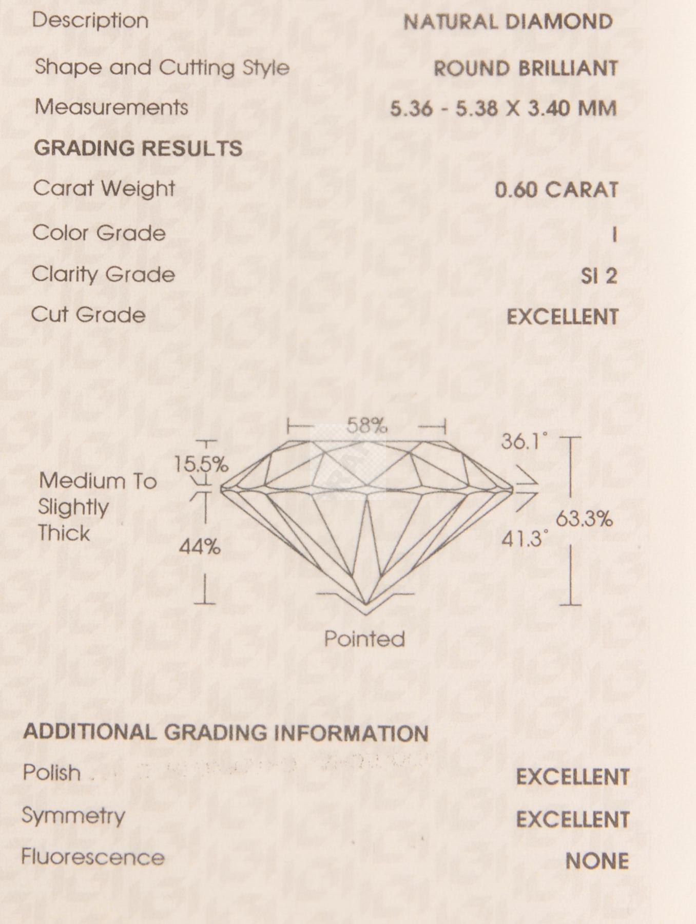 216 Diamant sous scellé d’un poids de 0.60 ct I SI2, avec son rapport d’analyse du IGI.