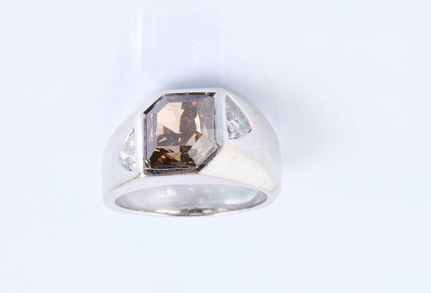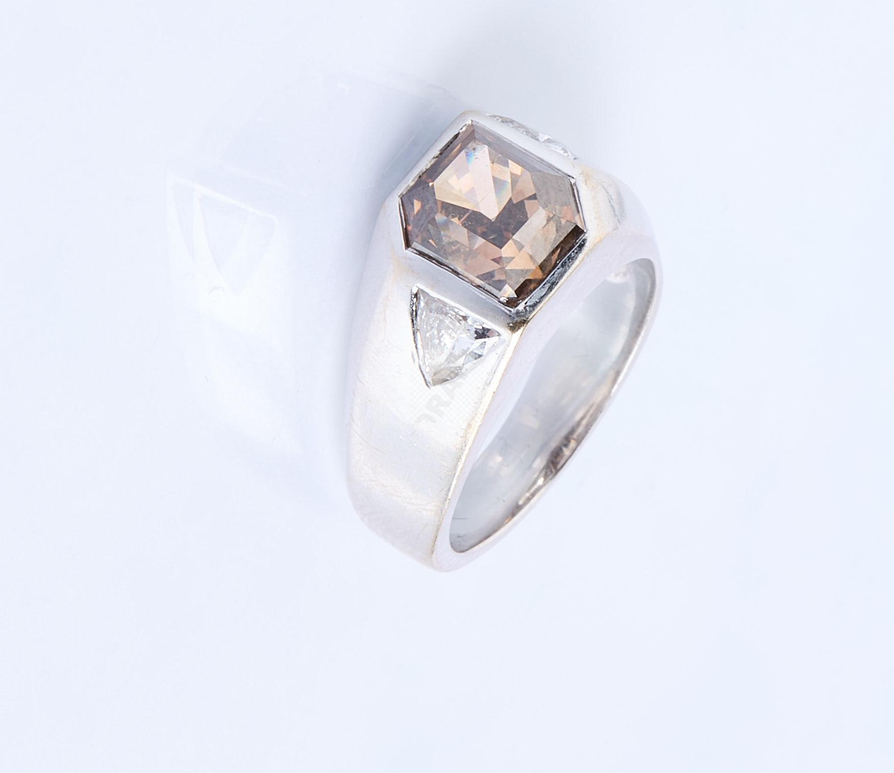 219 Bague chevalière en or gris sertie d’un diamant de taille rhombe d’un poidsestimé à 4 ct de couleur tabac, tour de doigt 58, poids 13,9 g