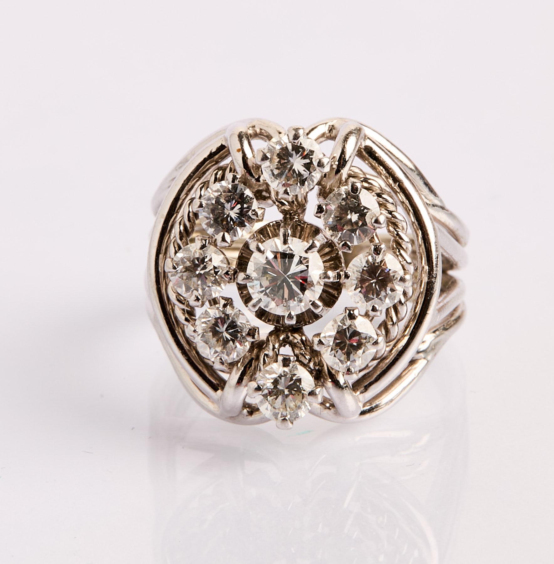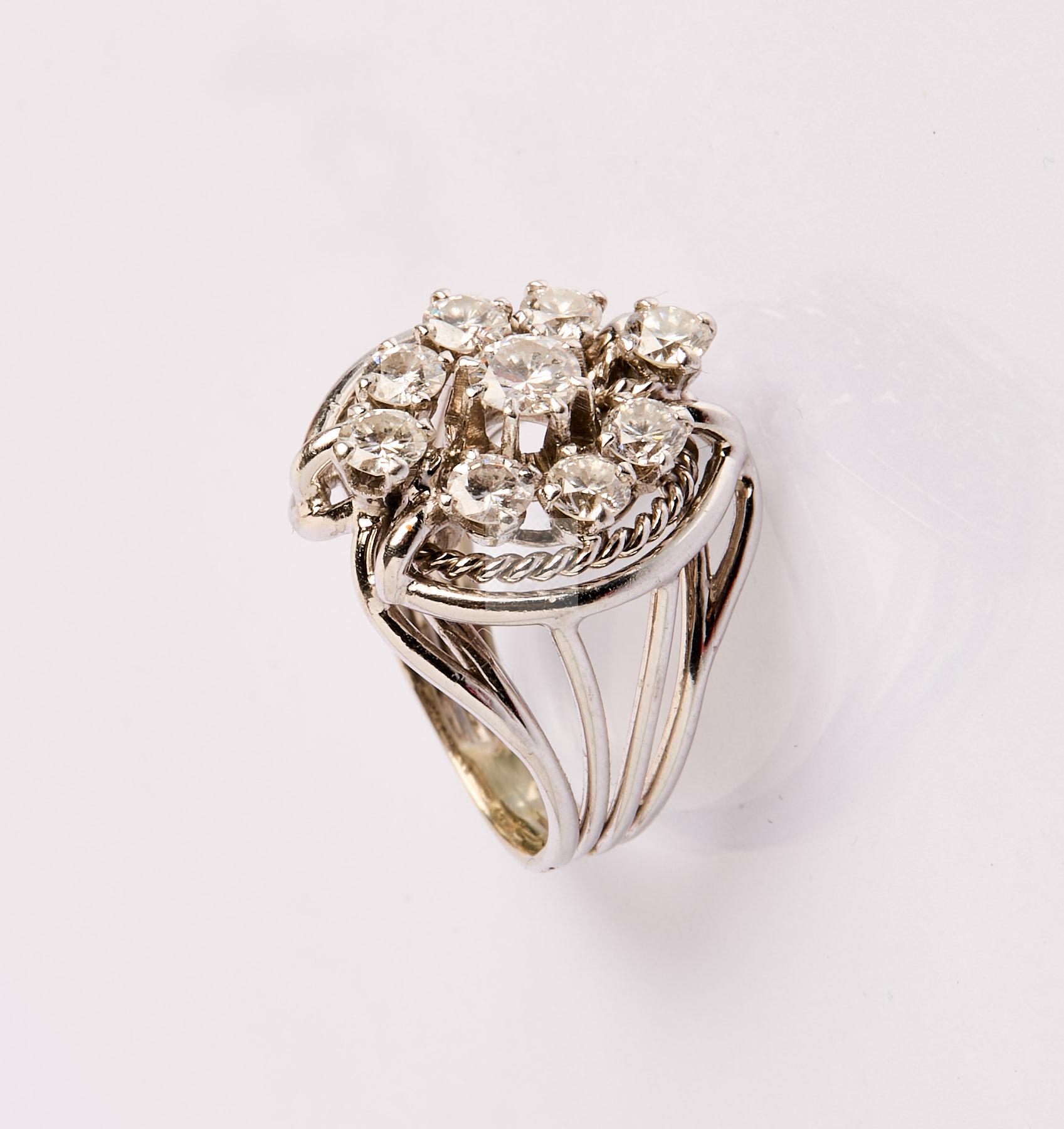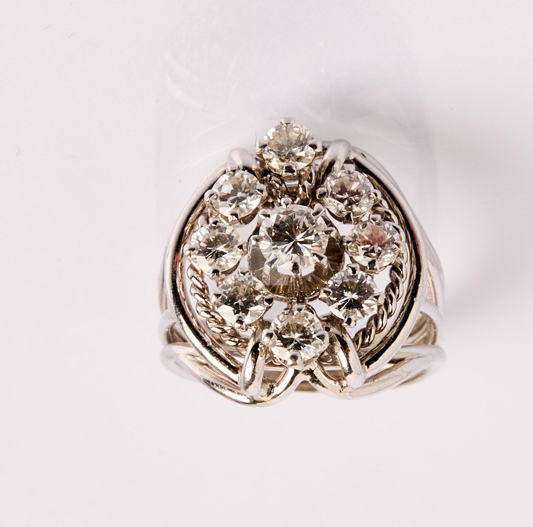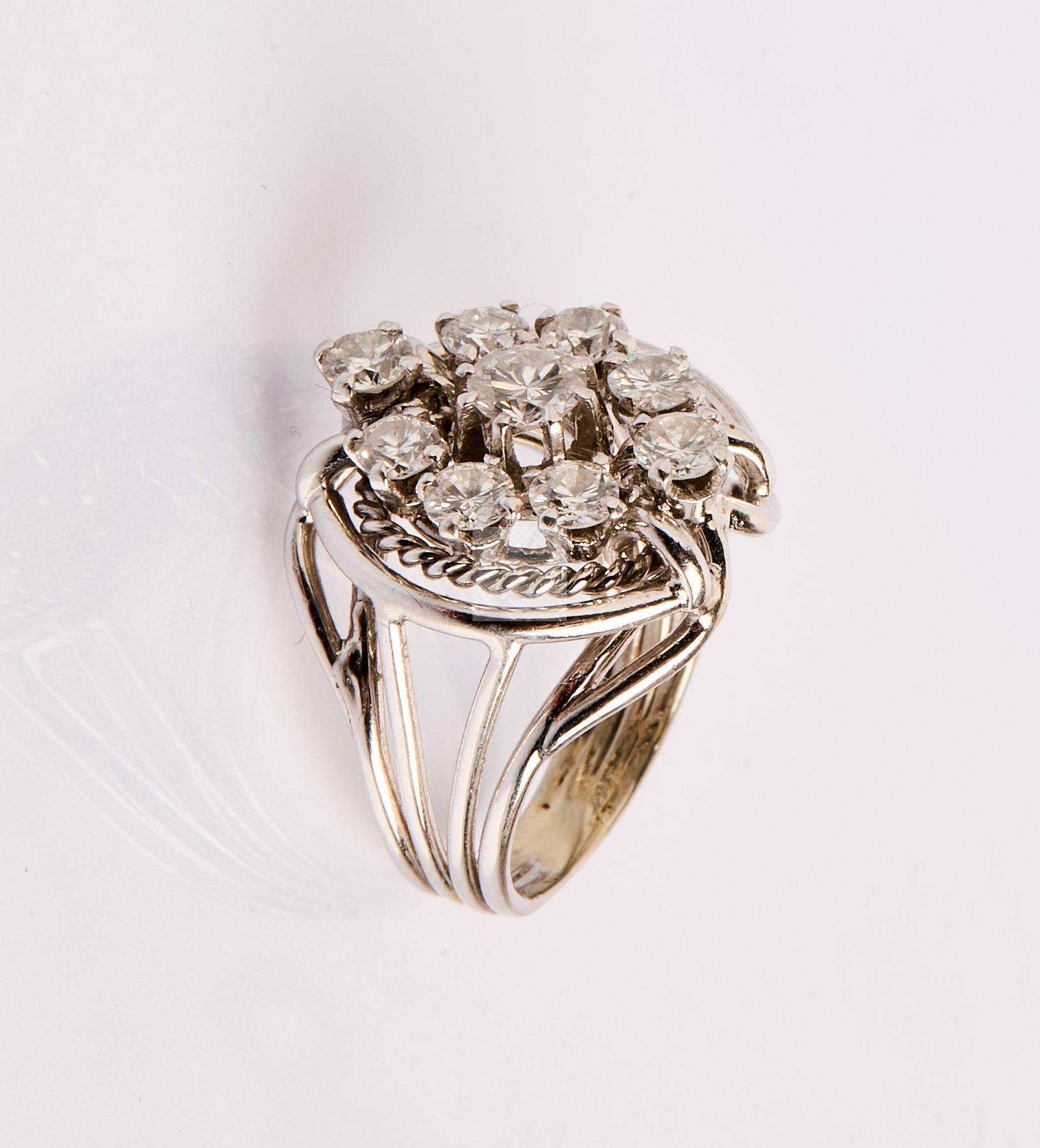223 Bague en platine corps 4 fils et platine tressé ornée d’un pavage en amande de 9 diamants brillantés de taille moderne totalisant environ 1,50 ct, années 60, tour de doigt 49 1/2 , poids 7,7 g