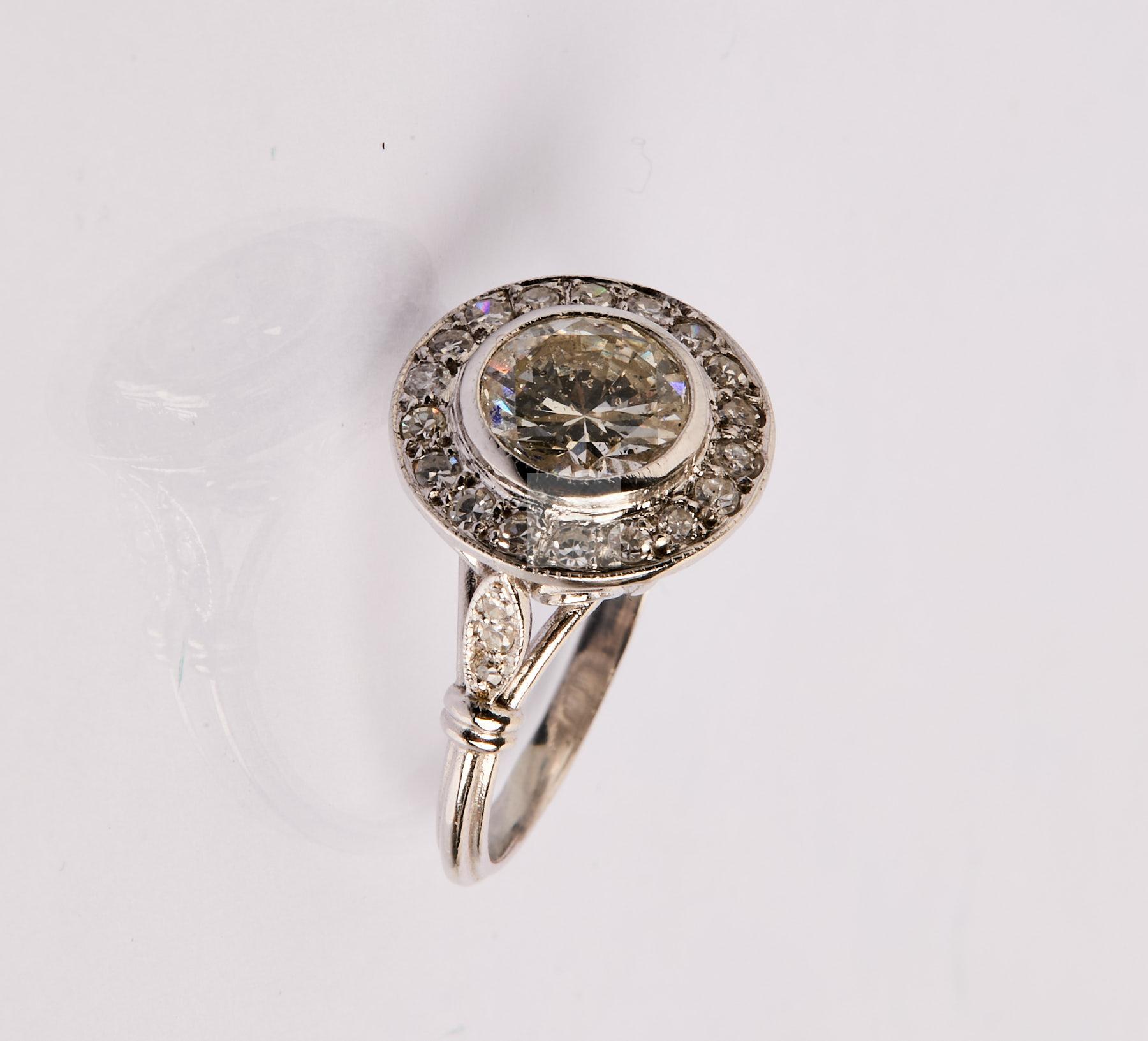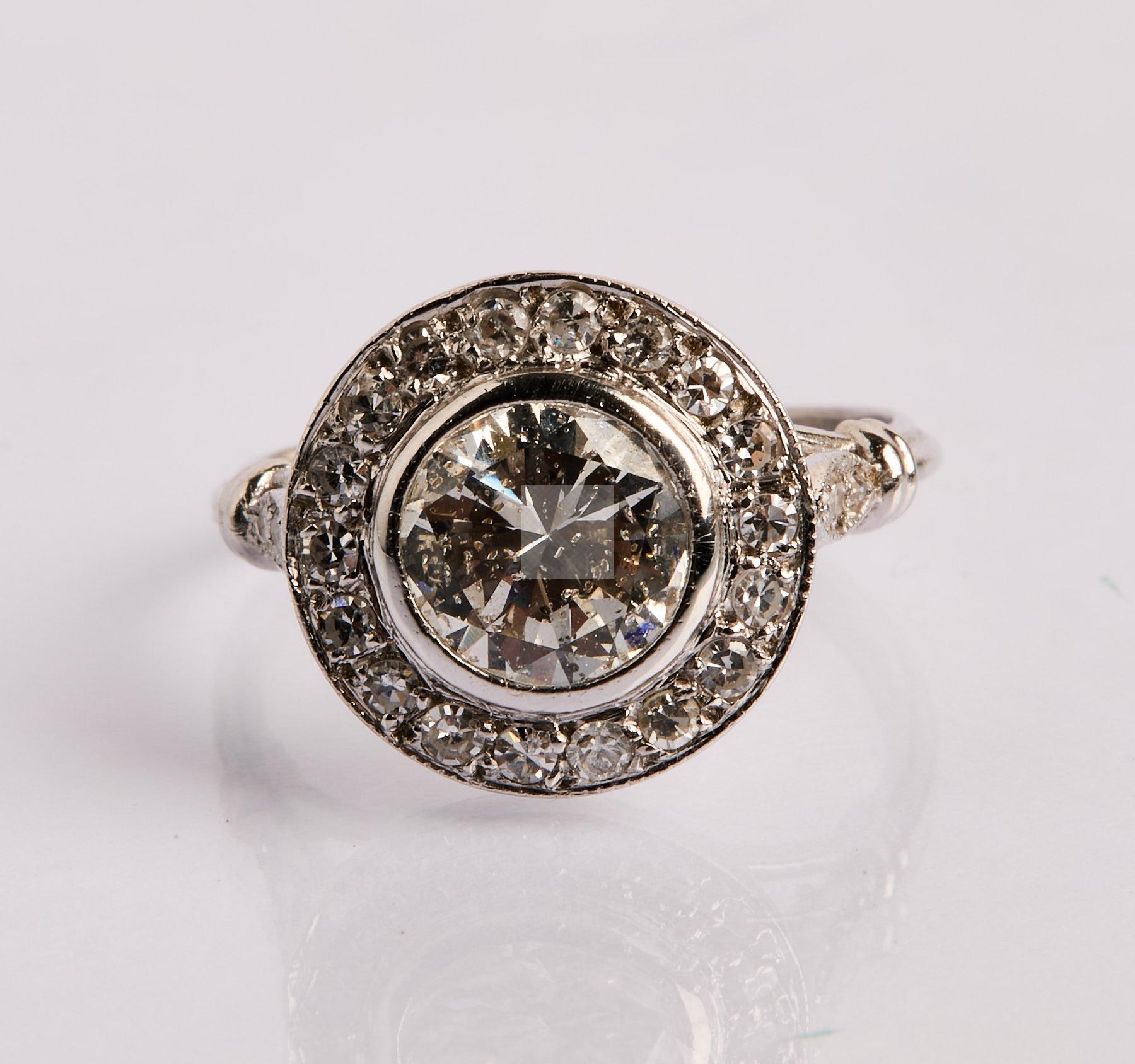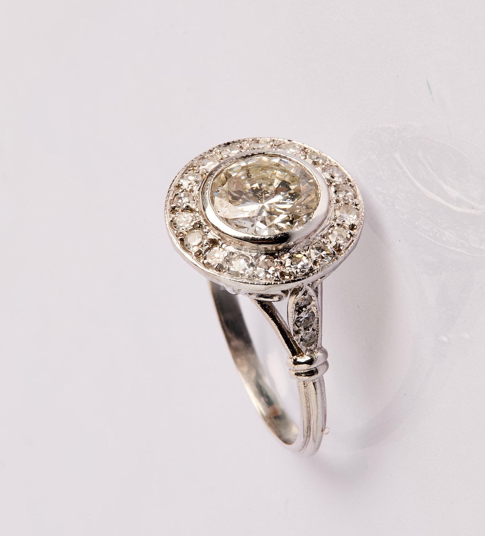 231 Bague en or gris sertie d’un diamant brillanté de taille moderne d’environ 1,6 ct en serti clôt entouré de petits diamants 8/8, tour de doigt 52, poids 3,9 g.