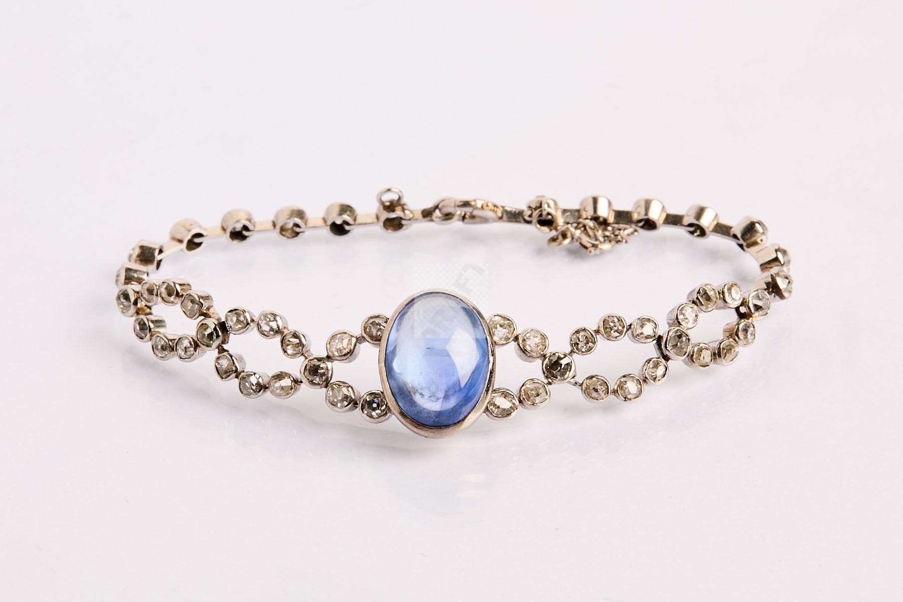 241 Bracelet en platine orné d’un cabochon de saphir d’environ 7 ct et lignes entrelacées de diamants de tailles anciennes, vers 1910-1920, avec chainette de sécurité, poids 19,4 g.