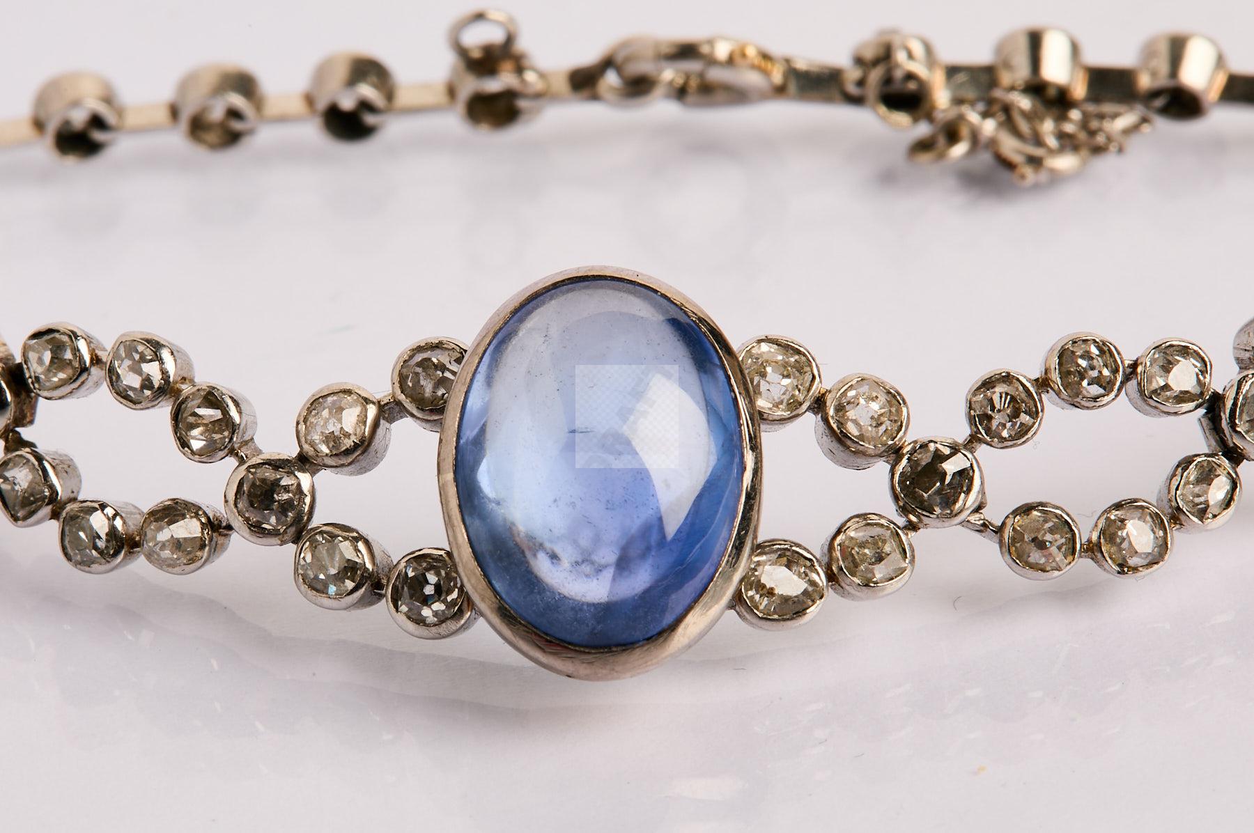 Lot n°241 - 241 Bracelet en platine orné d’un cabochon de saphir d’environ 7 ct et lignes en