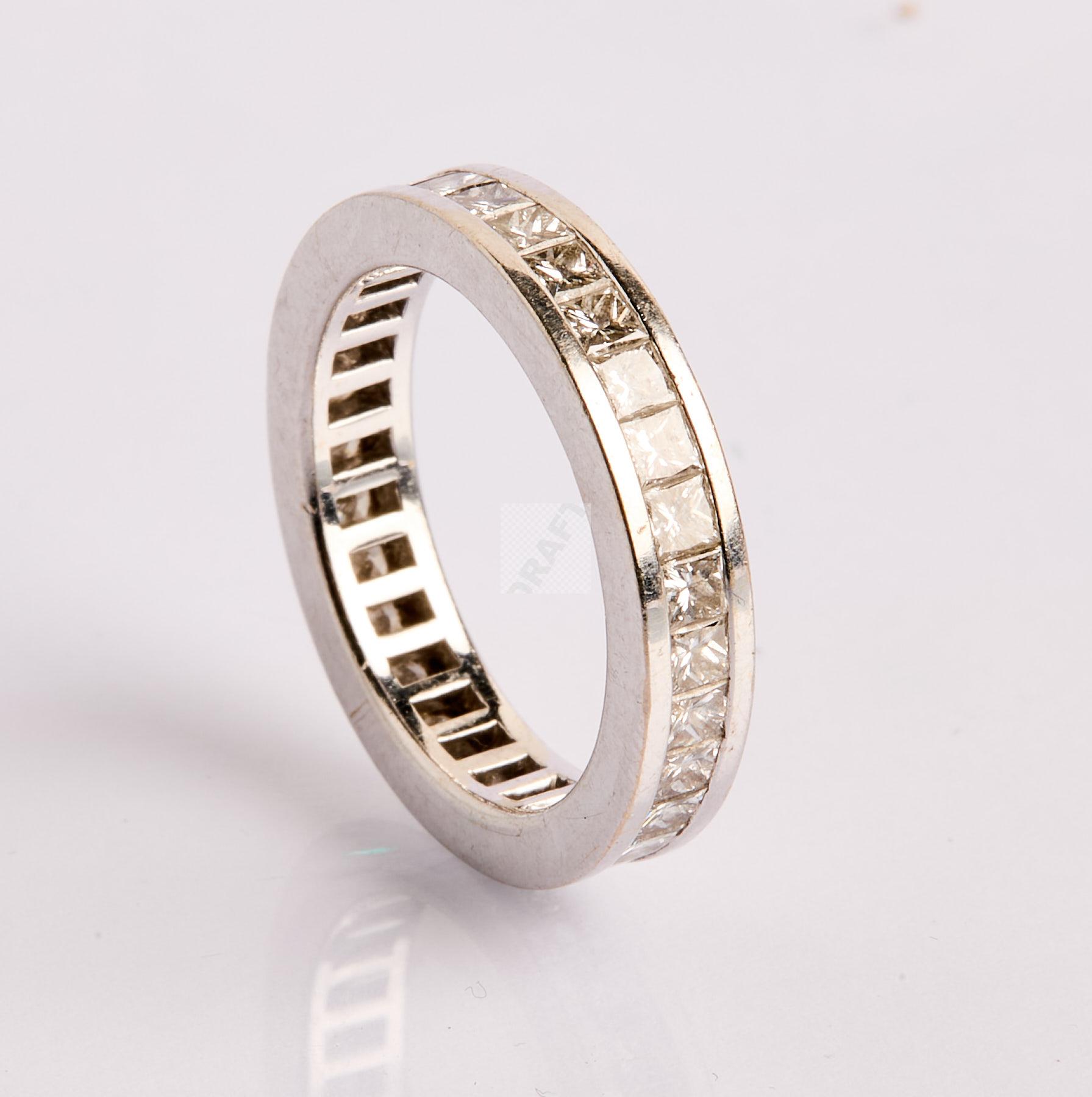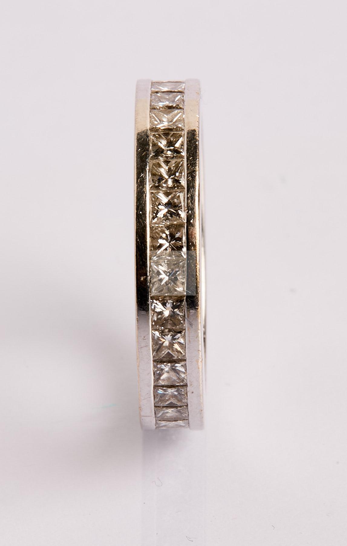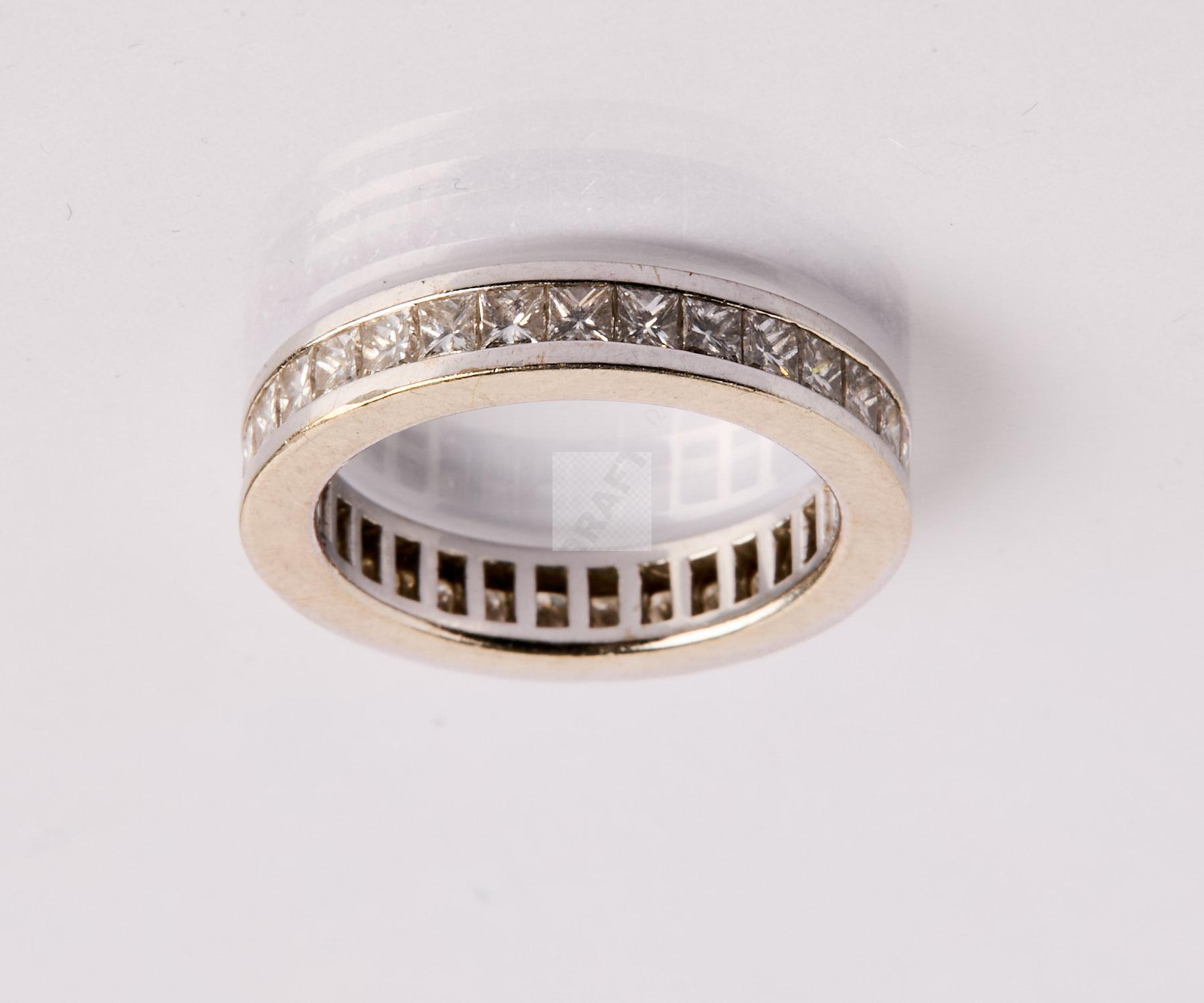242 Alliance américaine en or gris 750 ‰, sertie de 30 diamants de taille Asscher d’un poids total estimé à 2,10 ct, tour de doigt 52, poids 5,6 g.