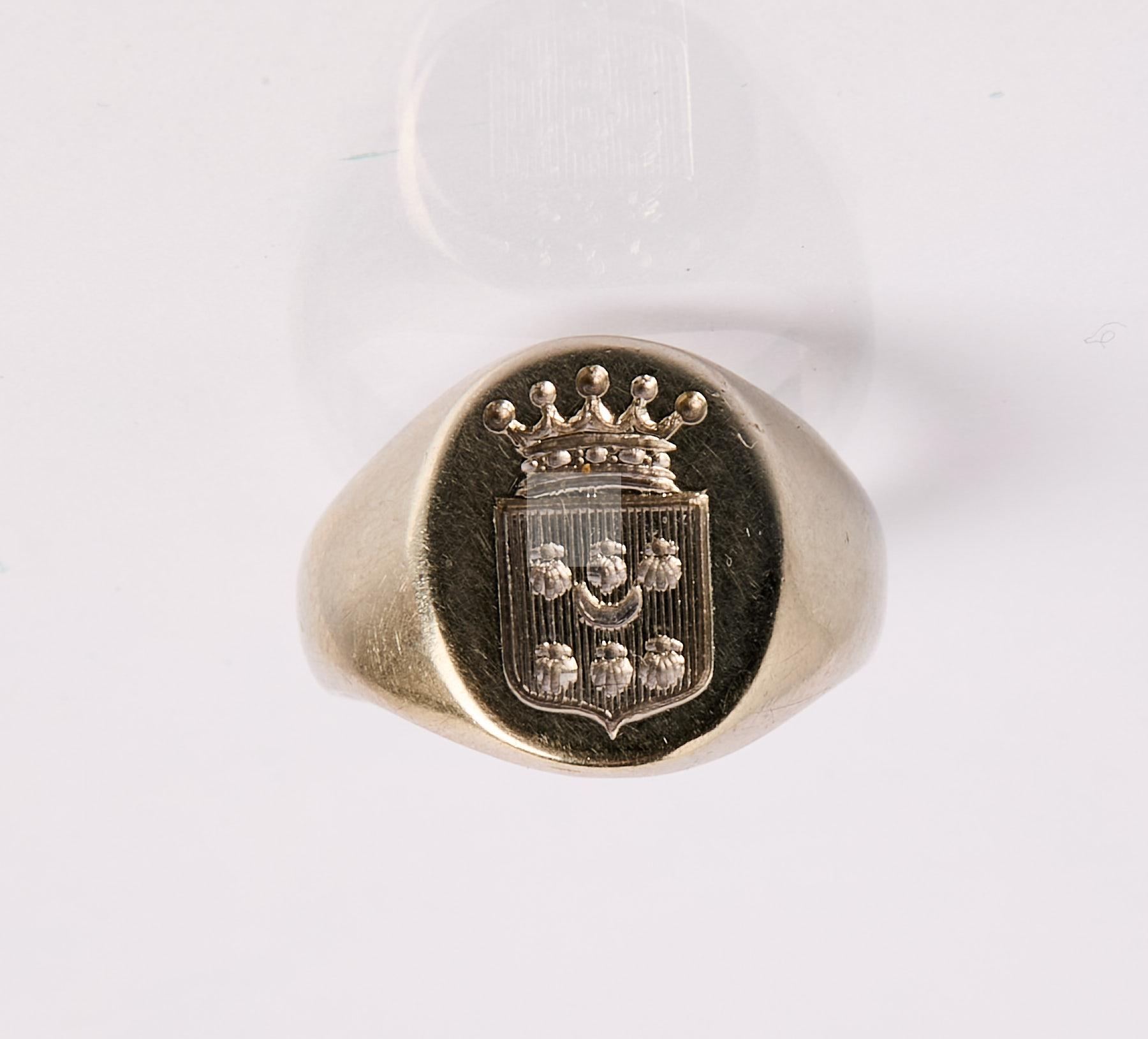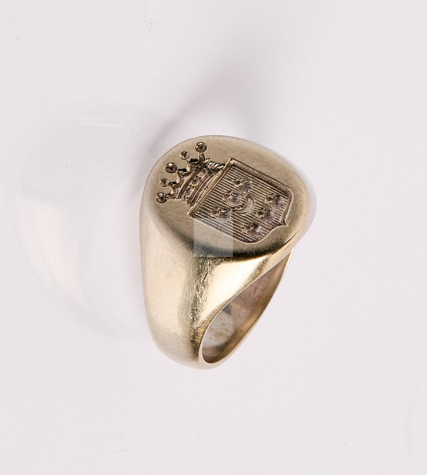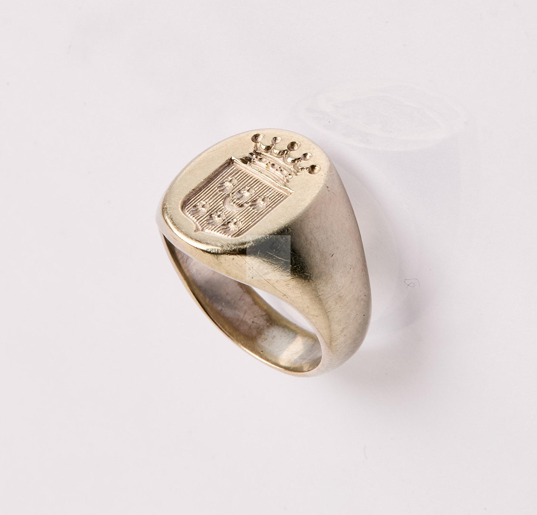 Lot n°248 - 248 Chevalière armoriée en or gris 750 ‰, tour de doigt 46 , poids 7 g.