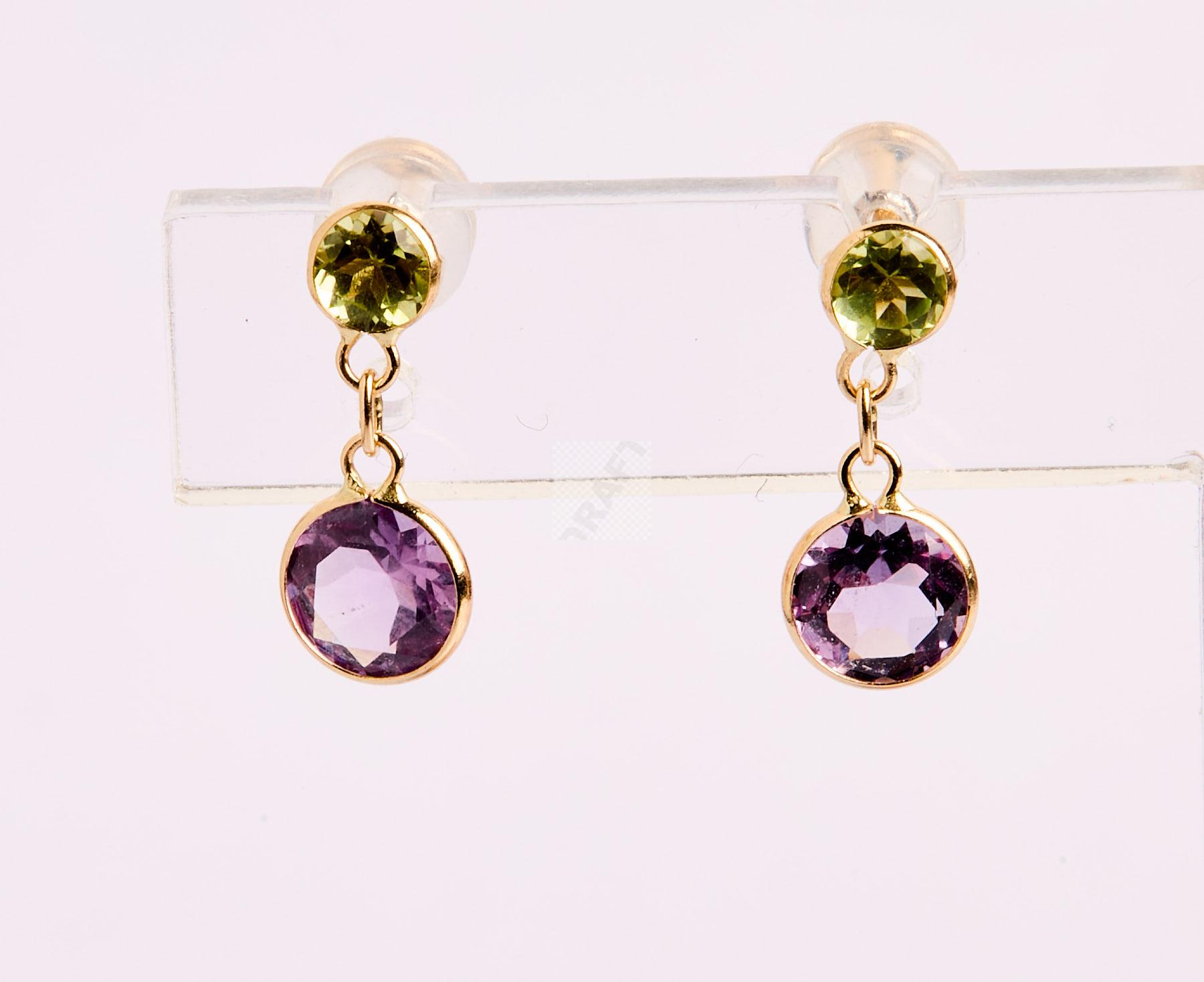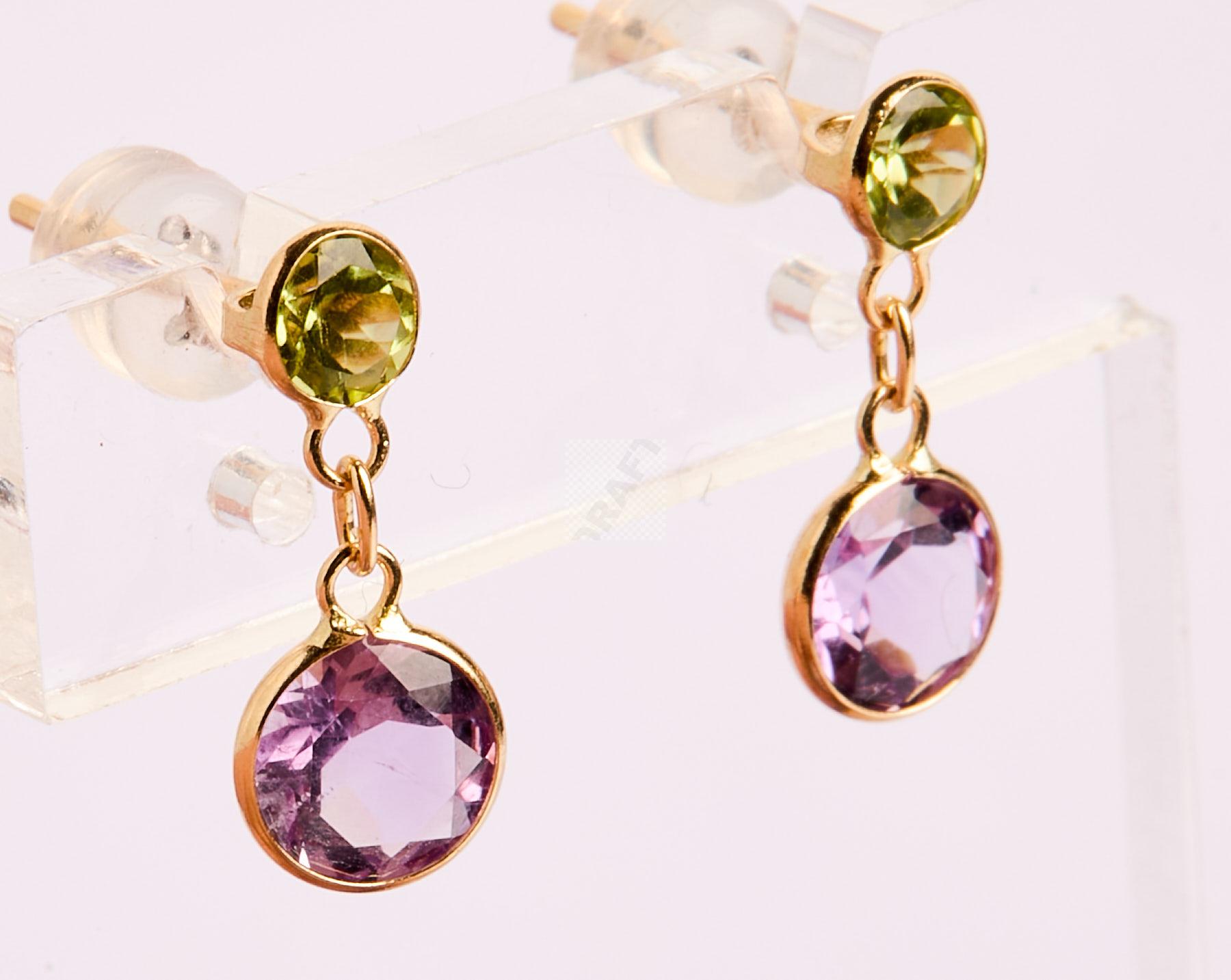 260 Paire de pendants d’oreilles en or jaune 750/1000 sertie de deux améthystes de deux péridots.