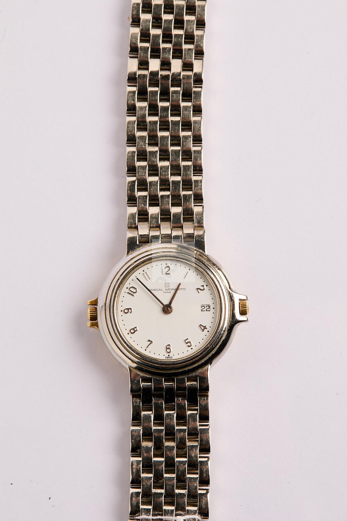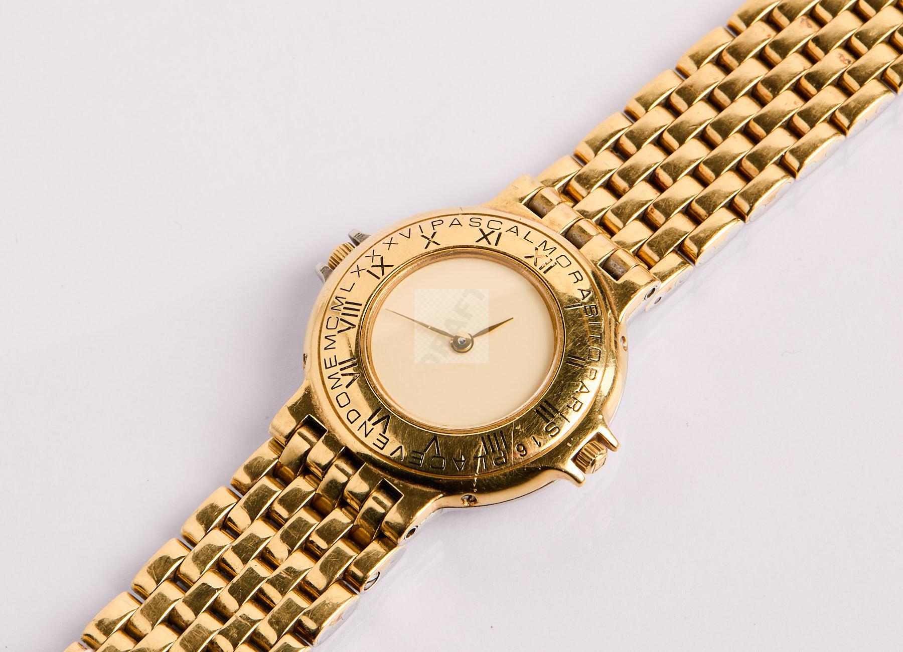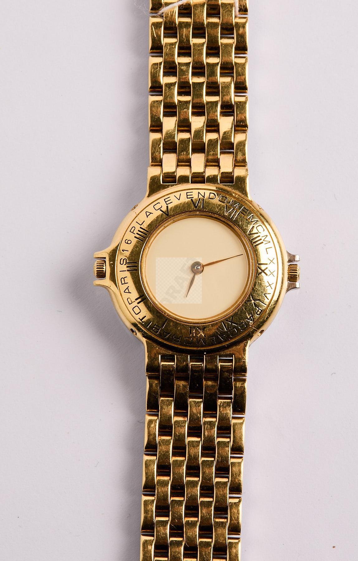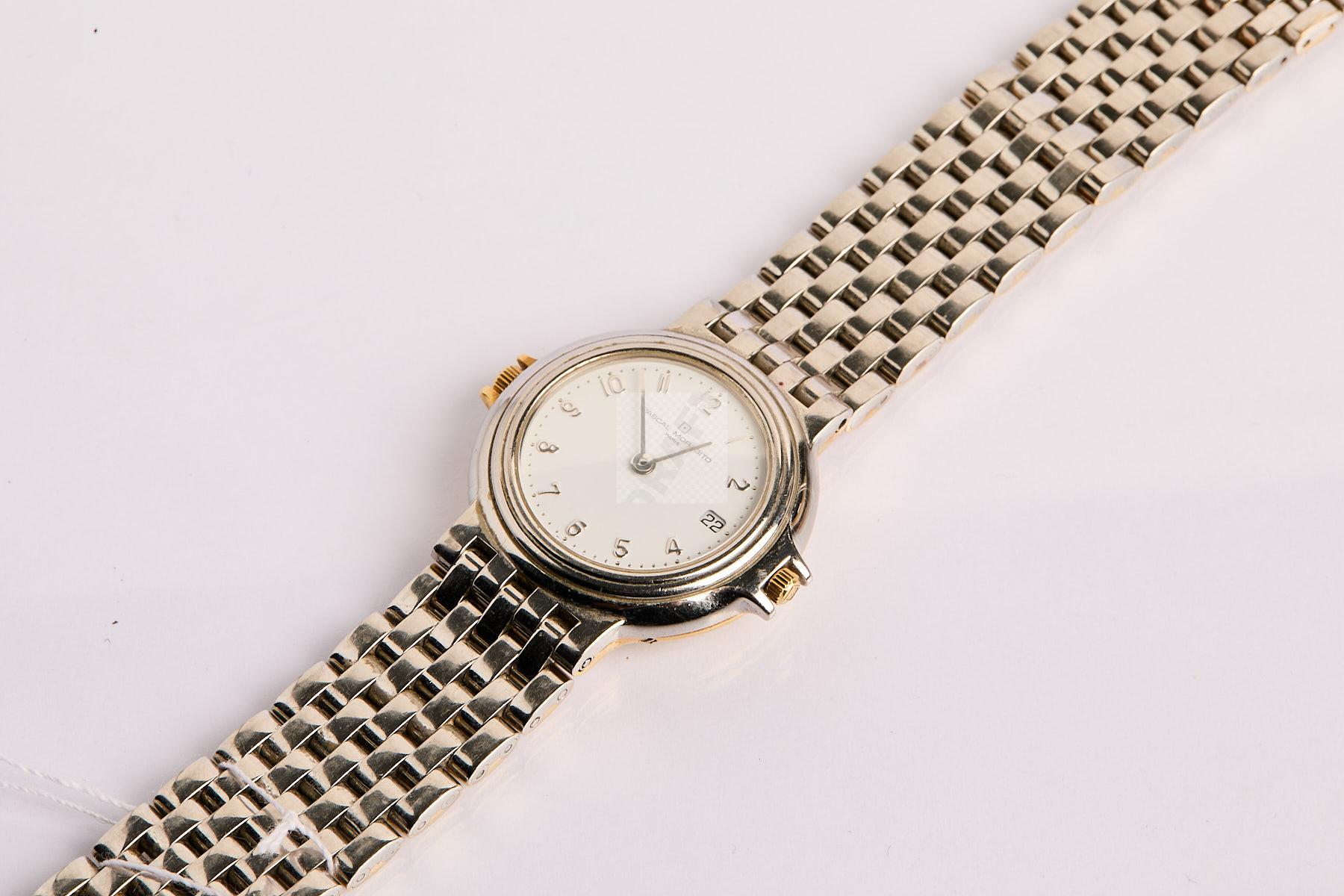 262 PASCAL MORABITO : Montre réversible en or jaune 750 ‰ et acier avec dateur côté acier, mouvements quartz, piles à changer, manque un petit demi-maillon d’or jaune, poignet 18 cm poids brut, 95 g