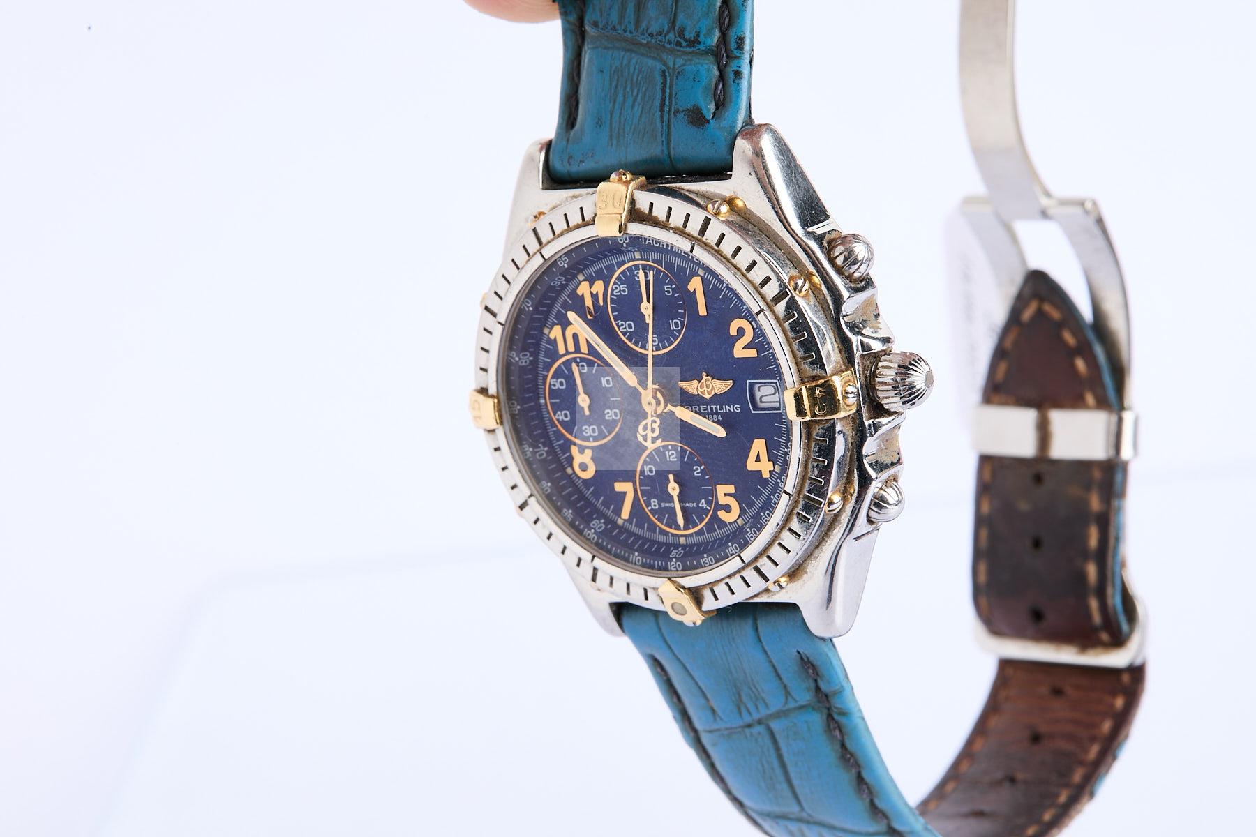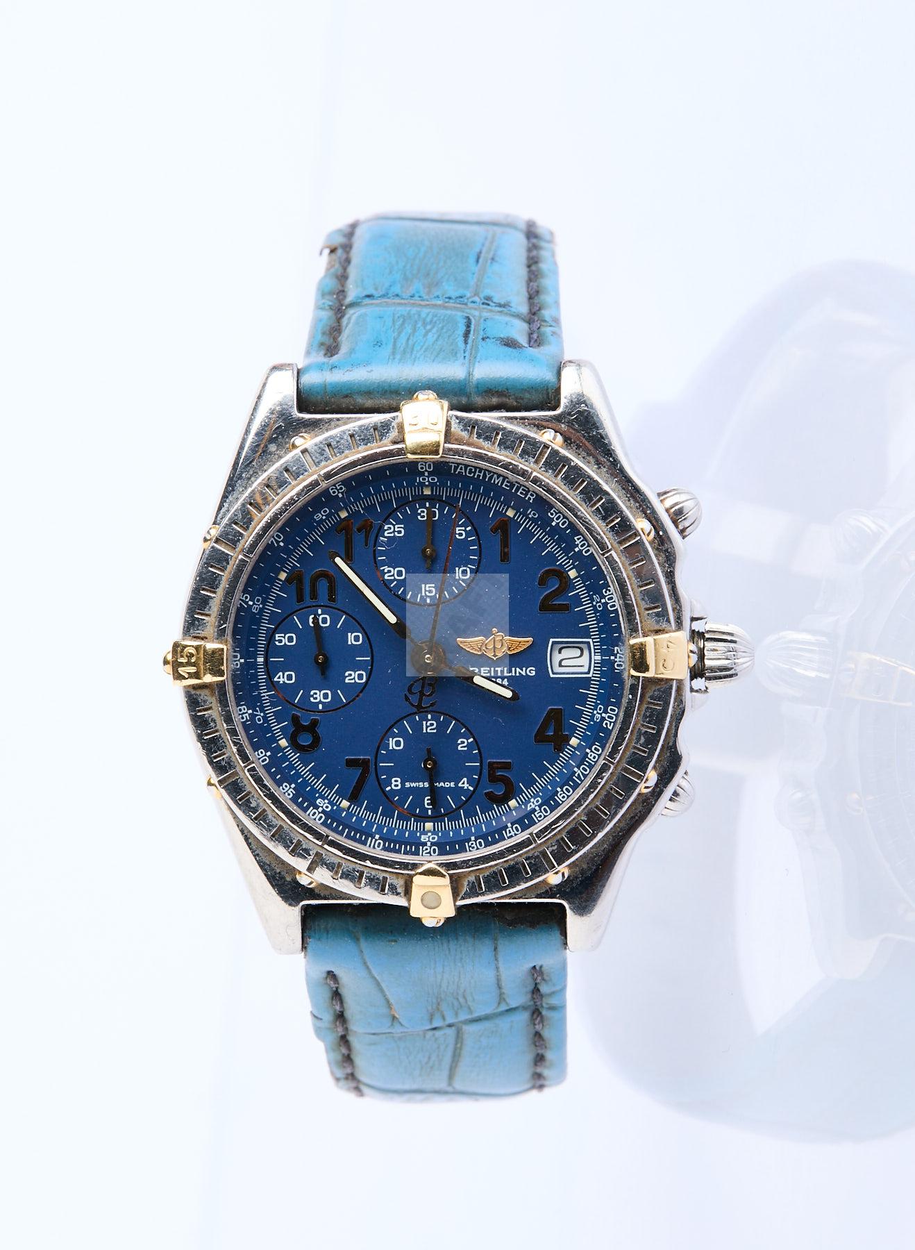266 BREITLING : Montre Chronomat B13050.1, années 90, cadran bleu nuit, boite acier index or, bracelet cuir bleu ancien , boucle déployante d’origine, bon aspect de présentation,