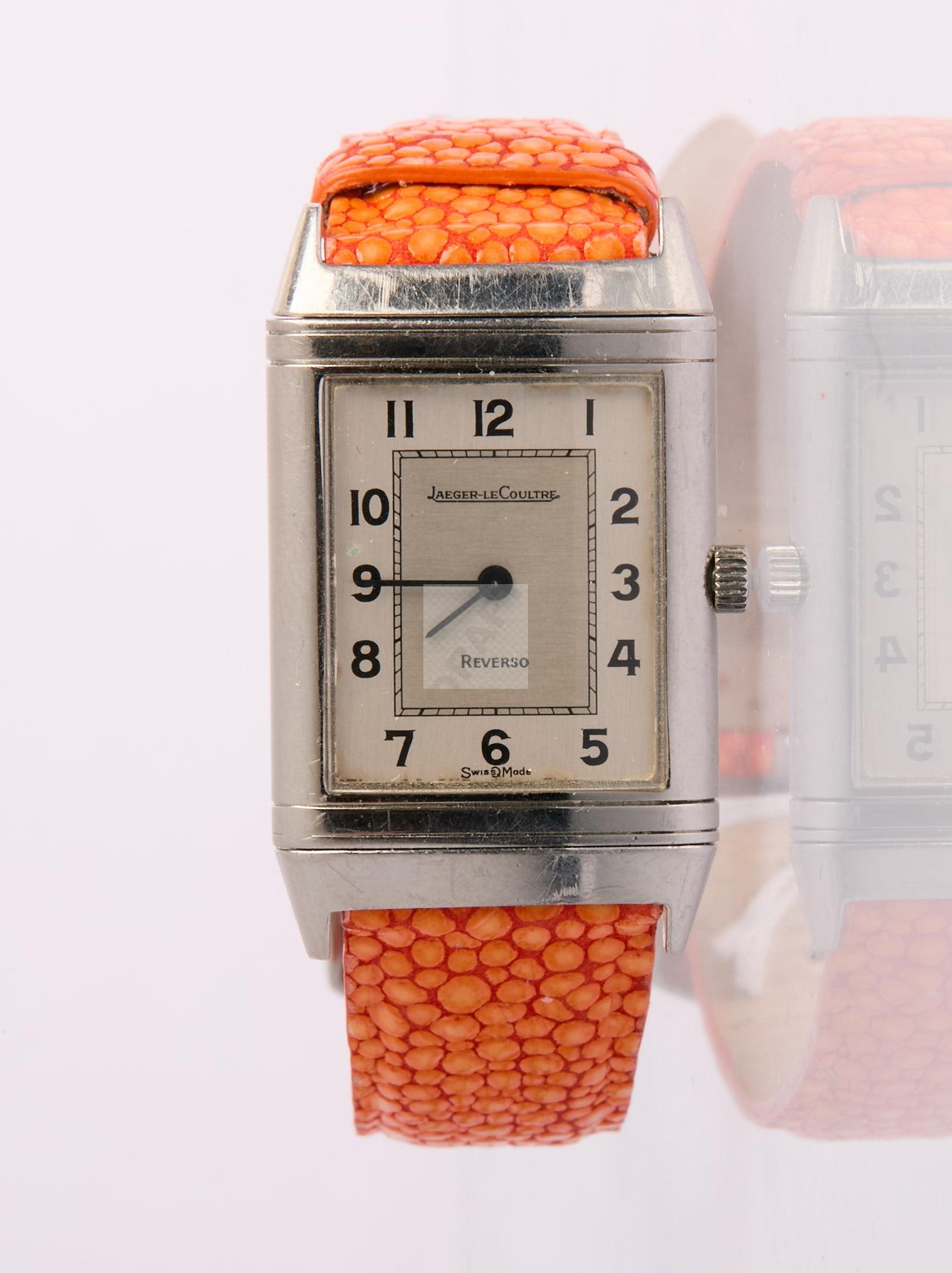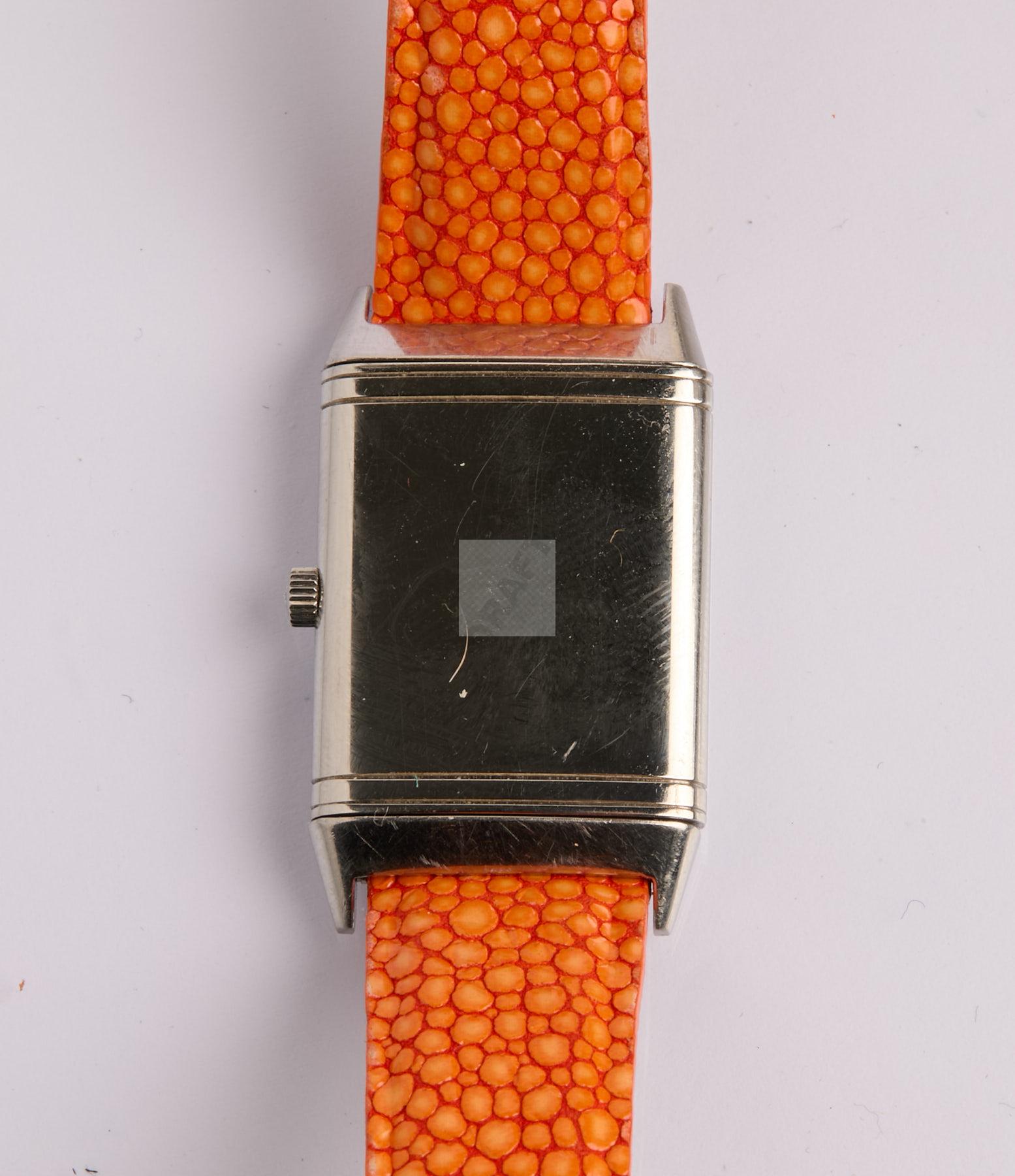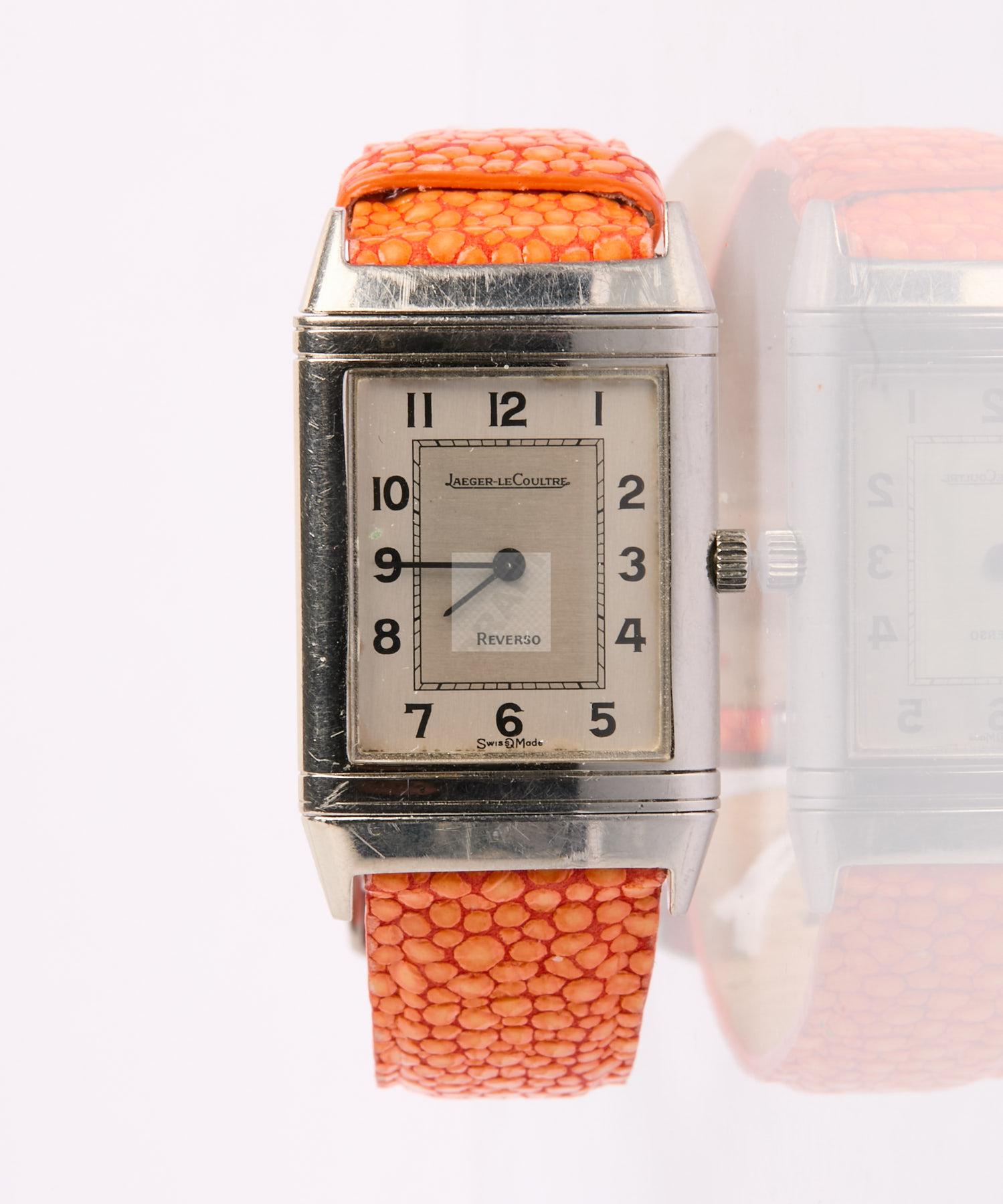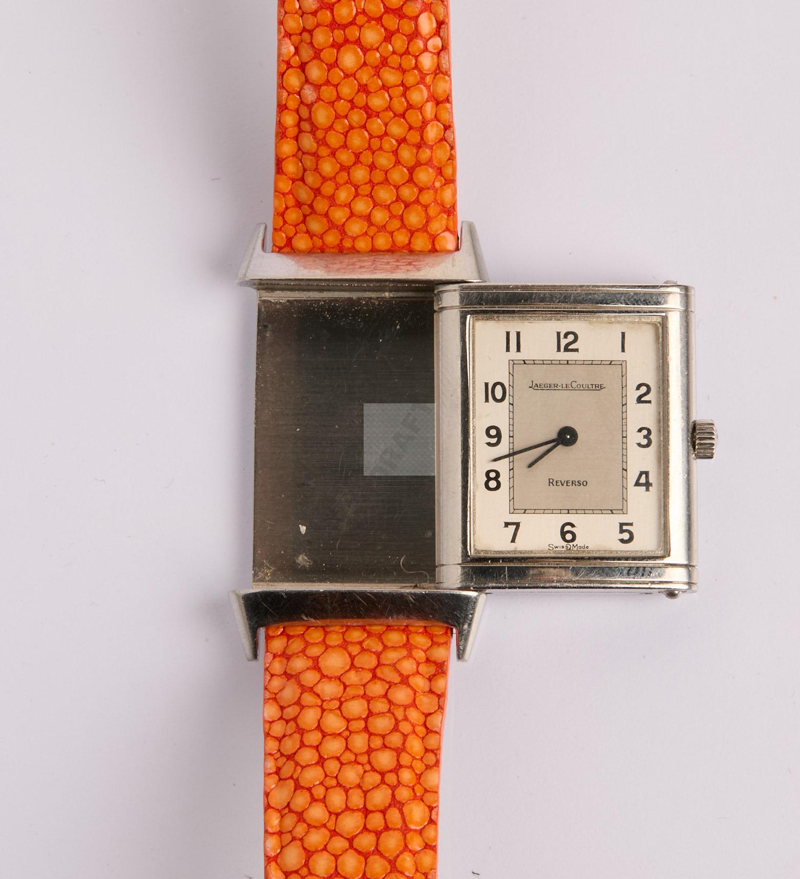267 Bis JAEGER Le COULTRE : montre reverso de dame en métal blanc, cadran 23 x 34 mm. Bracelet cuir orange (pas d’origine).