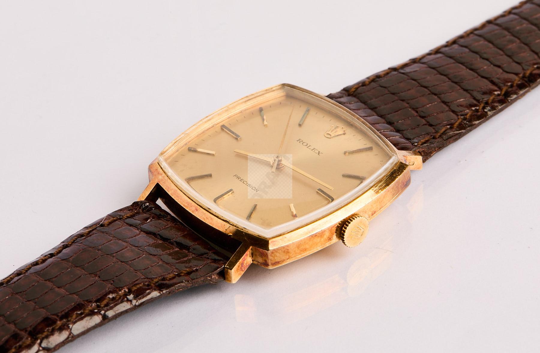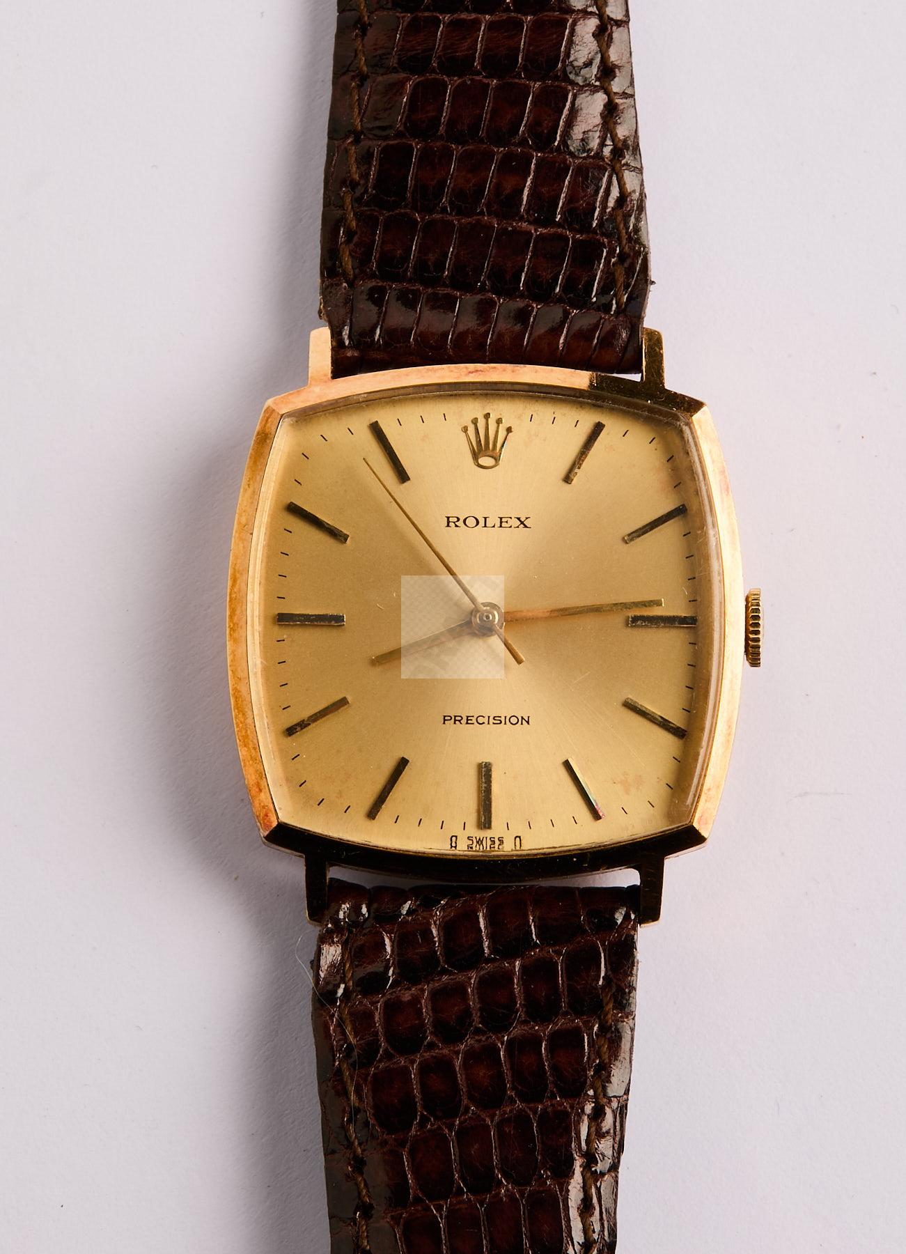 269 ROLEX Précision : montre d’homme boite coussin en orjaune 750 ‰, mouvement mécanique, bracelet lezard, boucle en plaqué or d’origine années 50 – 60, poids brut 35 g