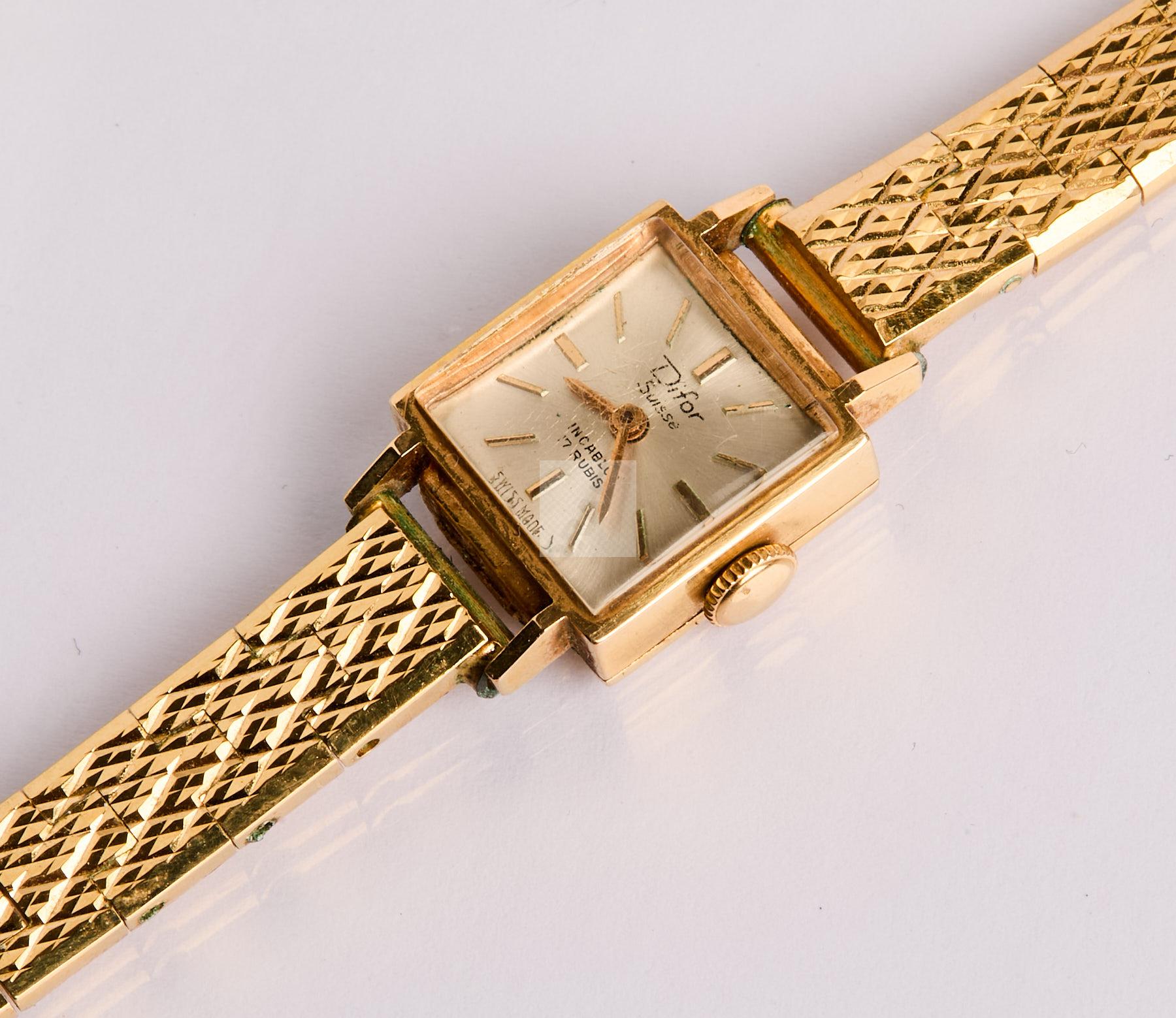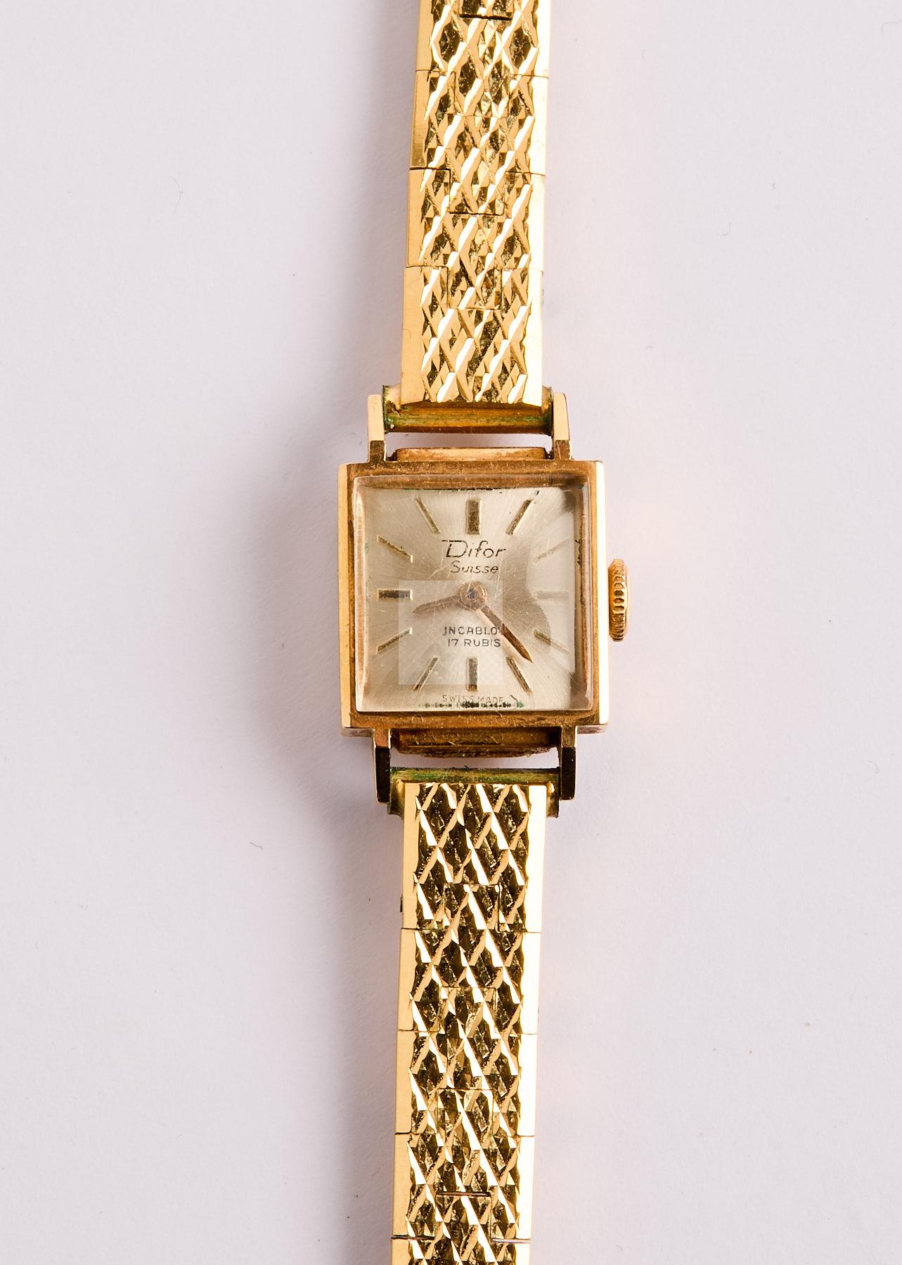 Lot n°278 - 278 DIFOR: montre de dame en or jaune 750/1000, bracelet en métal doré.