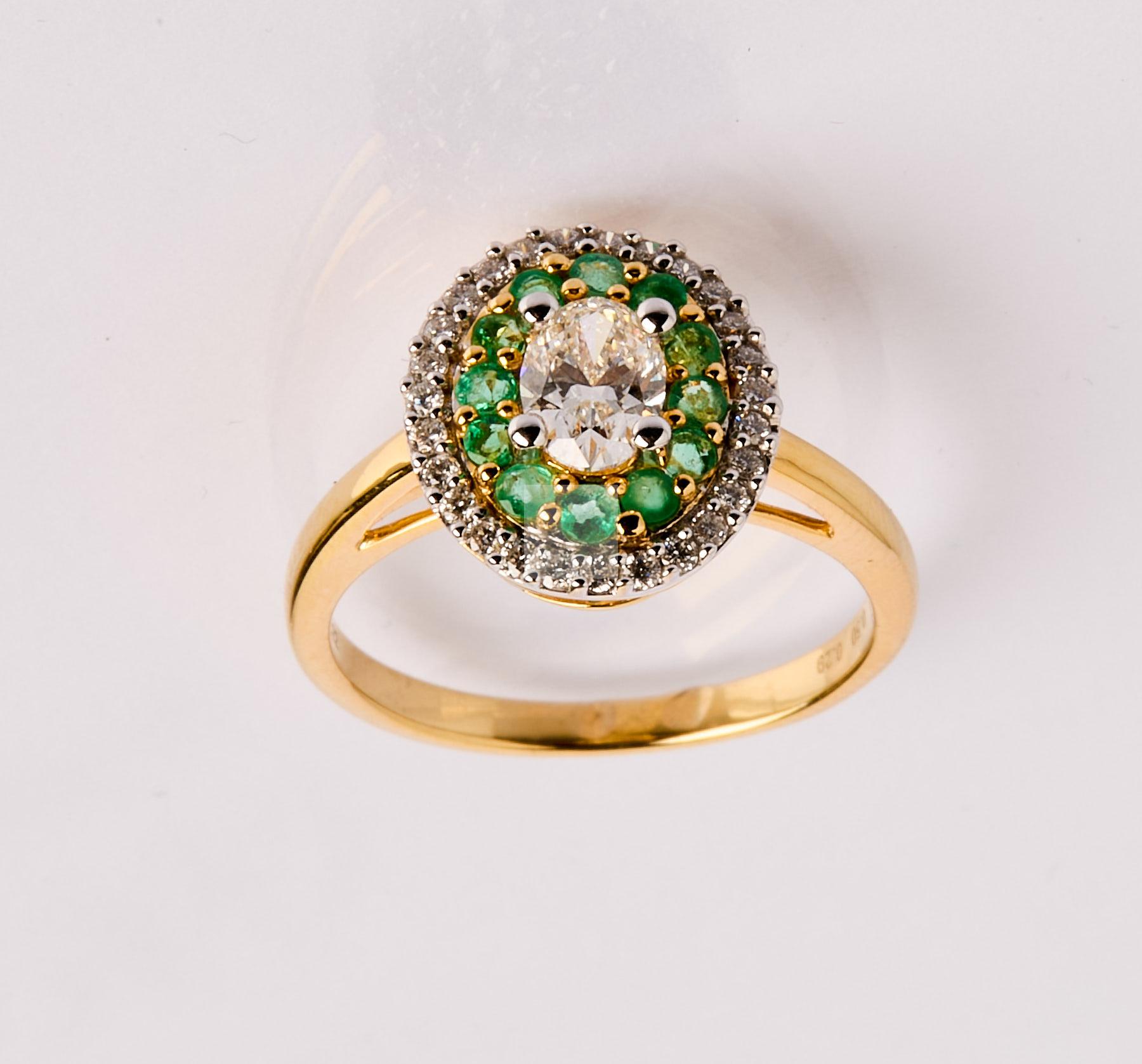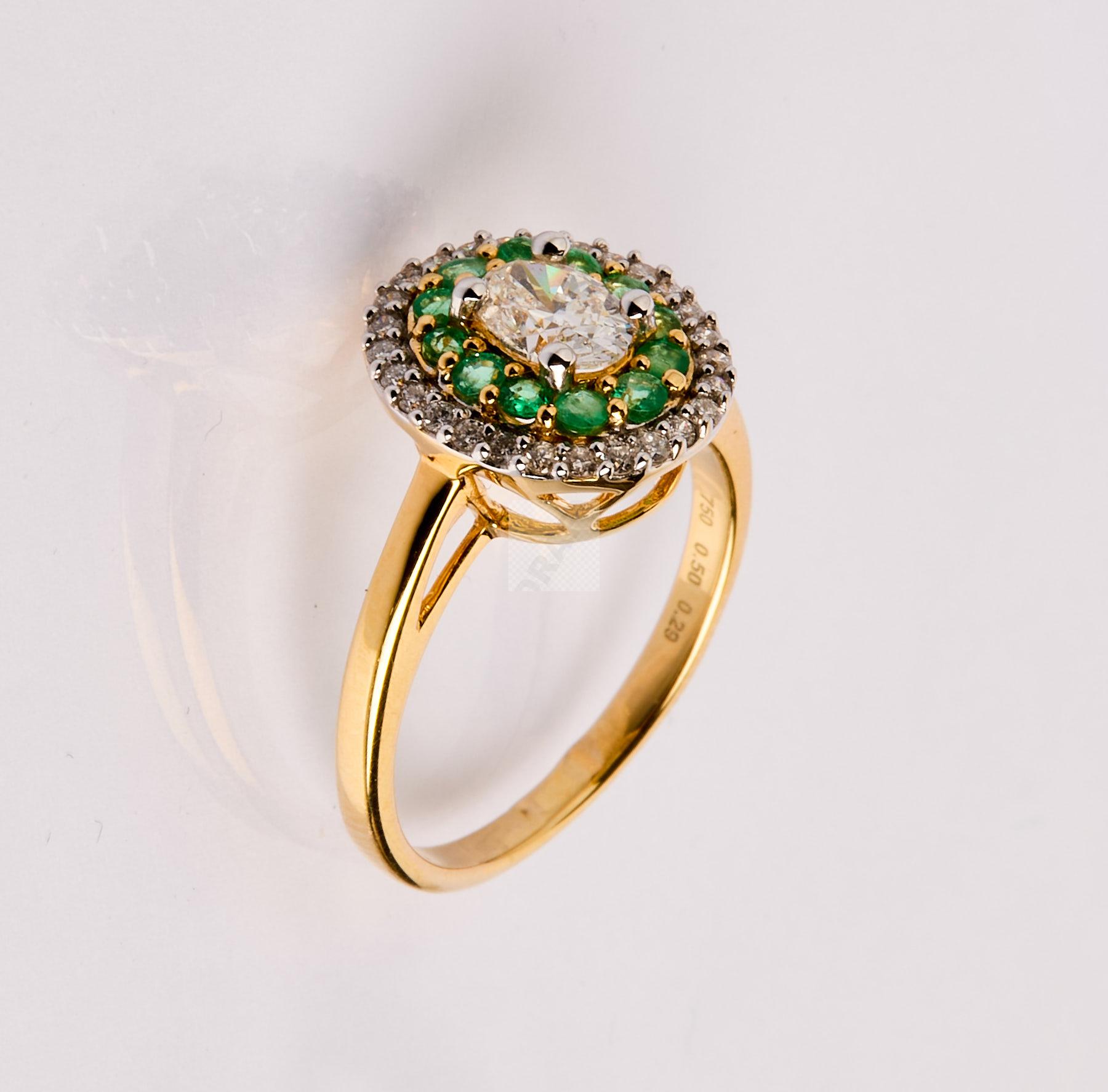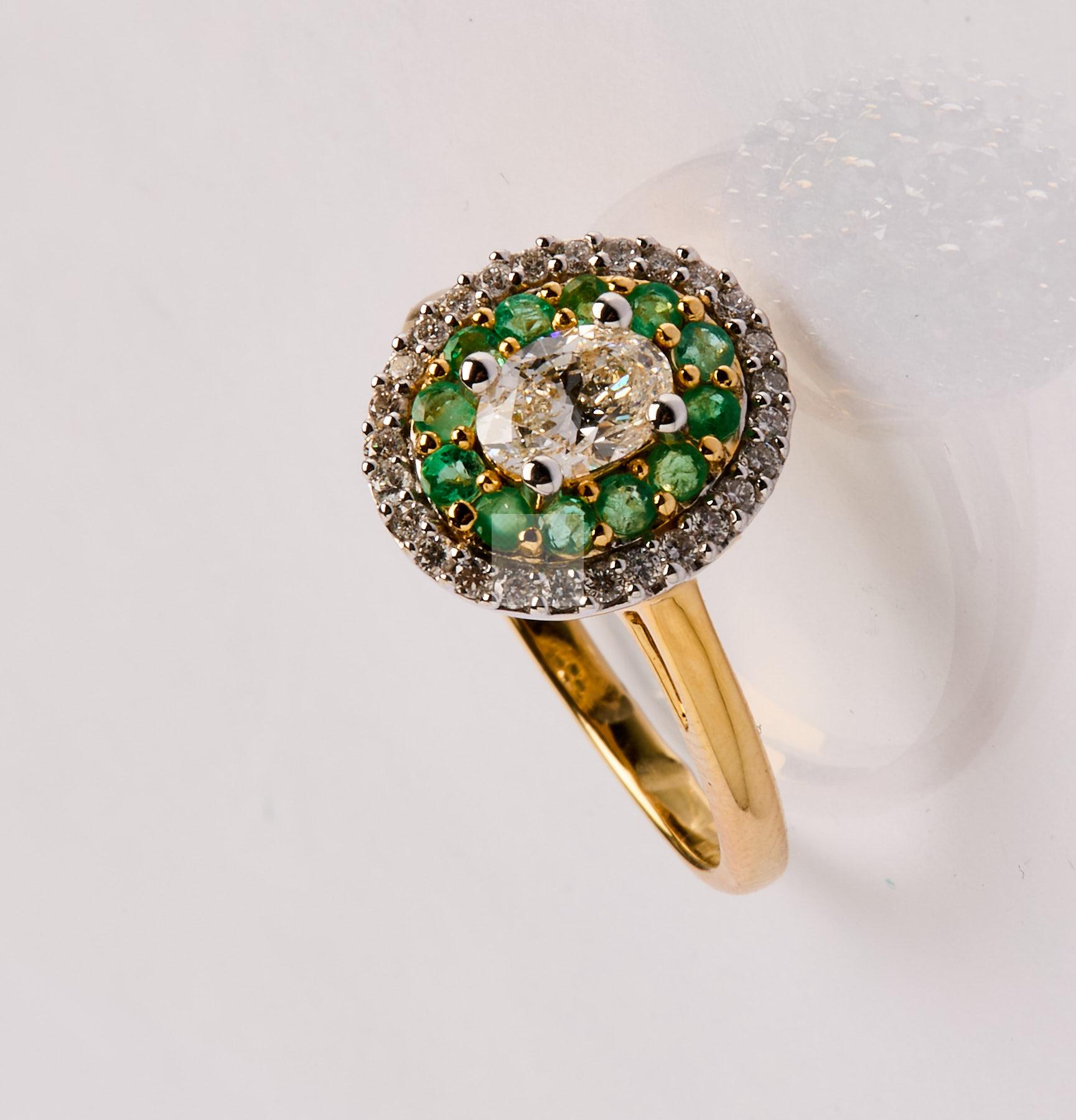294 Bague en or jaune 750/1000 sertie d’un diamant d’environ 0.50 carat (de couleur H et pureté VS2 dans un double entourage d’émeraudes d’environ 0.30 carat et d’environ 0.20 carat de diamants.