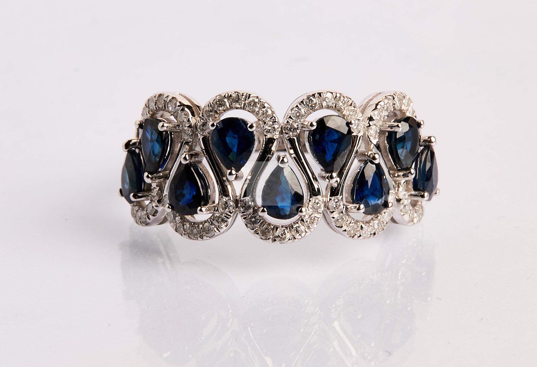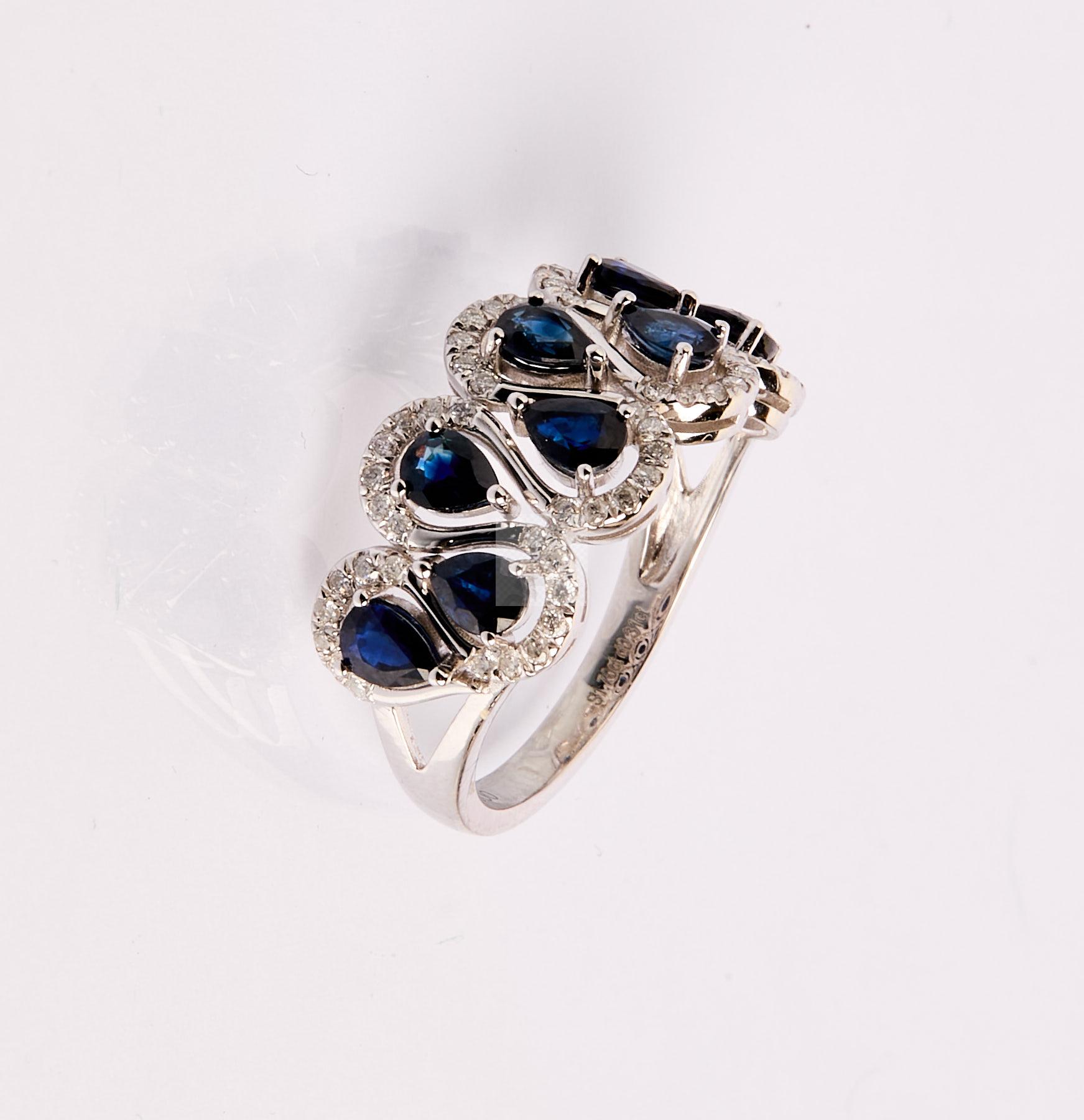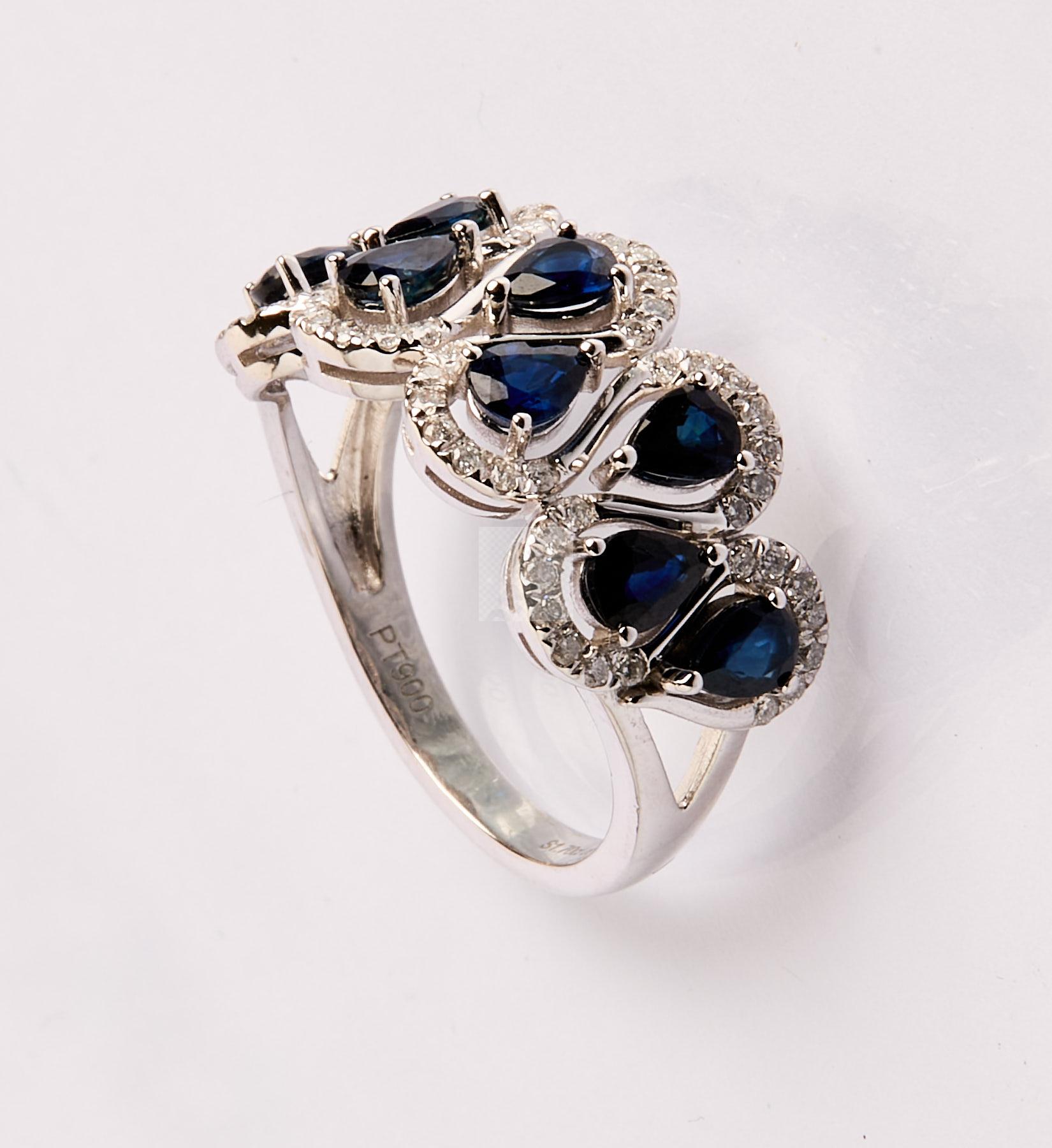 298 Bague jarretière en platine sertie de saphirs taillés en poires totalisant environ1.70 carat et entourage de diamants pesant environ 0.30 carat.