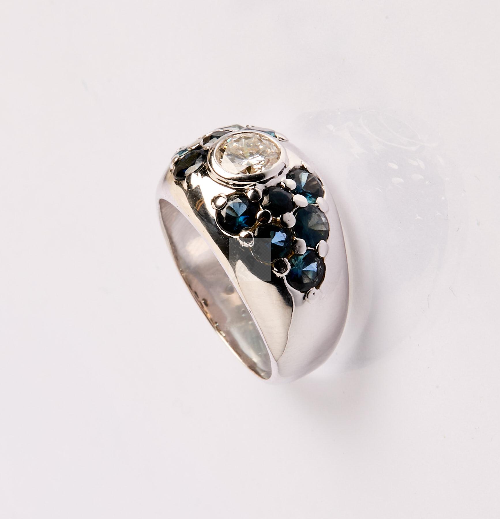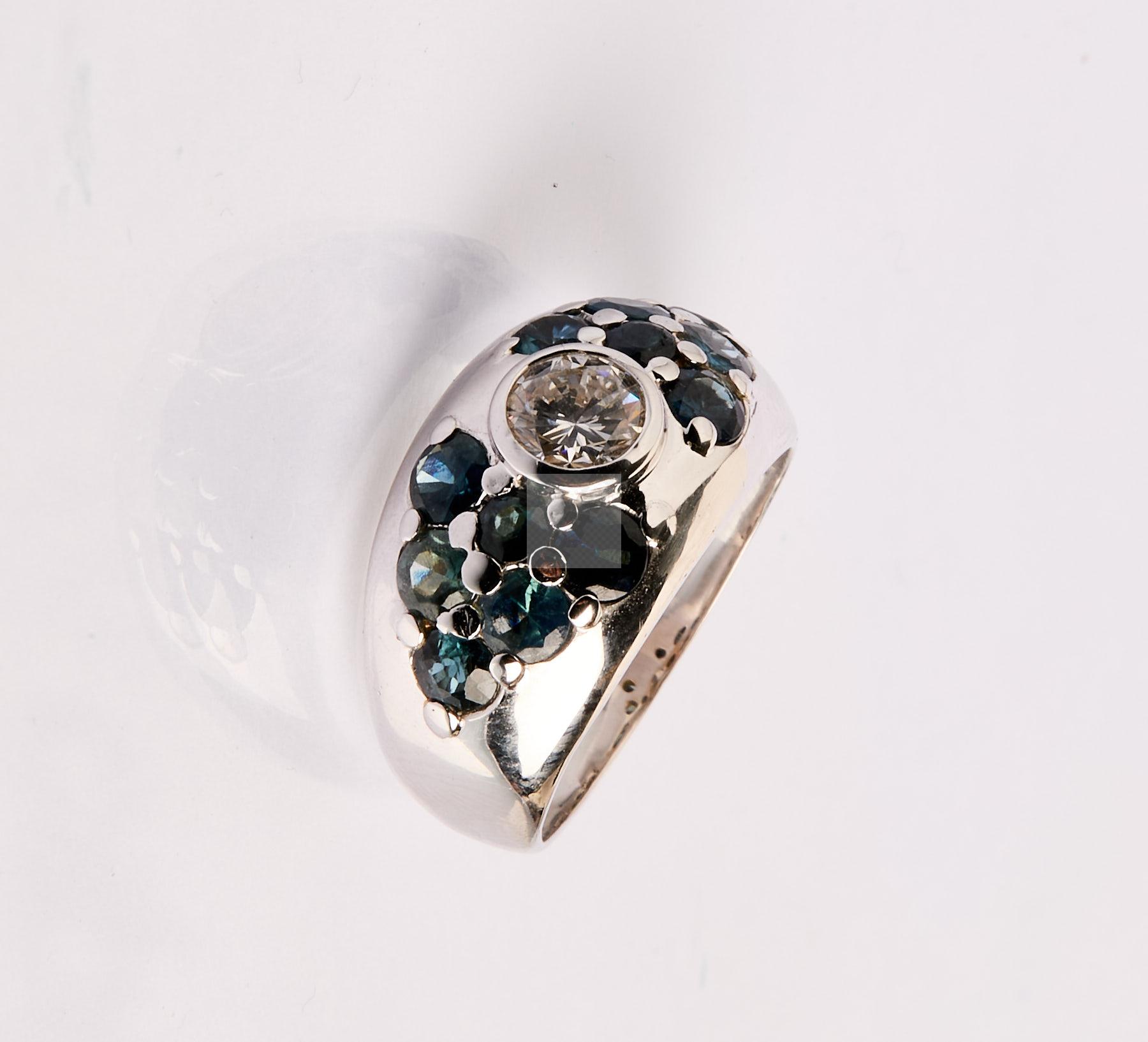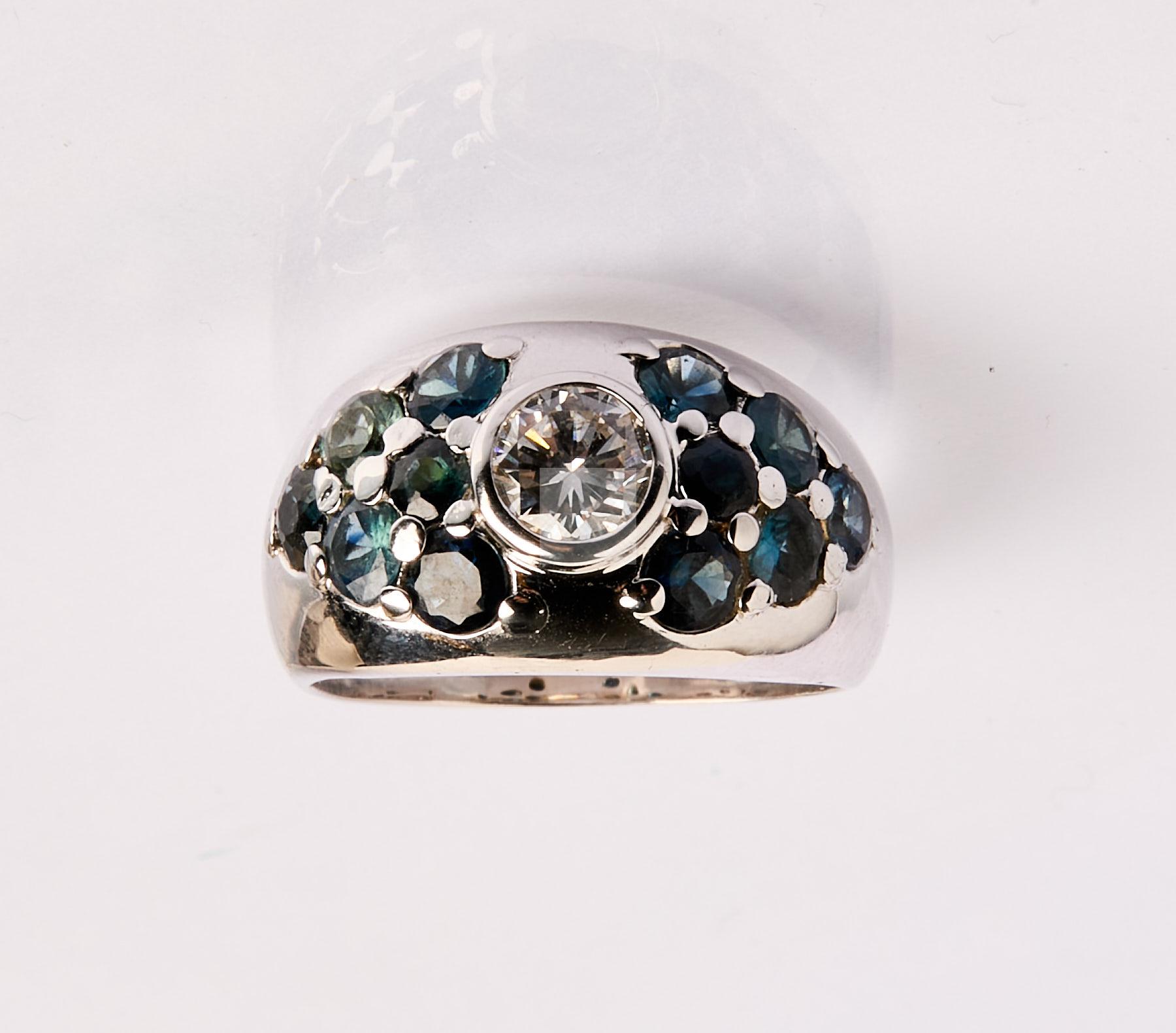 299 Bague Jonc en or gris 750/1000 sertie d’un diamant rond d’environ 0.60 ct en sertis clos épaulé de saphirs ronds totalisant environ 0.40ct.