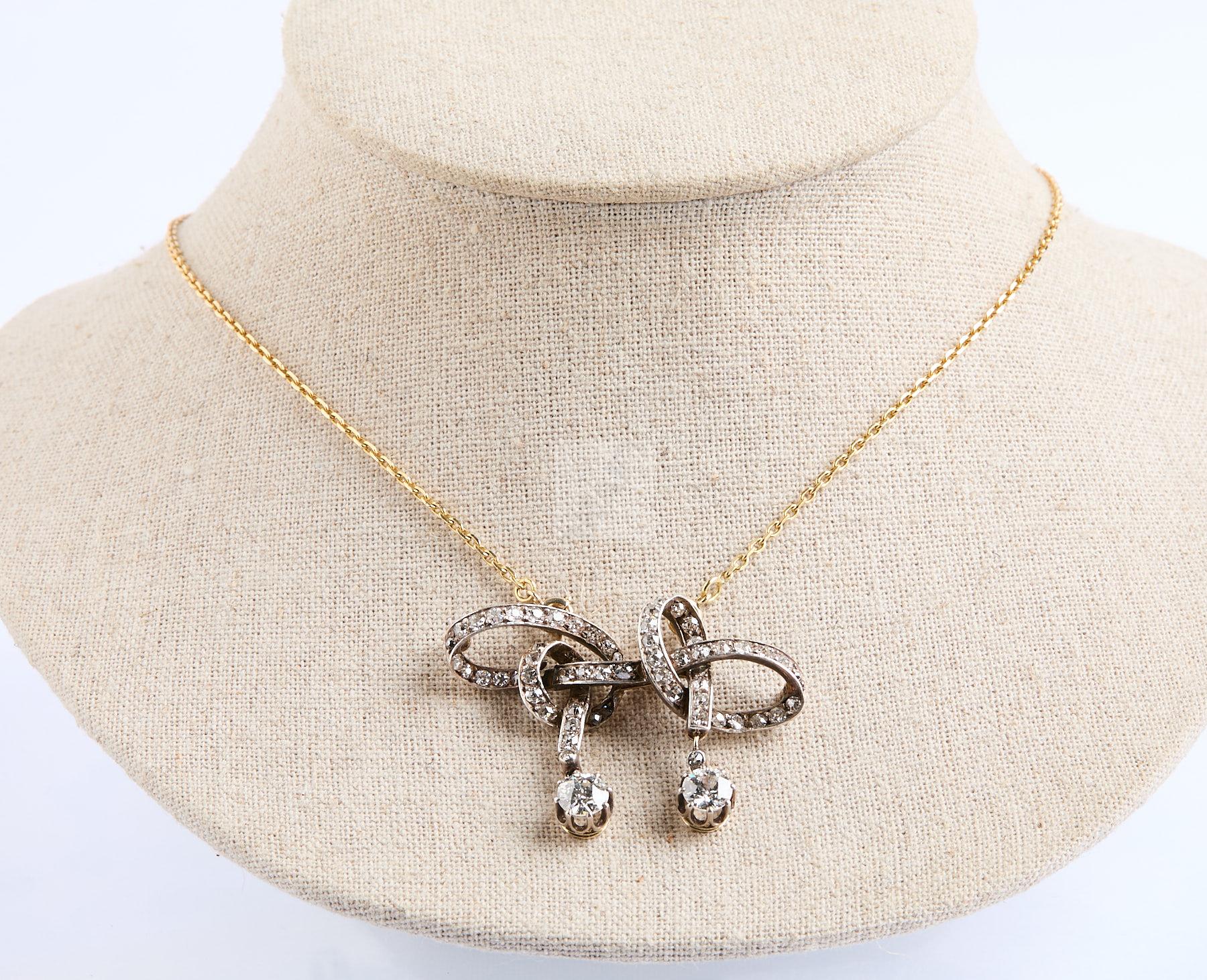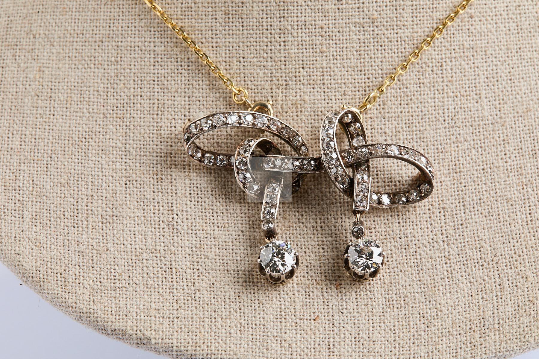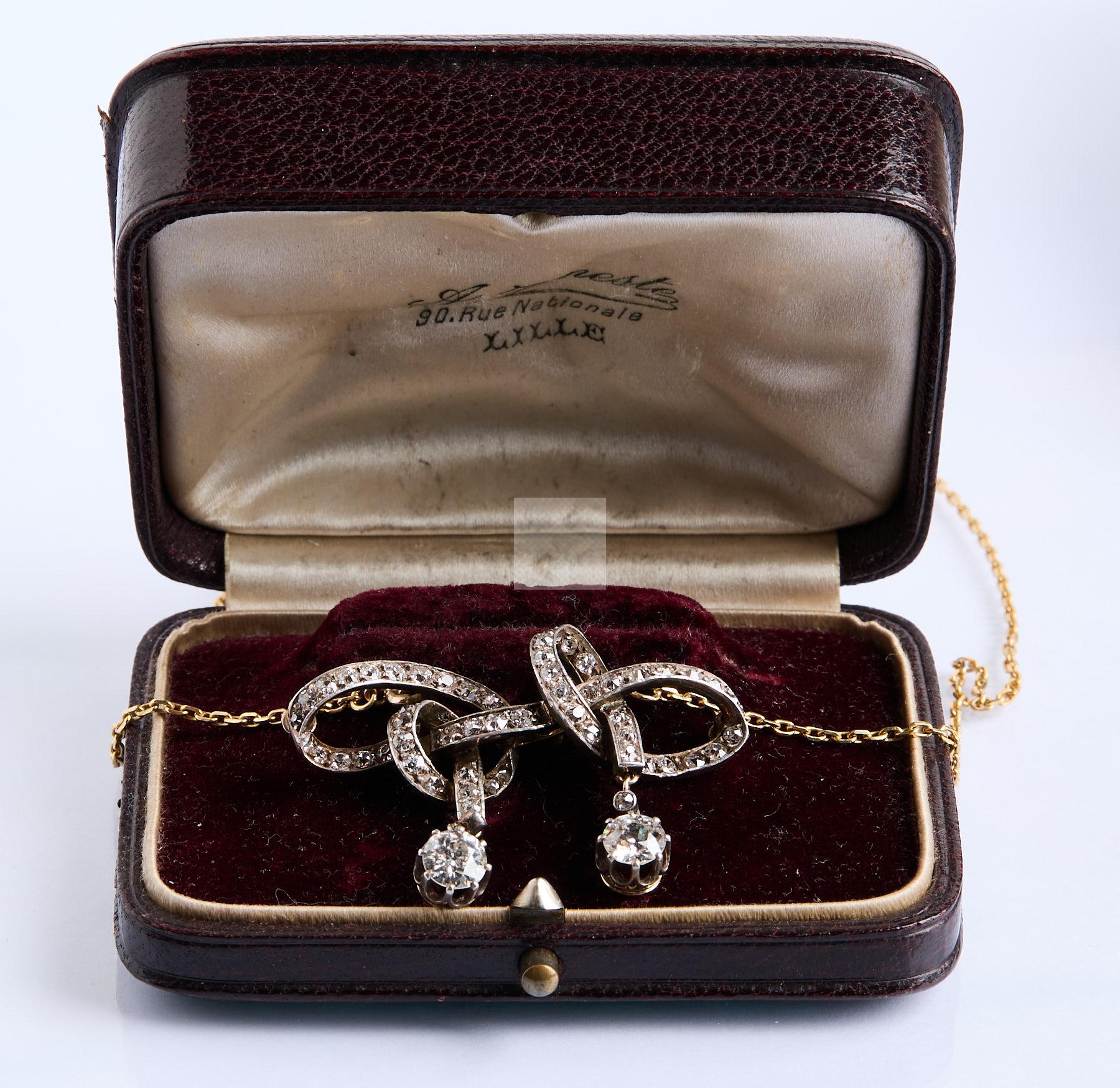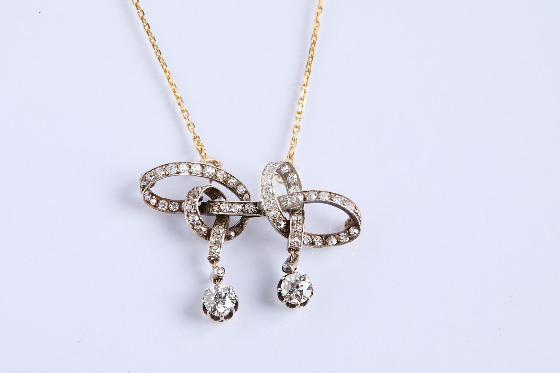 301 Collier en or et son motif argent et vermeil à nœud et deux pampilles de diamants de 0,50 ct chaque , N° 11038, (manque le système d’épingle) dans son écrin de Vaneste, vers 1880 – 1900, poids de la chaine 4 g poids brut 13, g 1722